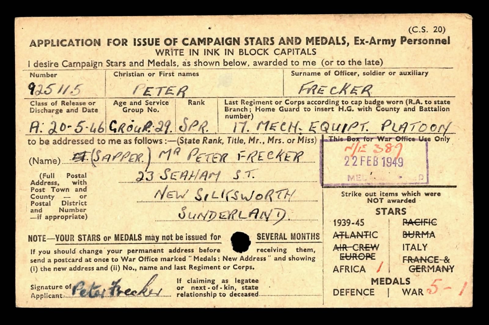 Frecker served throughout the later stages of the war and was discharged on 20th May 1946, receiving a Class “A” release following the end of hostilities. His medals were issued on 22nd February 1949, with his recorded address at that time being 23 Seaham Street, New Silksworth, Sunderland.