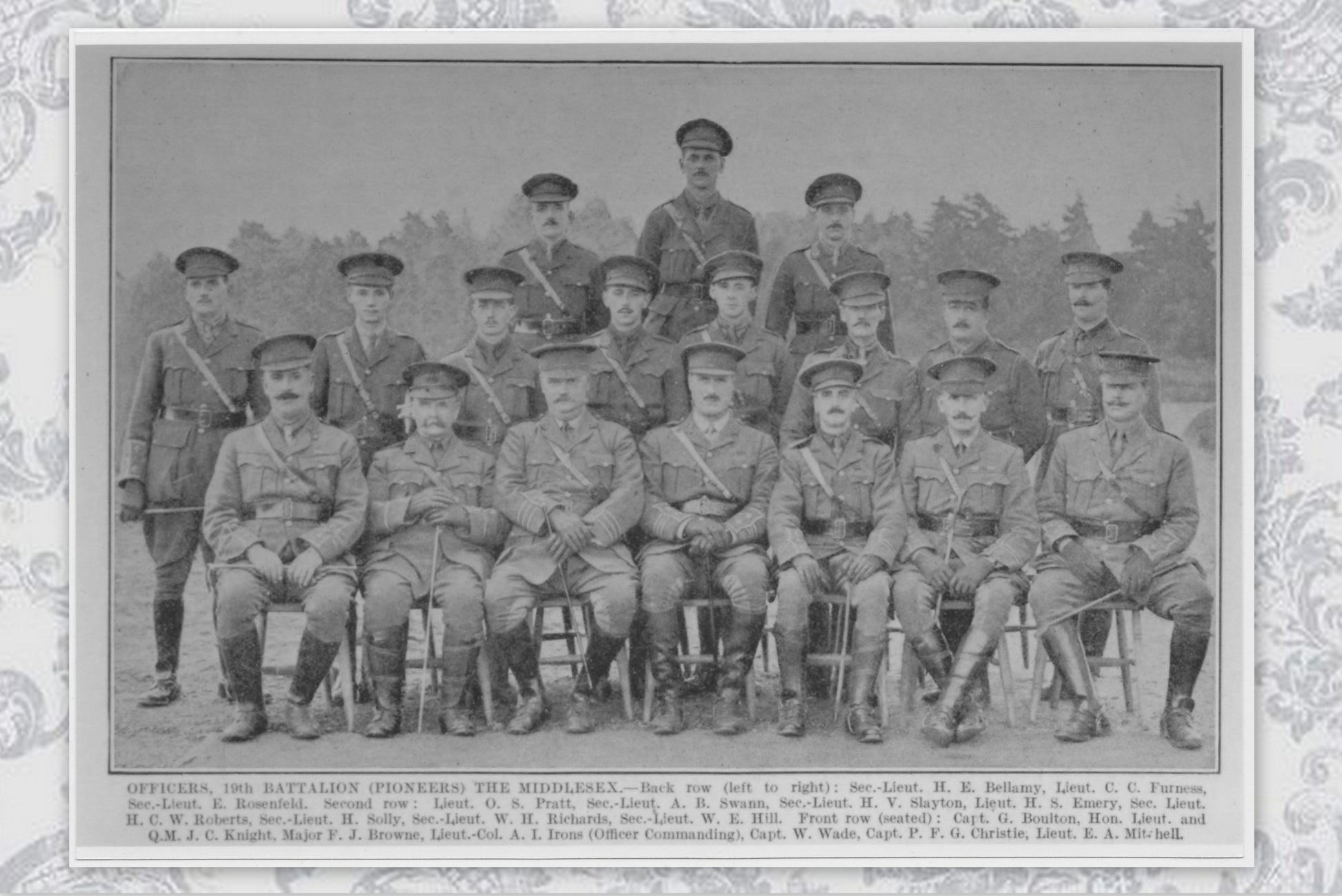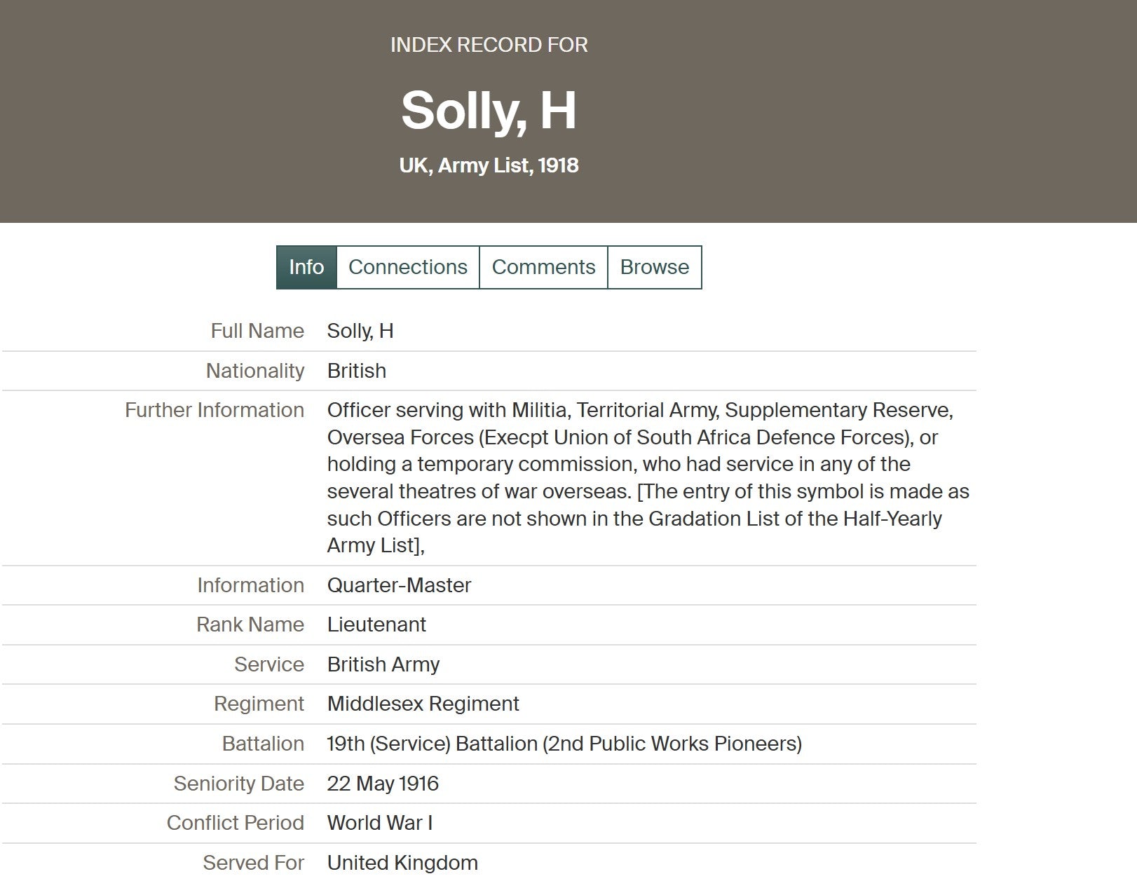 Honorary Captain and Quartermaster Henry Solly served with the 19th (Service) Battalion, Middlesex Regiment (2nd Public Works Pioneers) during the Great War. A long-serving soldier, he had previously completed service in the Regular Army before being granted a commission in April 1915, later holding the rank of Lieutenant and Quartermaster, and subsequently Honorary Captain.