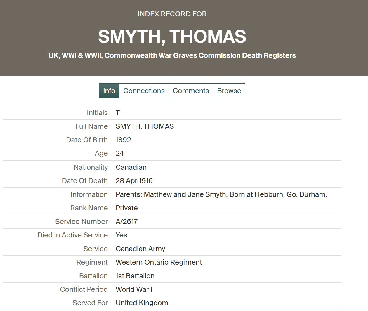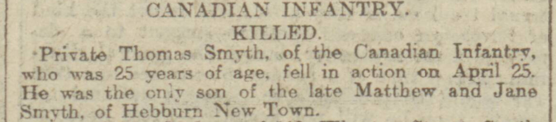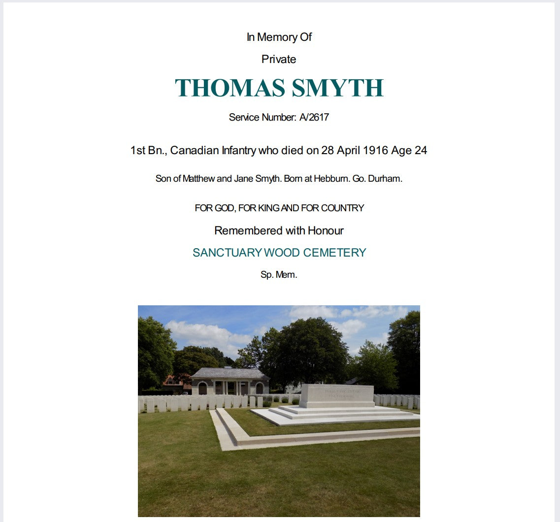 On 28 April 1916, aged 24, Private Thomas Smyth was killed in action in the trenches near Mount Sorrel, Belgium. He is buried in Sanctuary Wood Cemetery, Belgium, Special Memorial. His headstone bears the inscription: “FOR GOD, FOR KING AND FOR COUNTRY.”