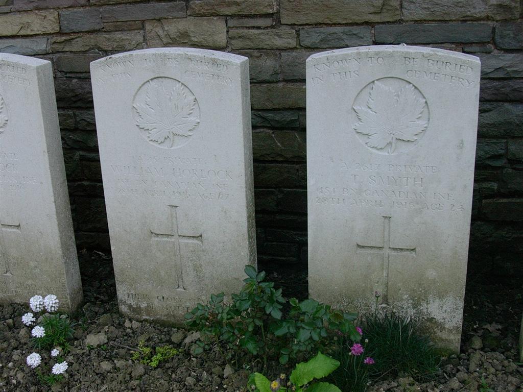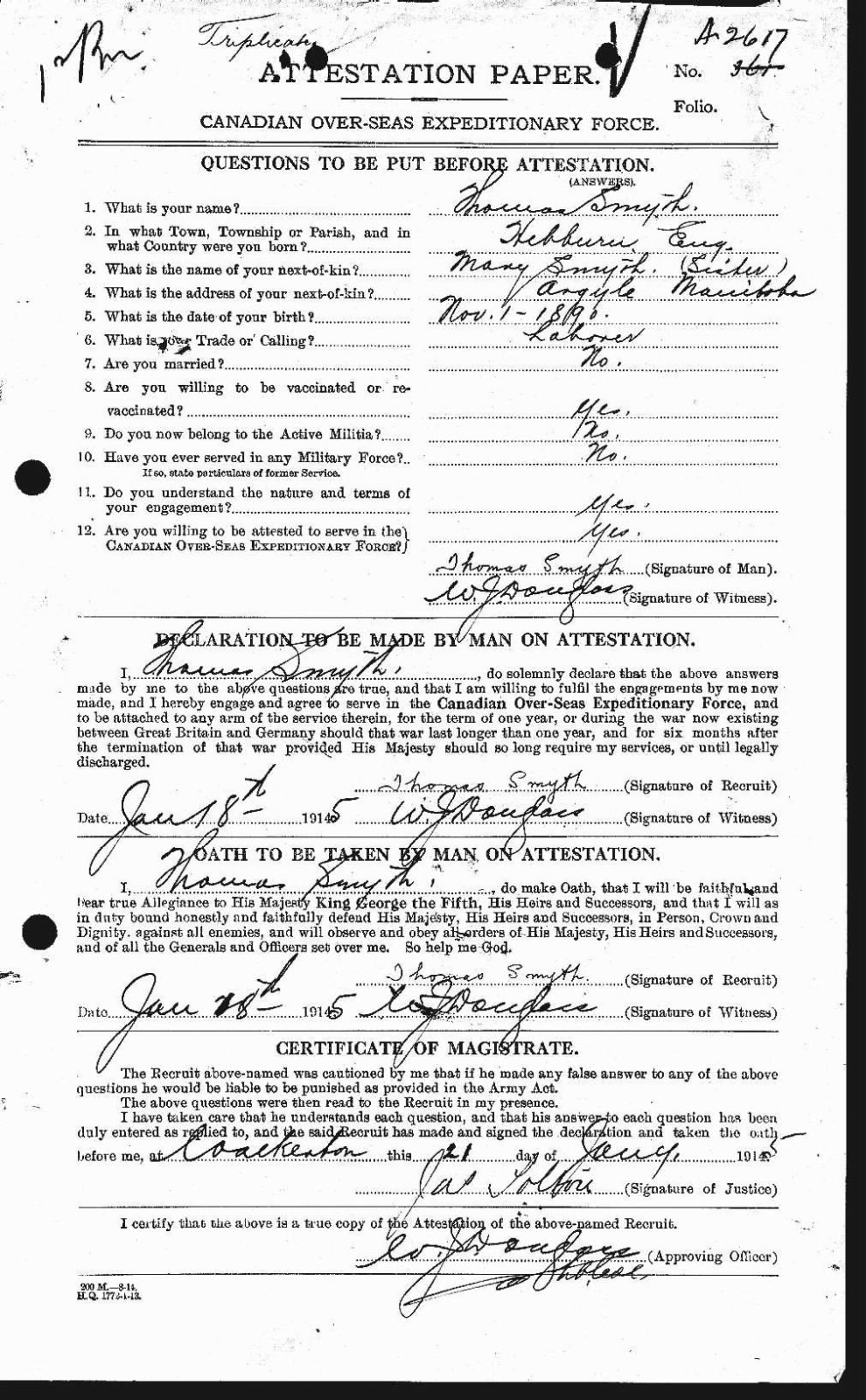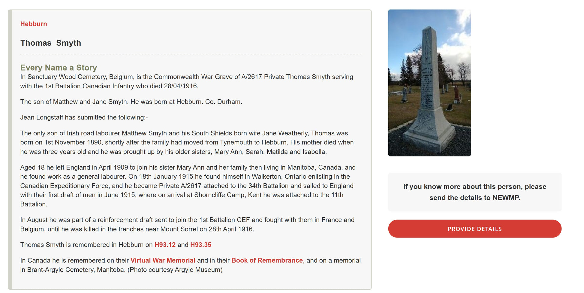 On 28 April 1916, aged 24, Private Thomas Smyth was killed in action in the trenches near Mount Sorrel, Belgium. He is buried in Sanctuary Wood Cemetery, Belgium, Special Memorial. His headstone bears the inscription: “FOR GOD, FOR KING AND FOR COUNTRY.”