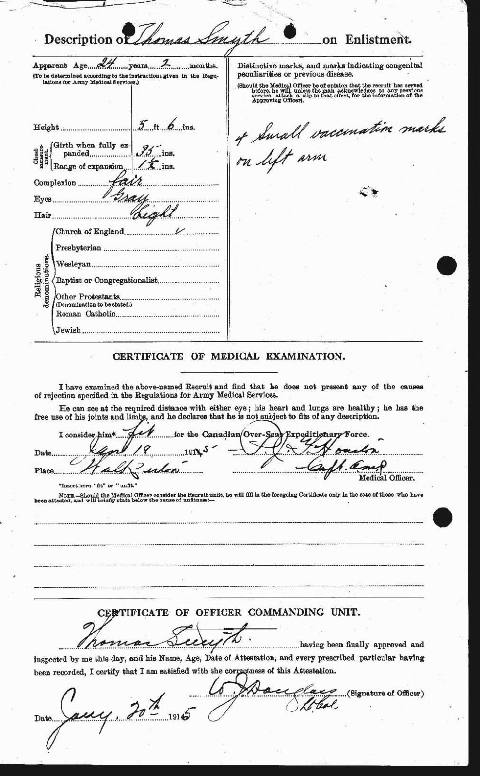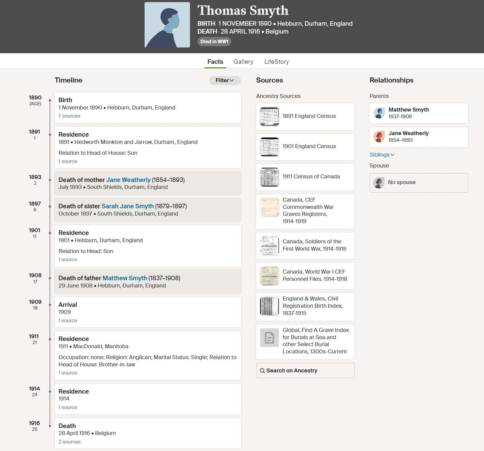 At the time of the 1891 Census the family were residing in the Hebburn district of County Durham. By 1901 he was still living in Hebburn. His father, Matthew Smyth, died on 29 June 1908, leaving Thomas effectively orphaned before reaching adulthood.