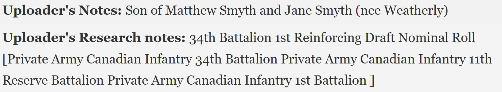 On 18 January 1915, at Walkerton, Ontario, he enlisted in the Canadian Expeditionary Force. He was assigned service number A/2617 and initially attached to the 34th Battalion, Canadian Infantry. Sailing to England with the battalion’s first draft in June 1915, he arrived at Shorncliffe Camp, Kent, where he was posted to the 11th Reserve Battalion.
