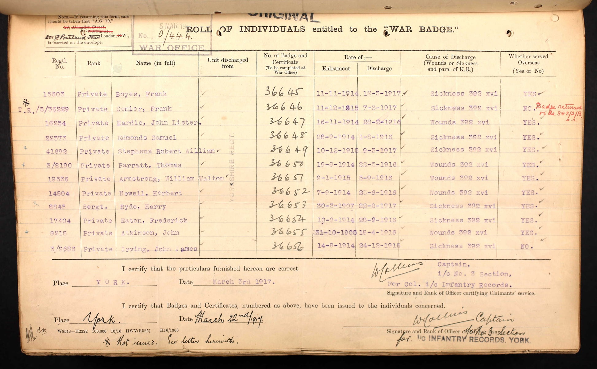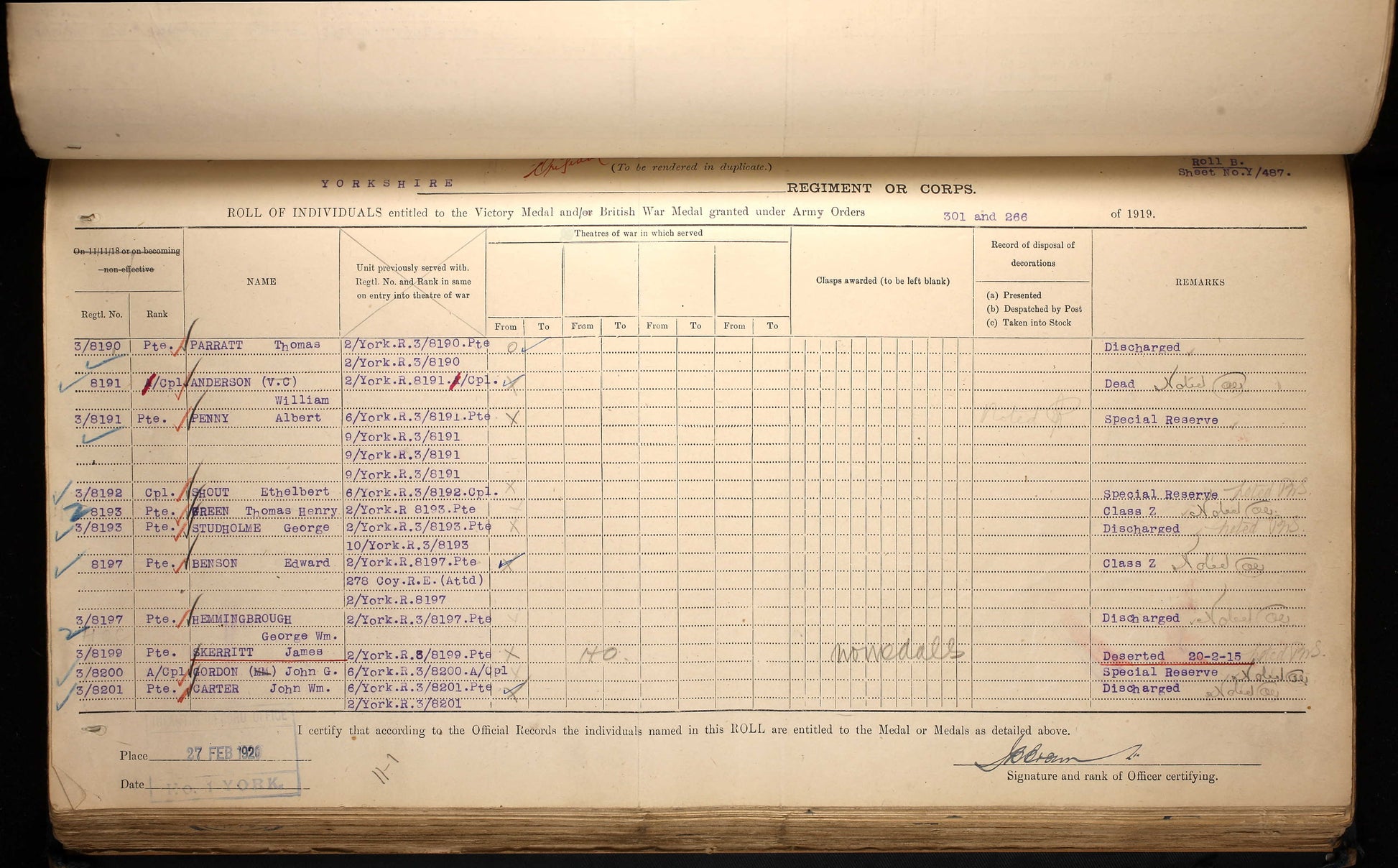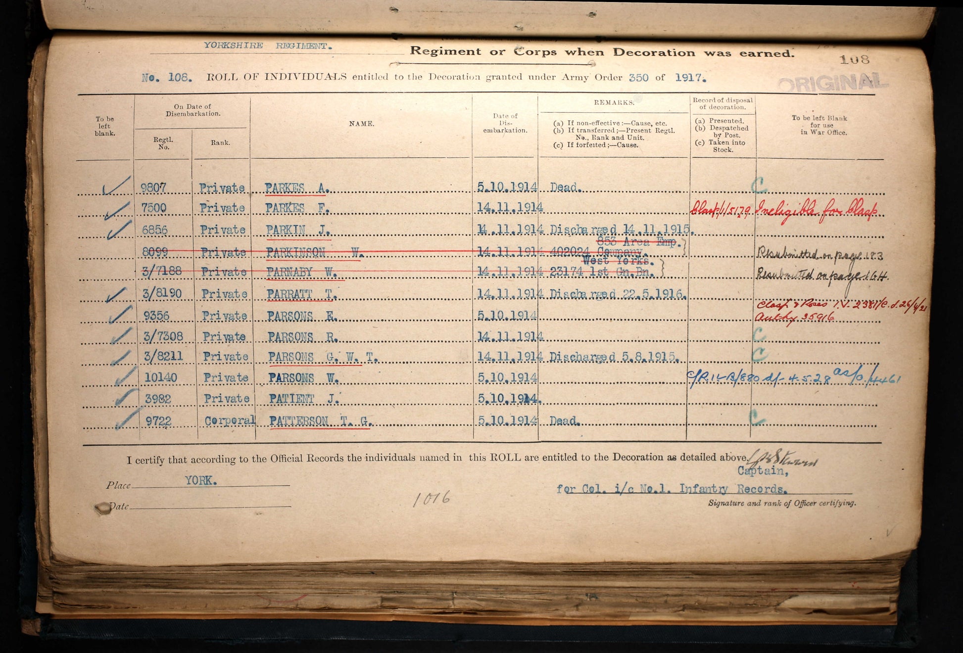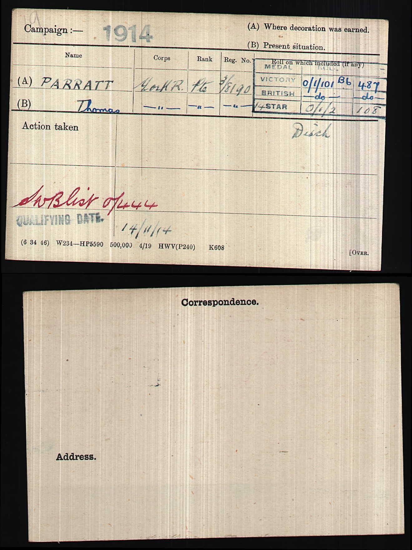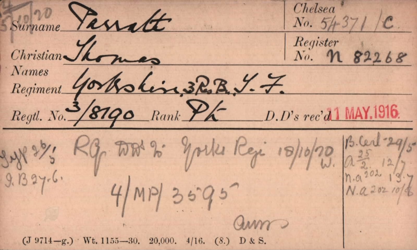 Thomas Parratt’s service represents that of an early-war Regular soldier of the Yorkshire Regiment, deployed to France in November 1914 and ultimately discharged as a result of wounds sustained during the hard fighting of the war’s opening campaigns.