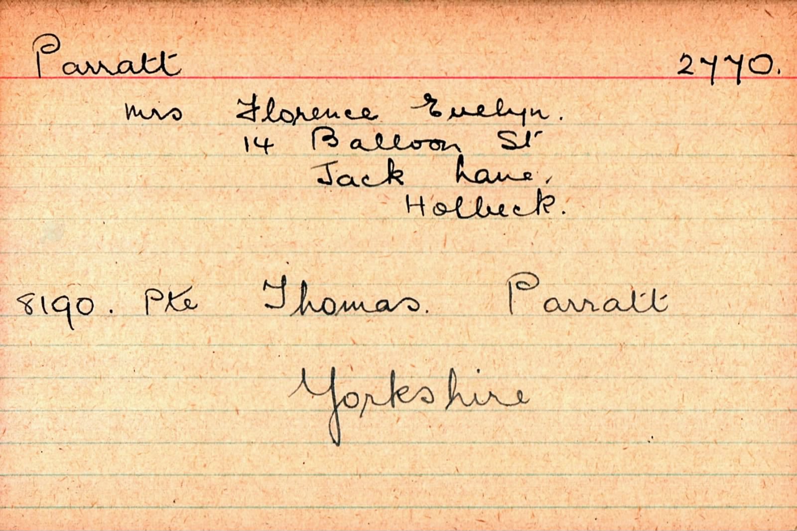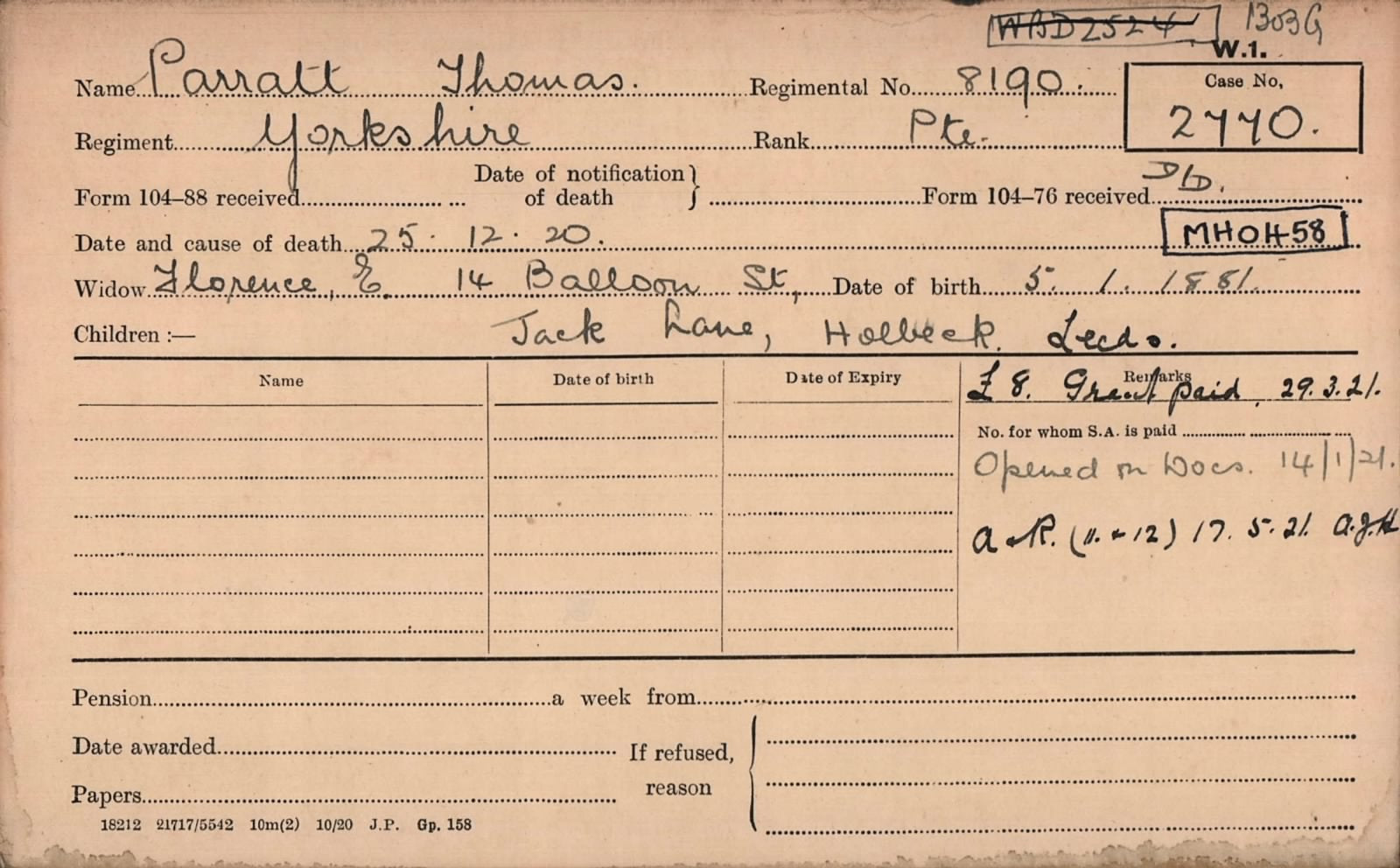 He returned to civilian life in Yorkshire, where he remained with his family. Thomas Parratt died on 25 December 1920, aged approximately 39.