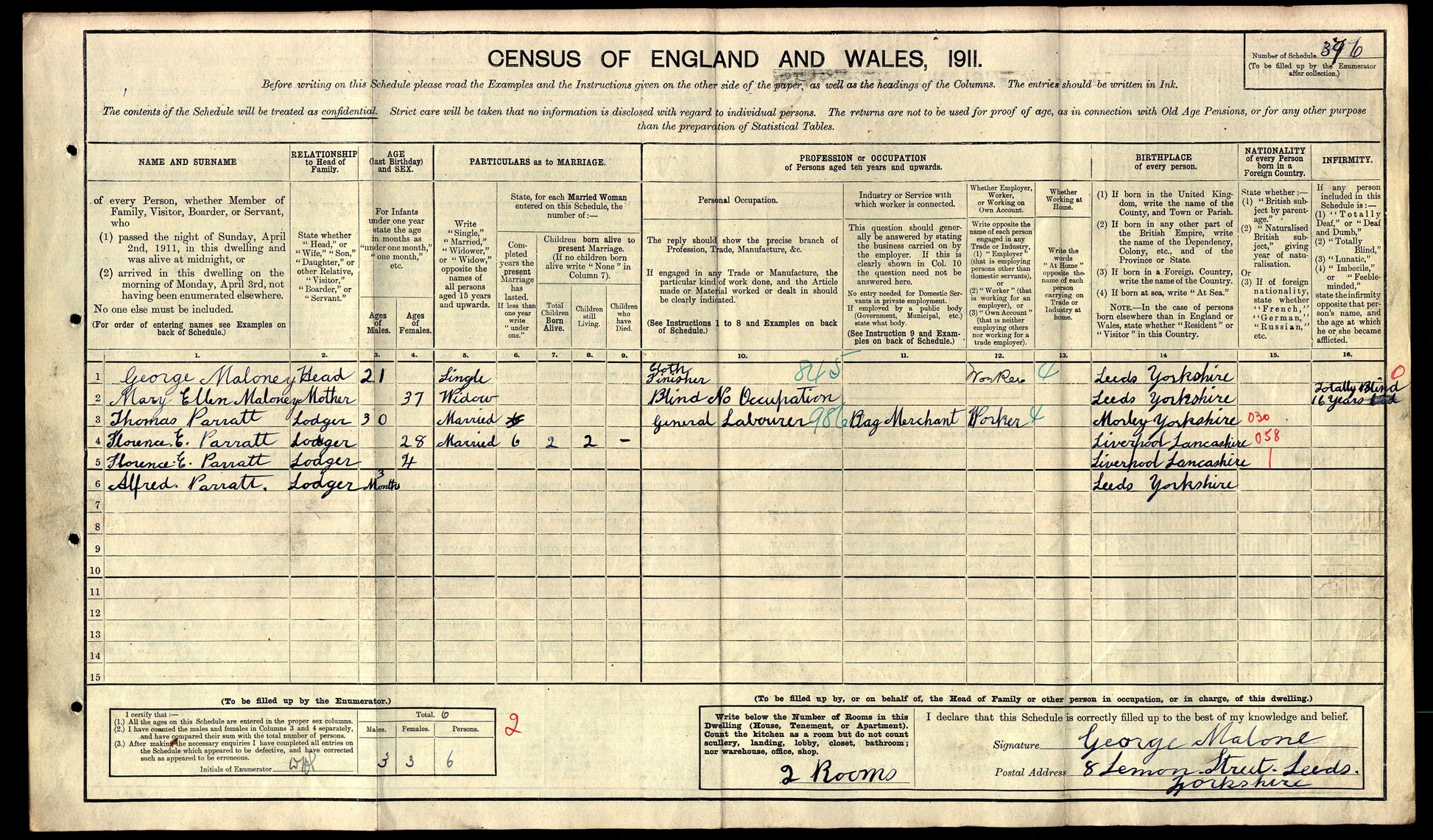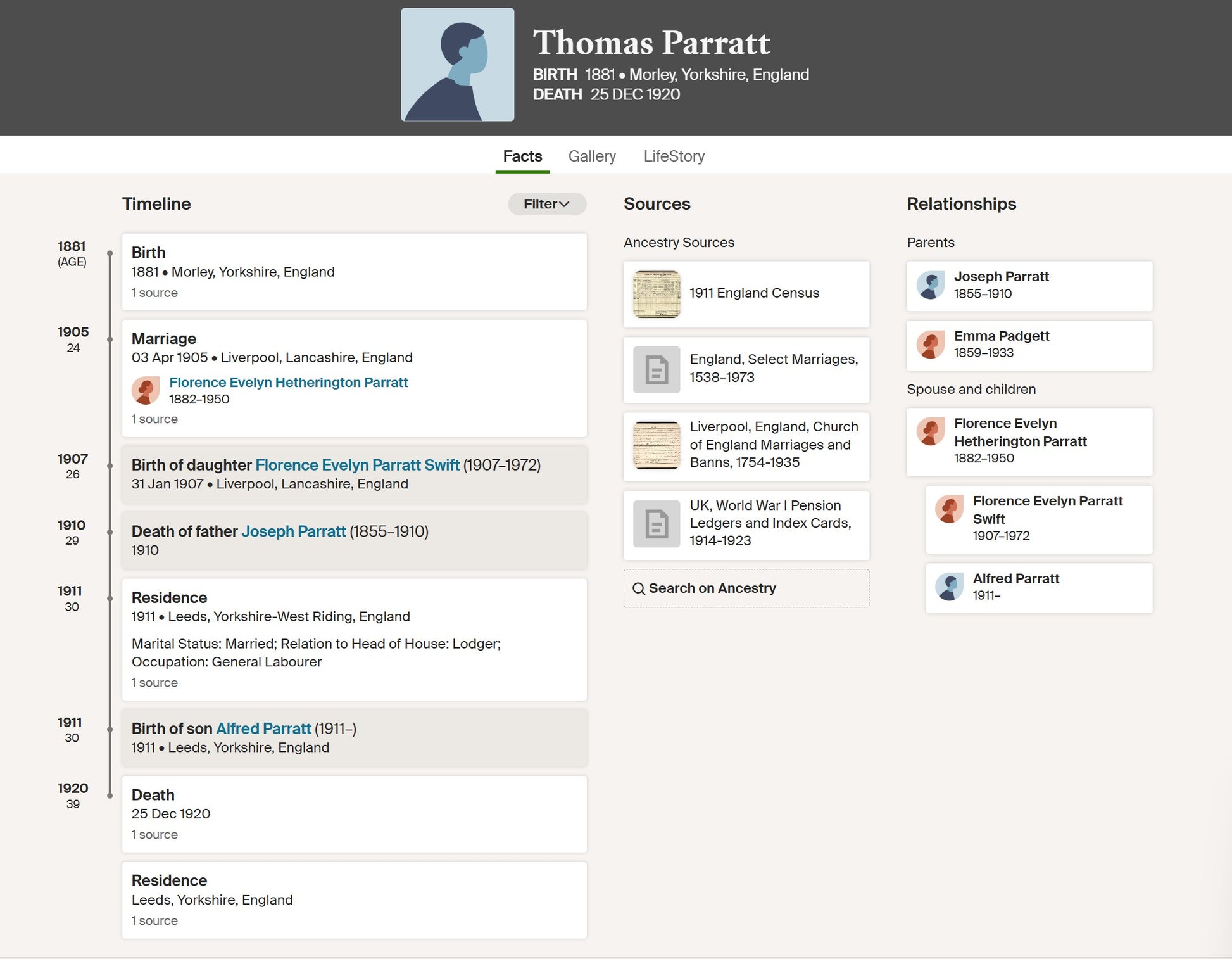 On 3 April 1905, he married Florence Evelyn Hetherington at Liverpool. By the time of the 1911 Census, Thomas was residing in Leeds, West Riding of Yorkshire, recorded as married and employed as a general labourer. That same year their son, Alfred Parratt, was born in Leeds.