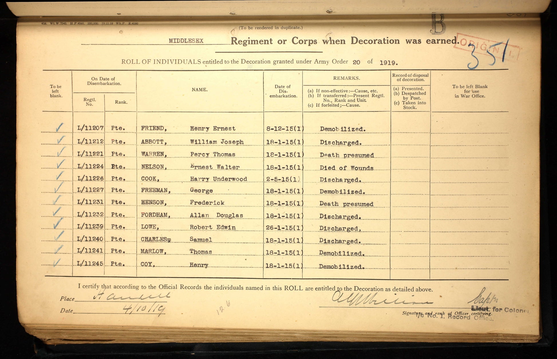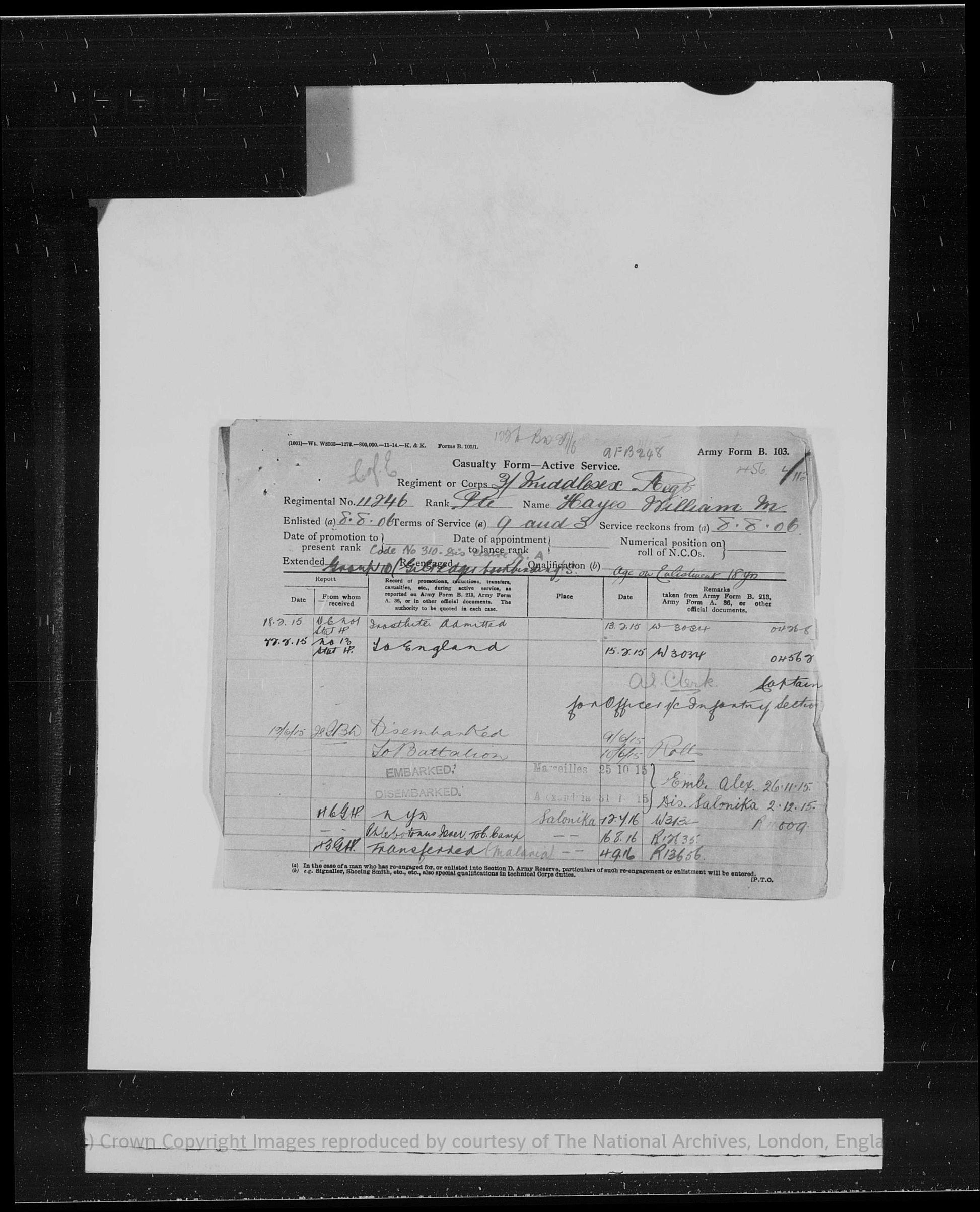 At the outbreak of the Great War he remained with the Middlesex Regiment and proceeded overseas, landing in France on 18th January 1915. His discharge papers record active service as an infantryman in France during 1915, followed later the same year by service in the Balkans theatre, reflecting the regiment’s deployment beyond the Western Front. During his wartime service he was promoted to the rank of Sergeant, indicating seniority and experience built up over nearly a decade of prior enlistment.