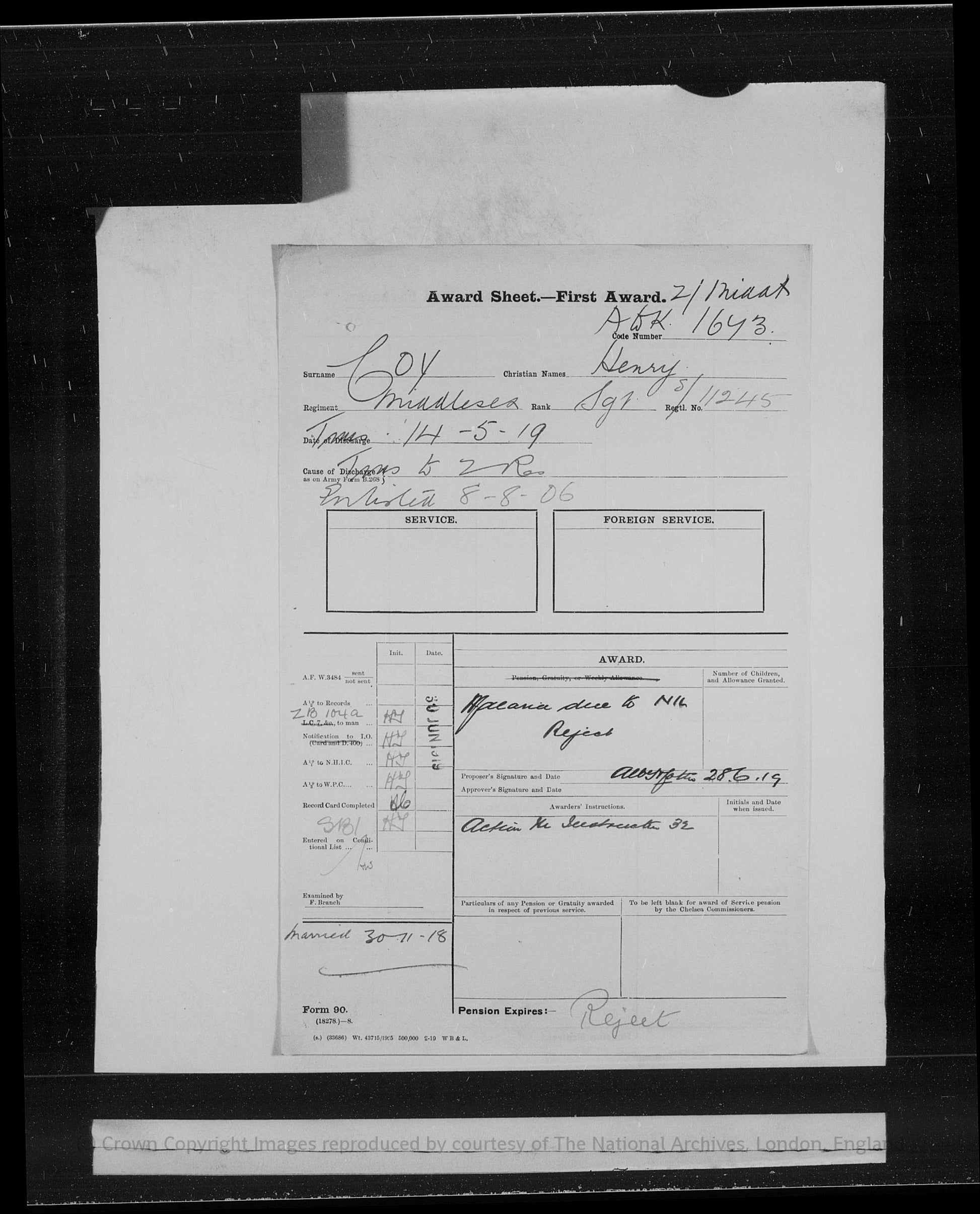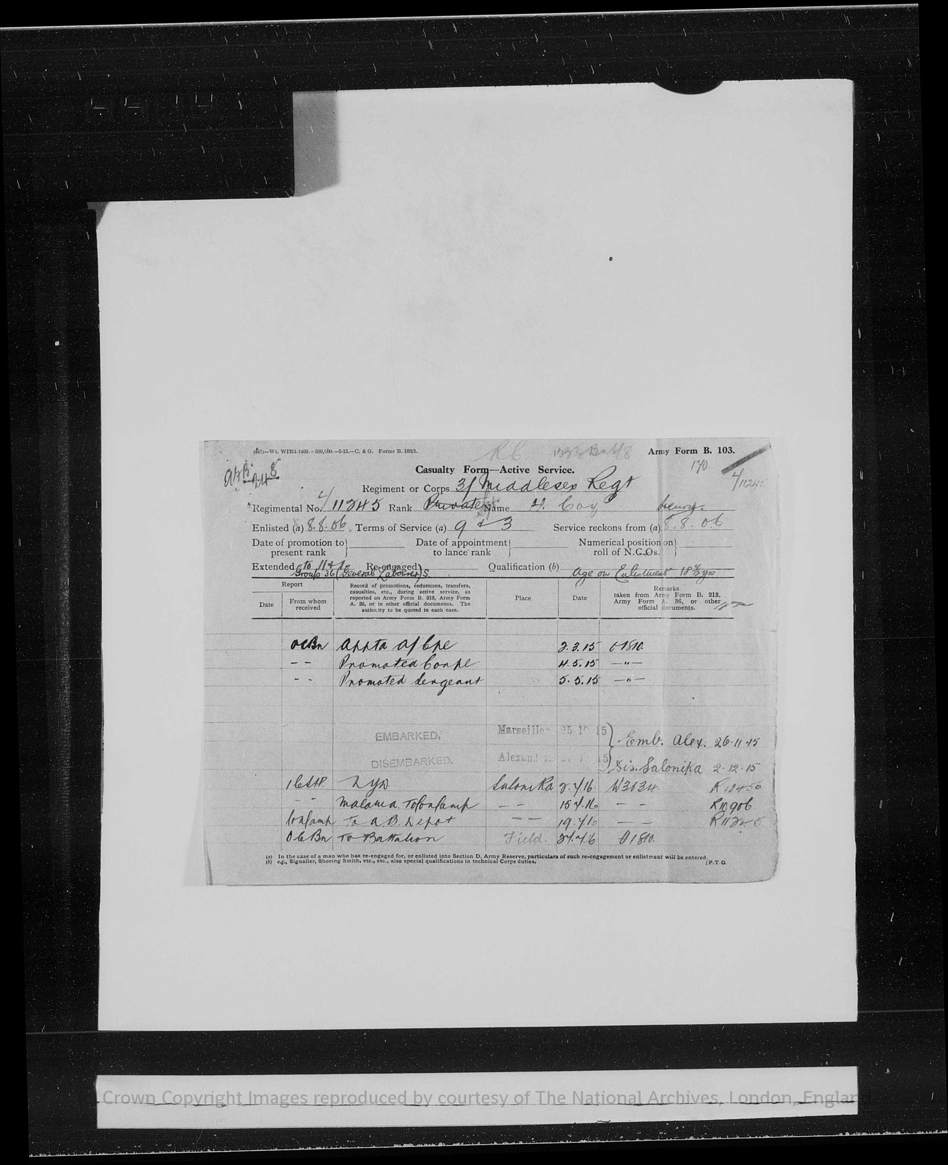 Sergeant Coy survived the Great War and was eventually discharged from the Army following the conclusion of his service. His long period of pre-war regular soldiering, combined with wartime service in both France and the Balkans, marks him as an experienced infantryman whose military career spanned home service, imperial garrisons, and active operations during the First World War.
