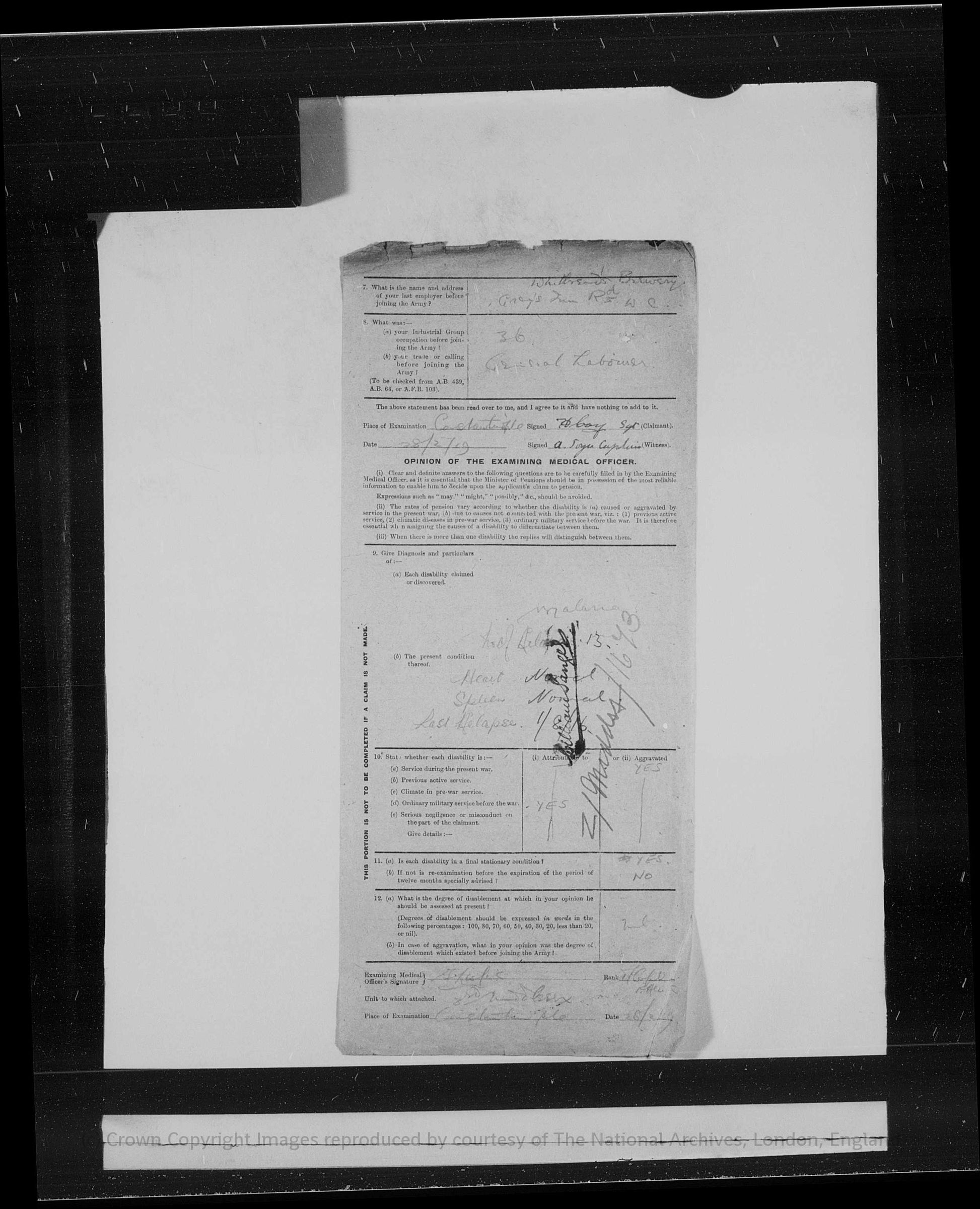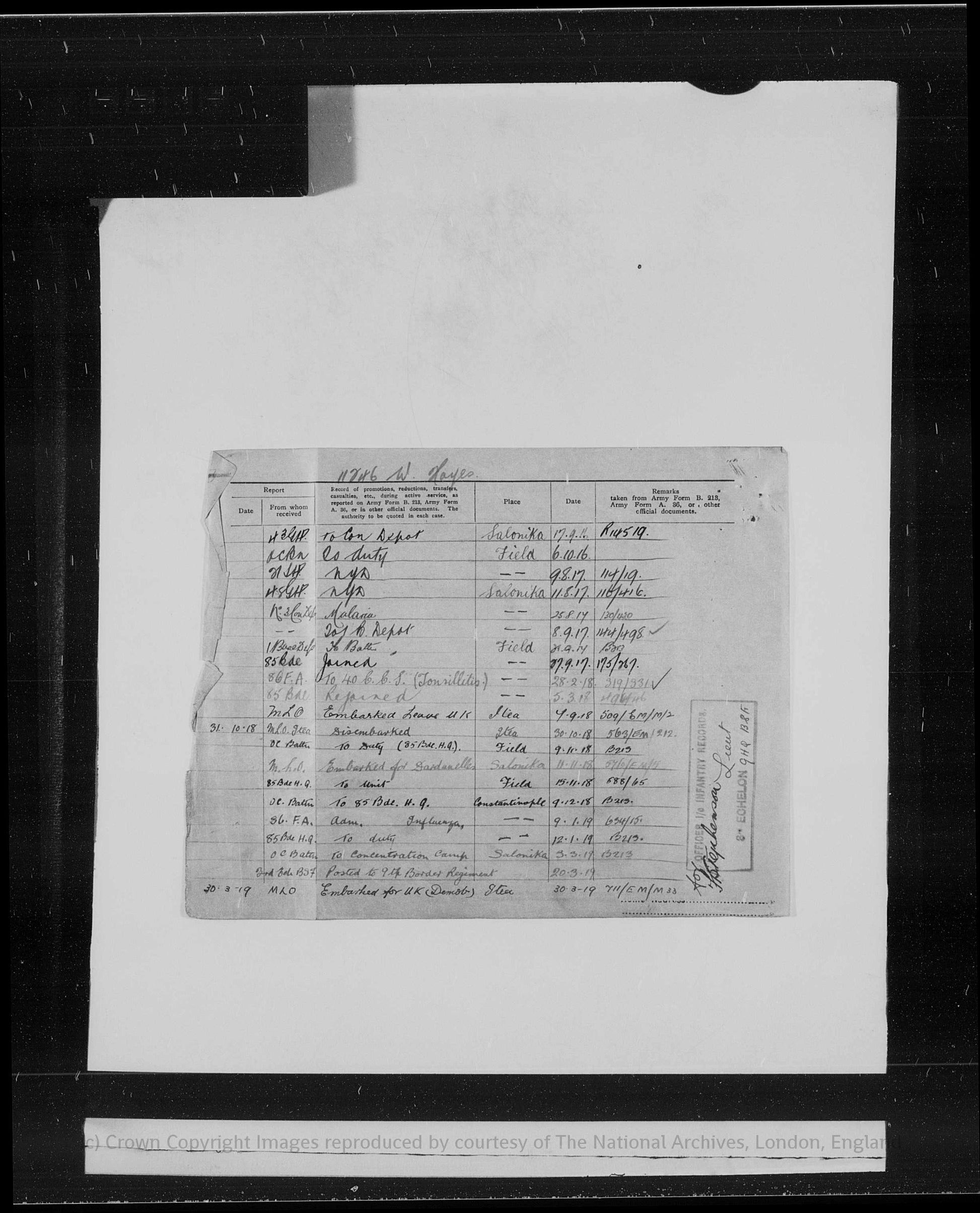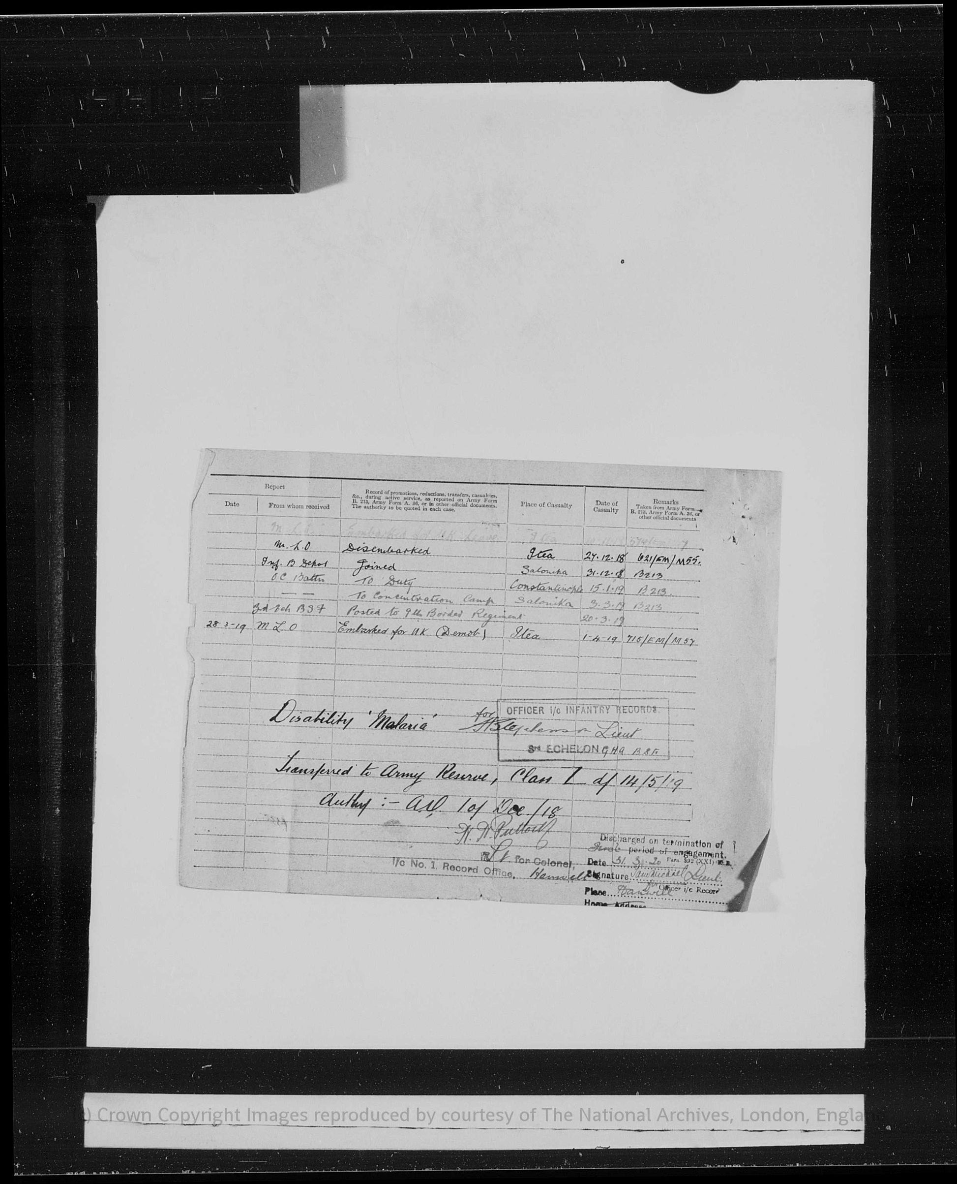 While serving overseas he contracted malaria, an illness consistent with service in the Balkan and eastern theatres, and this is specifically noted within his service record. Despite this, he continued to serve until the later stages of the war.