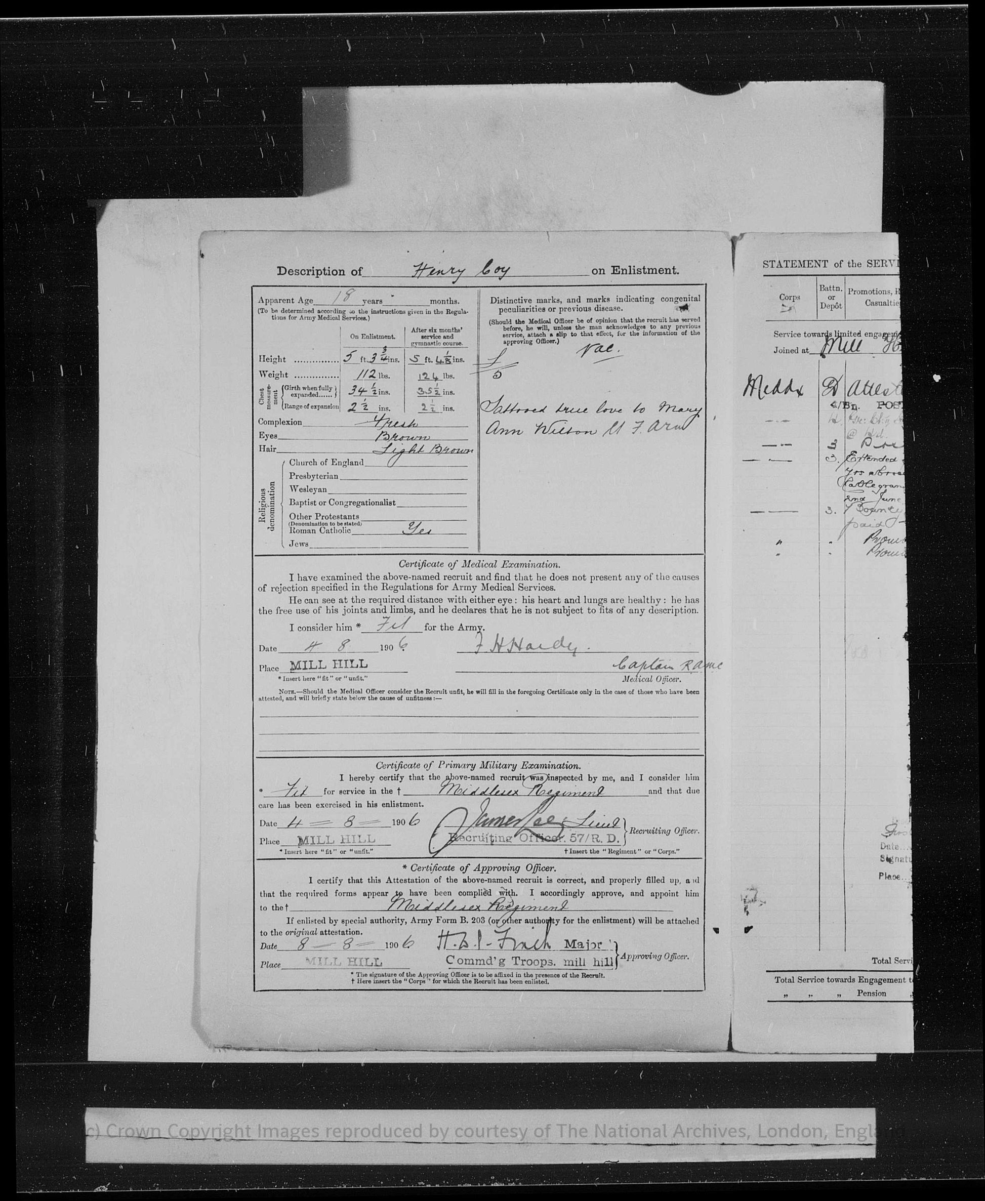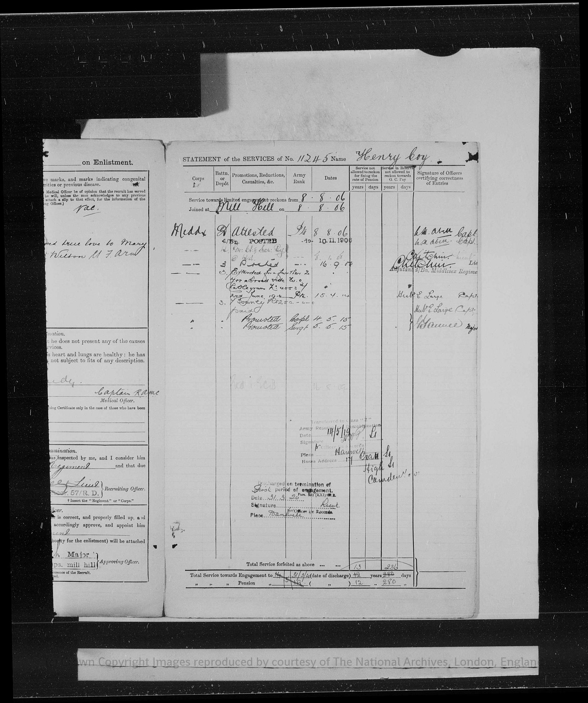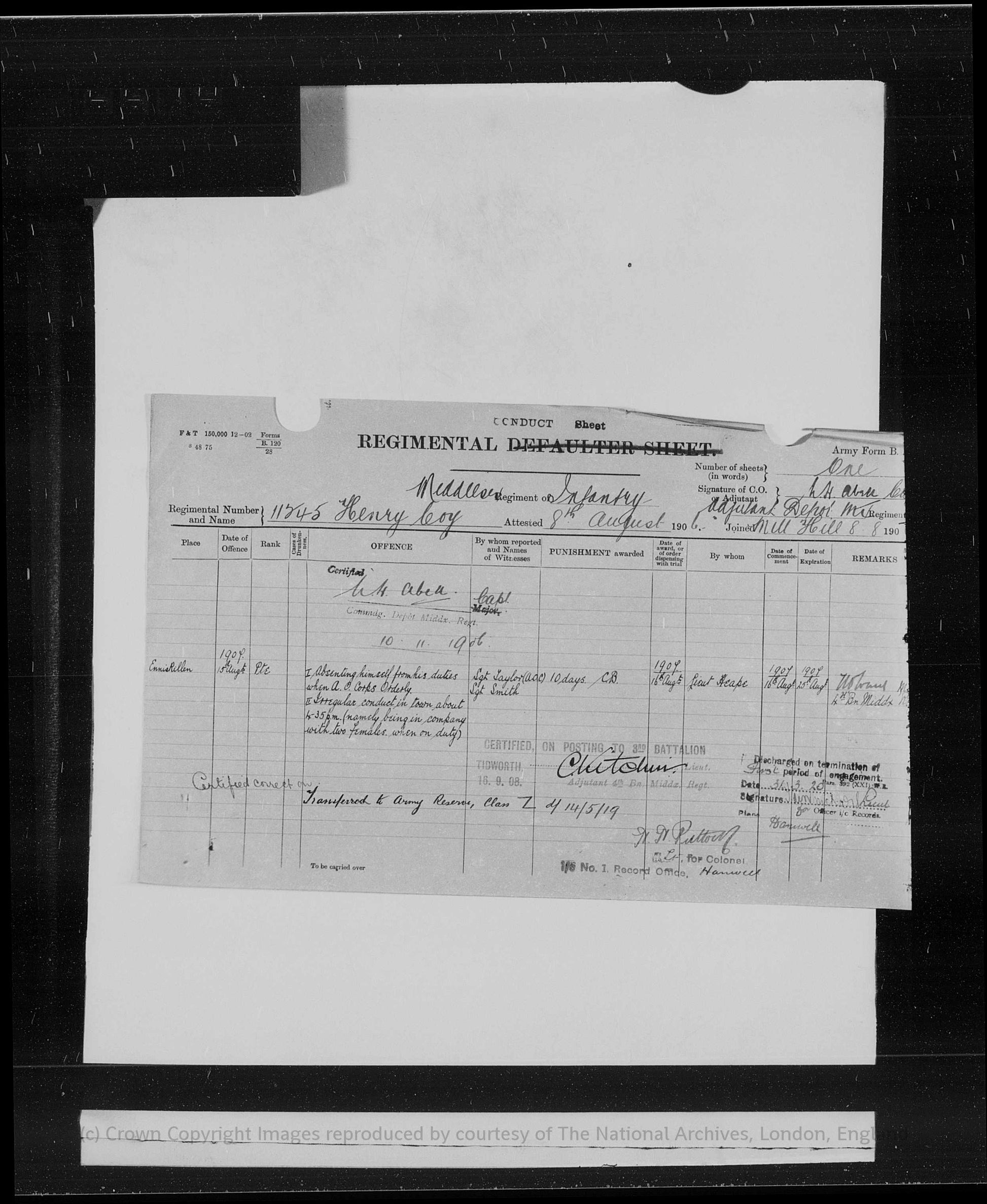 He enlisted on 4th August 1906, aged 18, and joined the Middlesex Regiment, his attestation papers noting previous service with the 5th Battalion, Middlesex Regiment. In the early years of his service he was stationed at Mill Hill and Londonderry during 1906, before being posted overseas. Between 1908 and 1910 he served at Tidworth and Singapore, and from 1910 until 1914 he was stationed in the East Indies, including a posting at Cawnpore, gaining extensive experience of overseas and tropical service prior to the war.