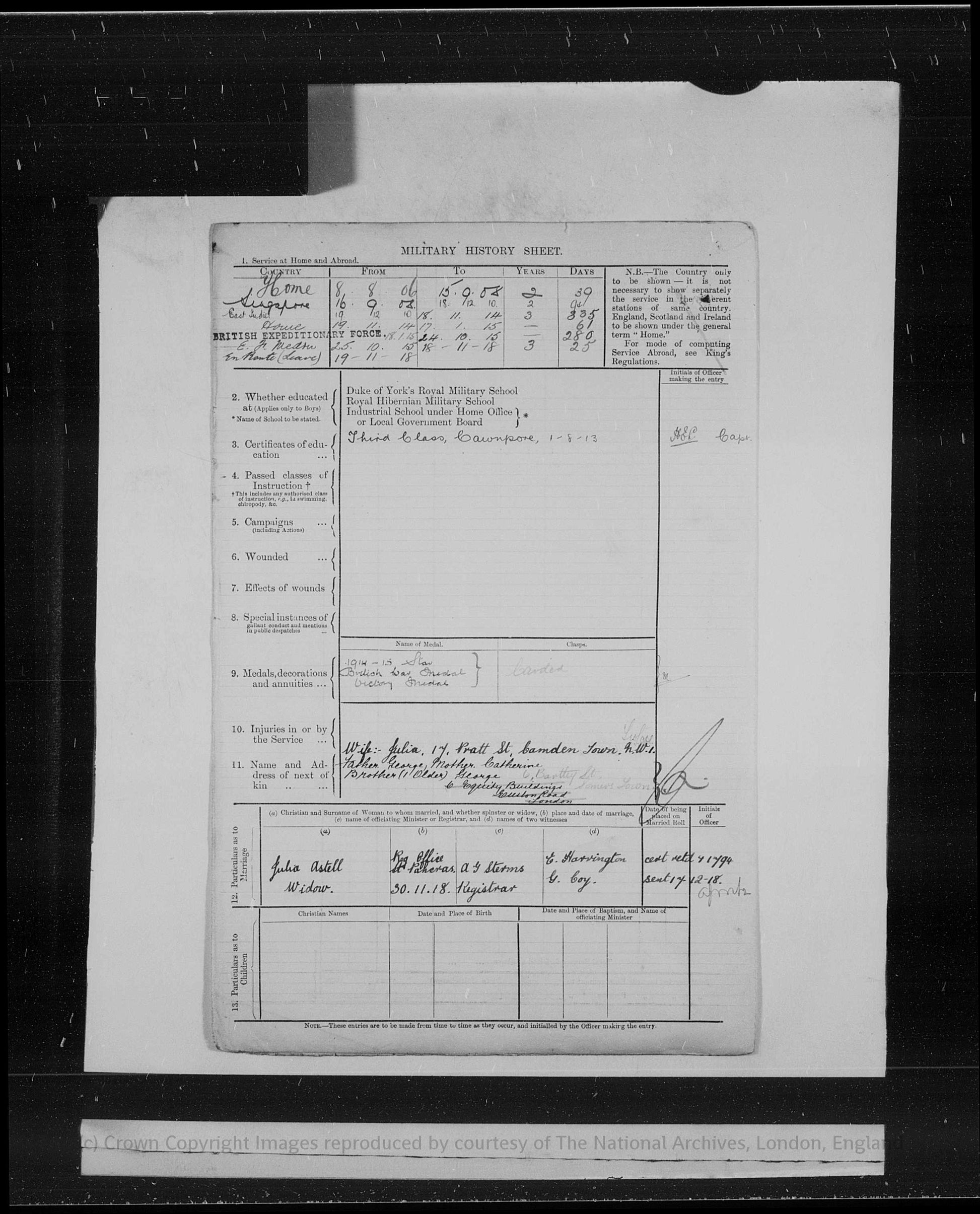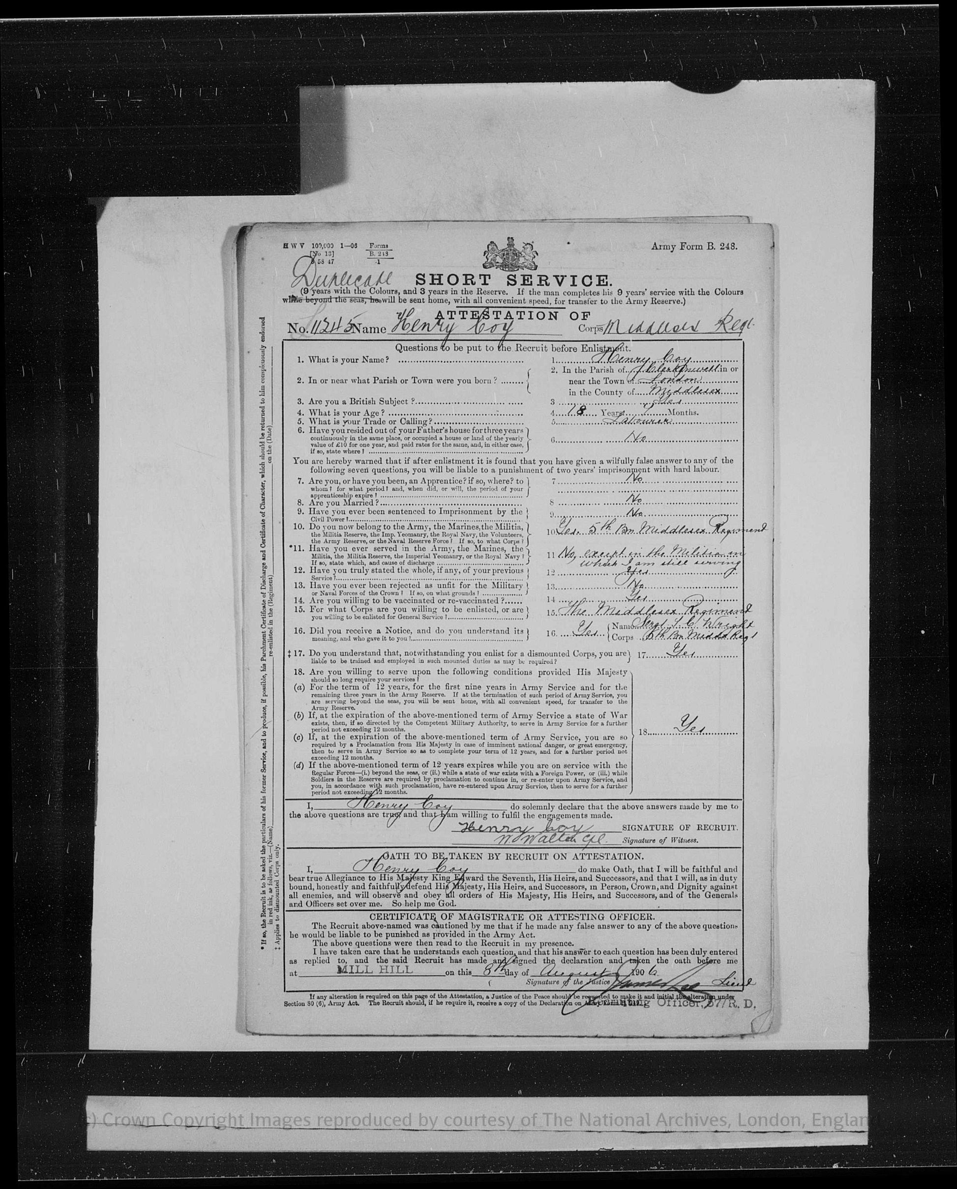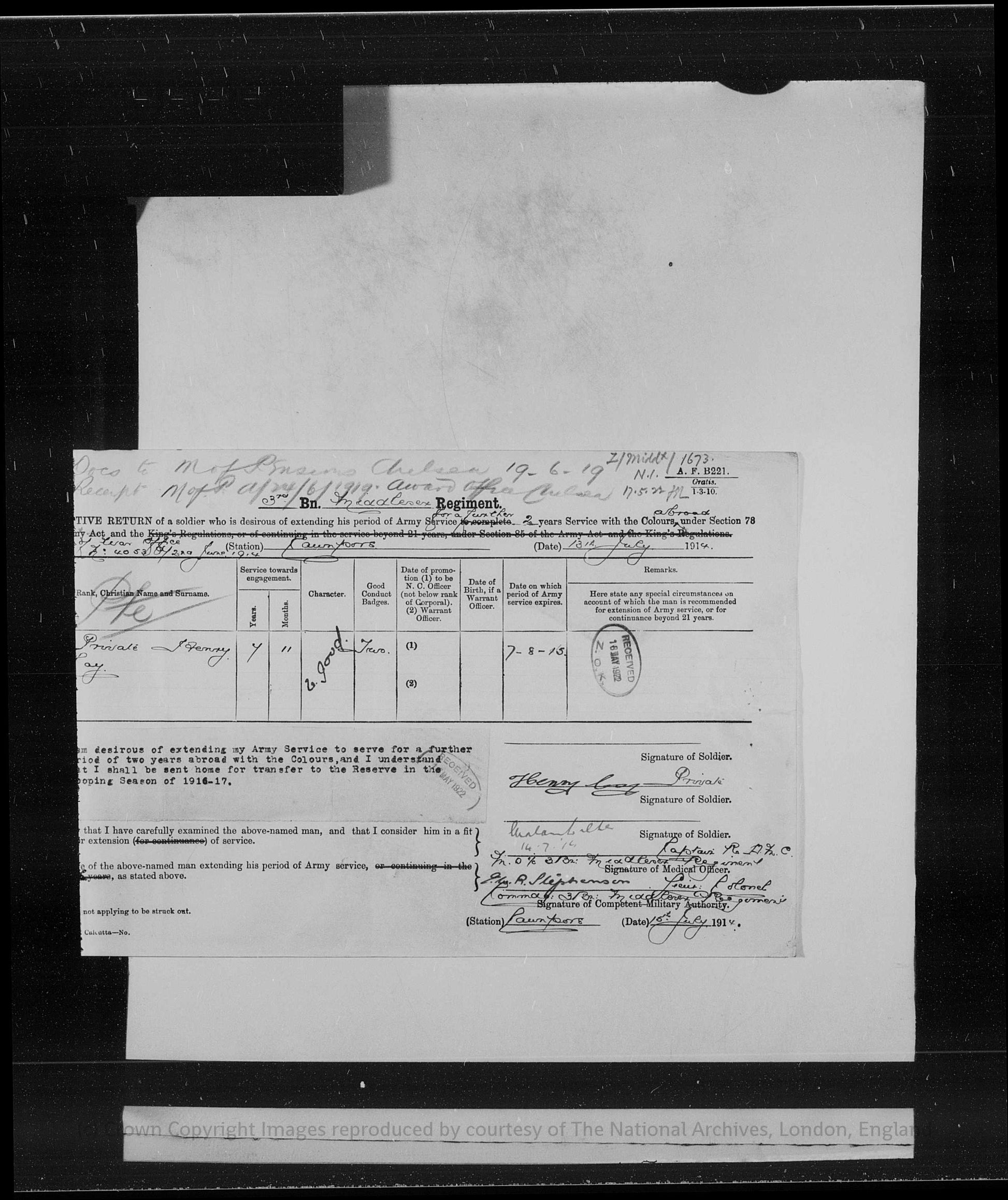 He enlisted on 4th August 1906, aged 18, and joined the Middlesex Regiment, his attestation papers noting previous service with the 5th Battalion, Middlesex Regiment. In the early years of his service he was stationed at Mill Hill and Londonderry during 1906, before being posted overseas. Between 1908 and 1910 he served at Tidworth and Singapore, and from 1910 until 1914 he was stationed in the East Indies, including a posting at Cawnpore, gaining extensive experience of overseas and tropical service prior to the war.