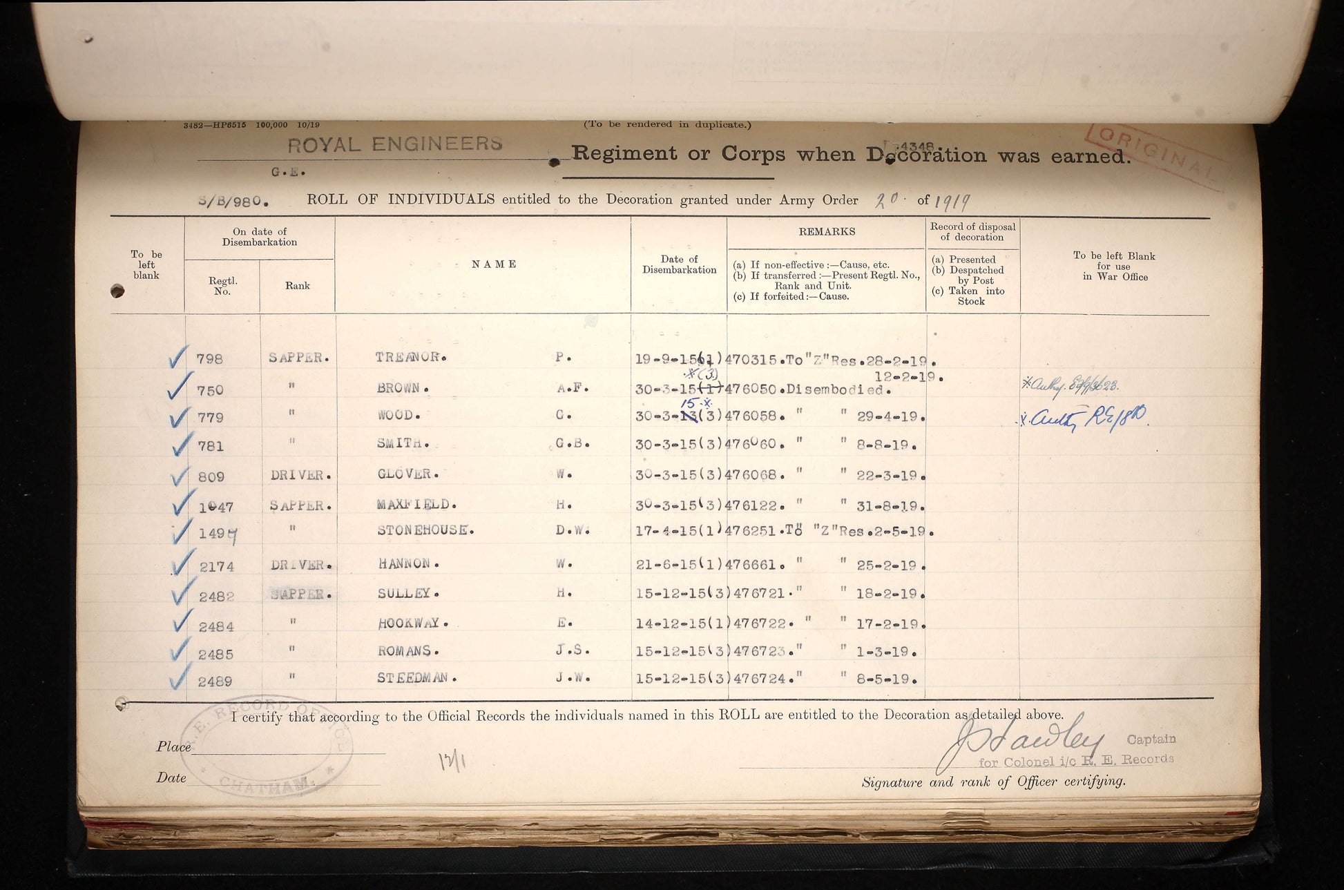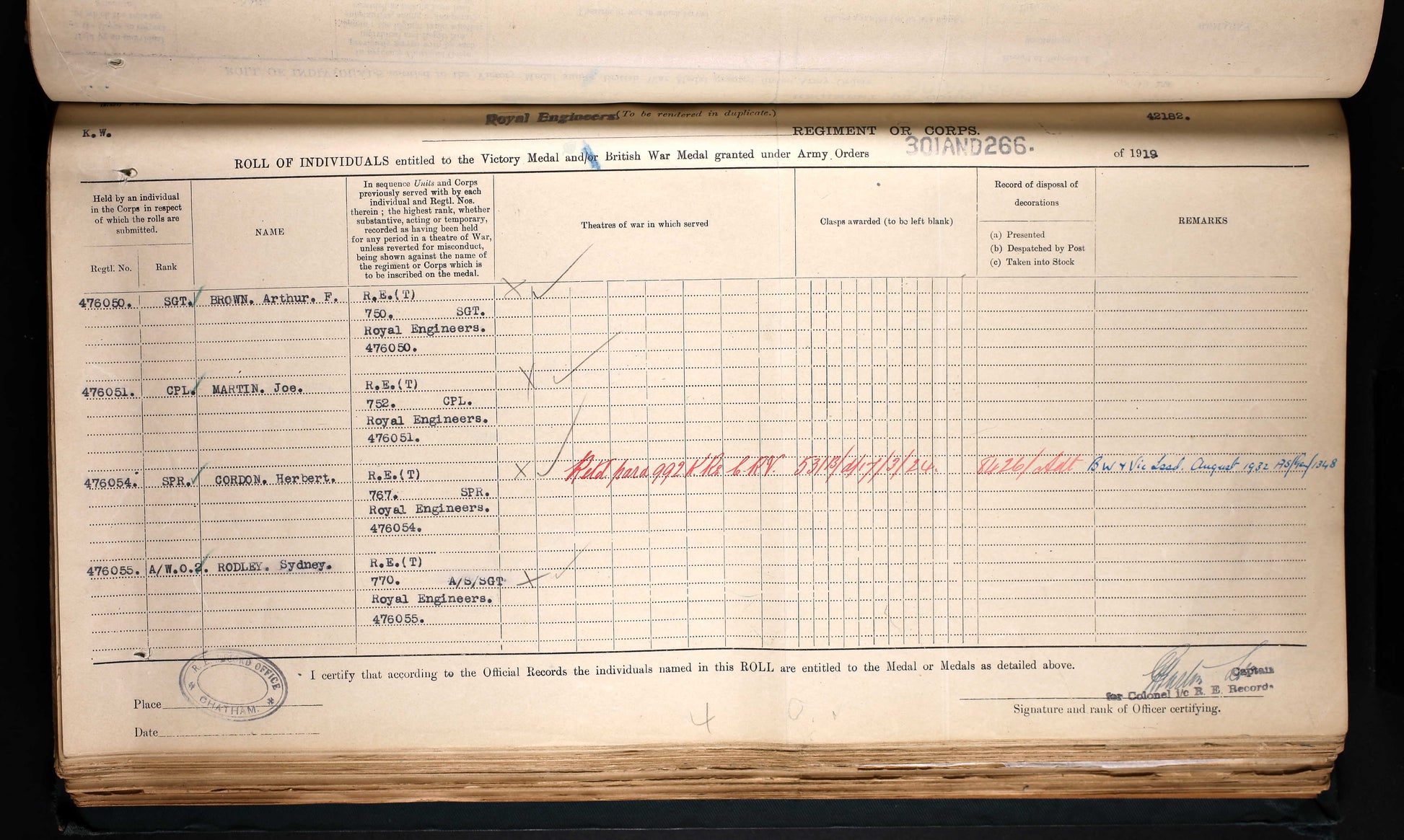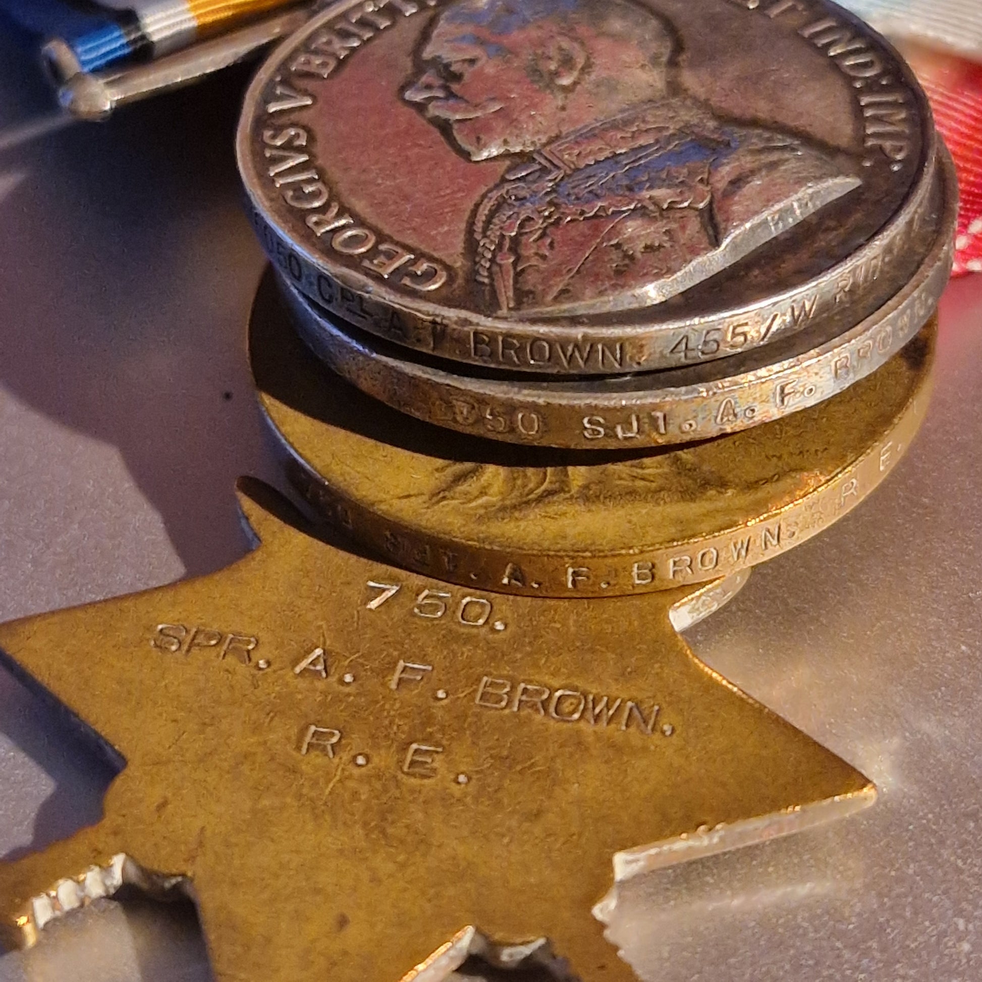 Military Medal - 476050 CPL A. BROWN. 455 / W. RID: F. COY R.E. - T.F. ('F.' scratched off due to error)