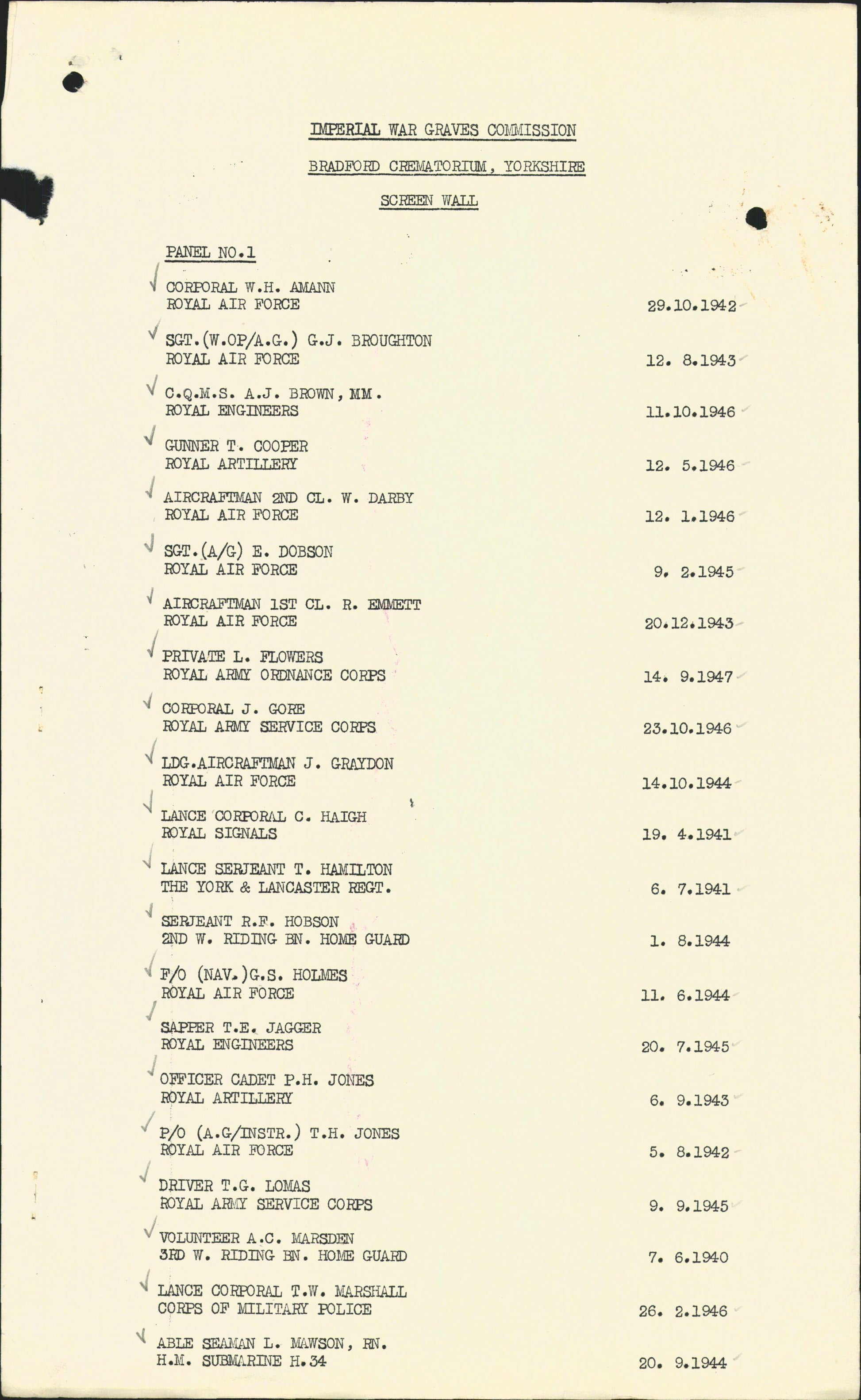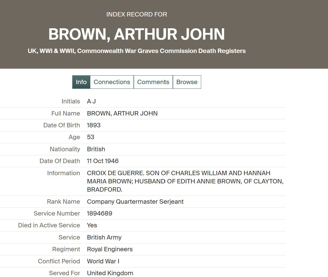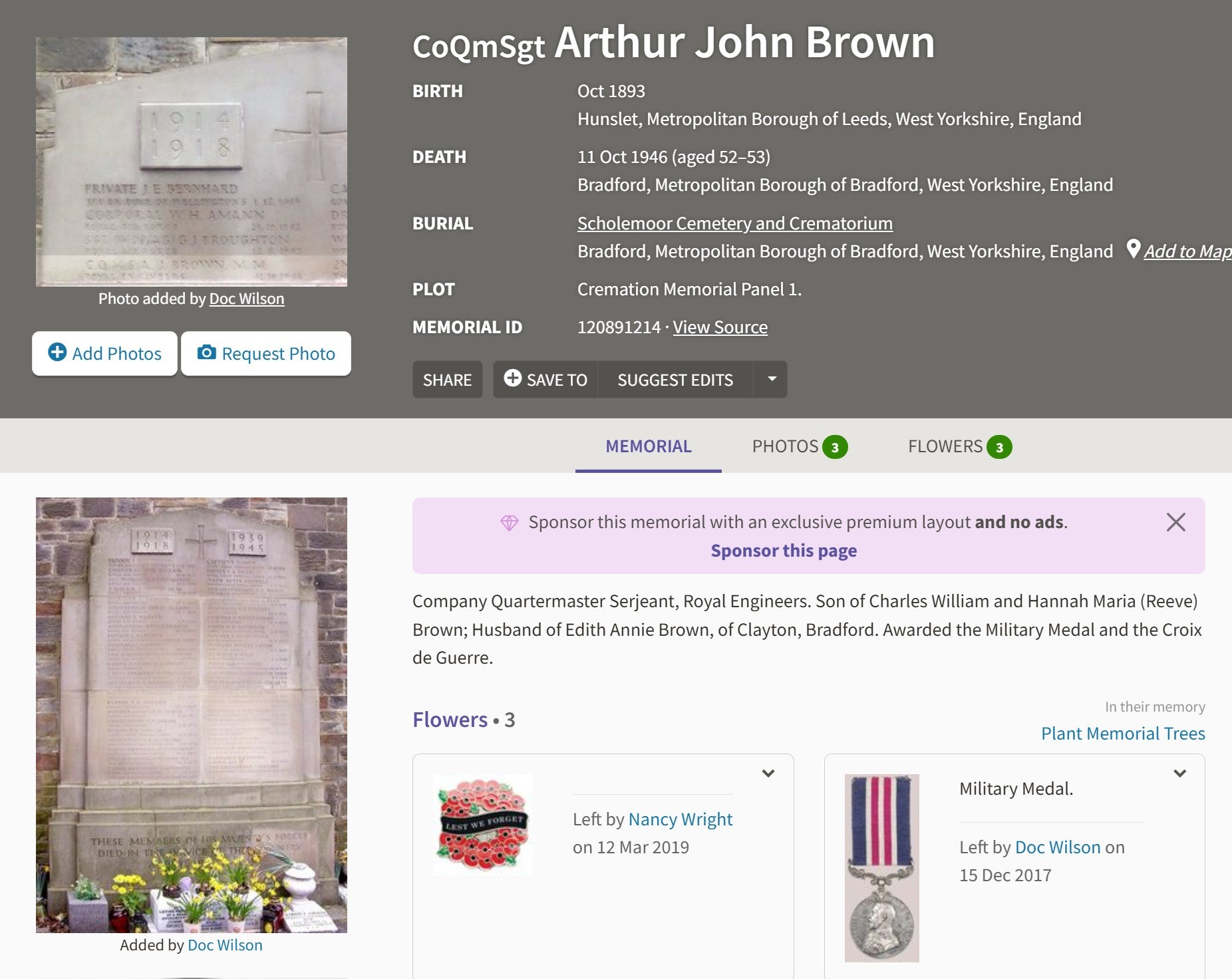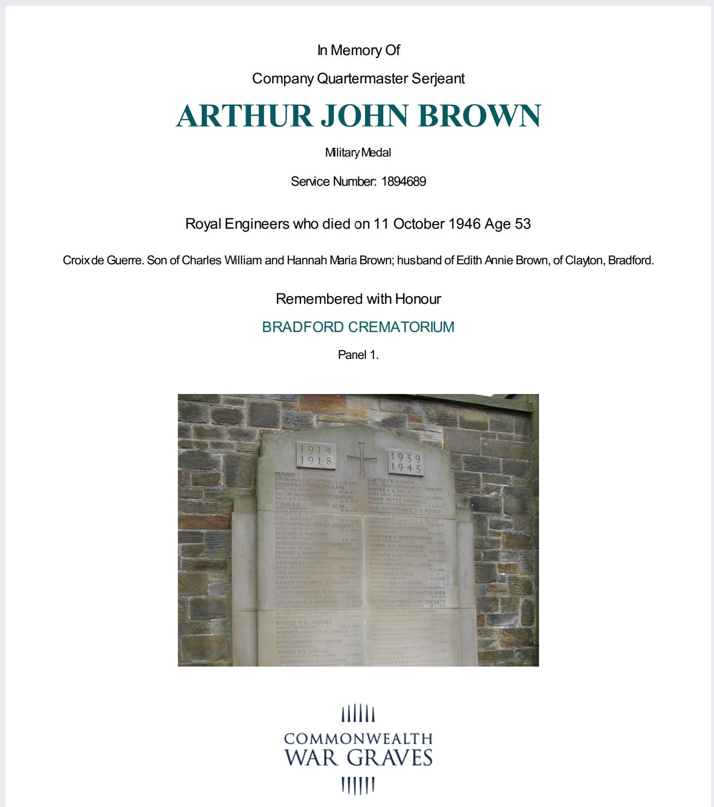 Company Quartermaster Sergeant Arthur John Brown, M.M., died on 11th October 1946, aged 53. He is registered with the Commonwealth War Graves Commission (CWGC), which records both his Military Medal and Croix de Guerre. He is commemorated on a memorial to those cremated at Bradford Crematorium.