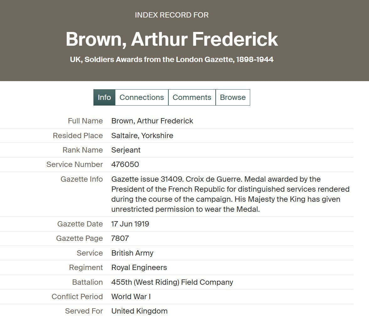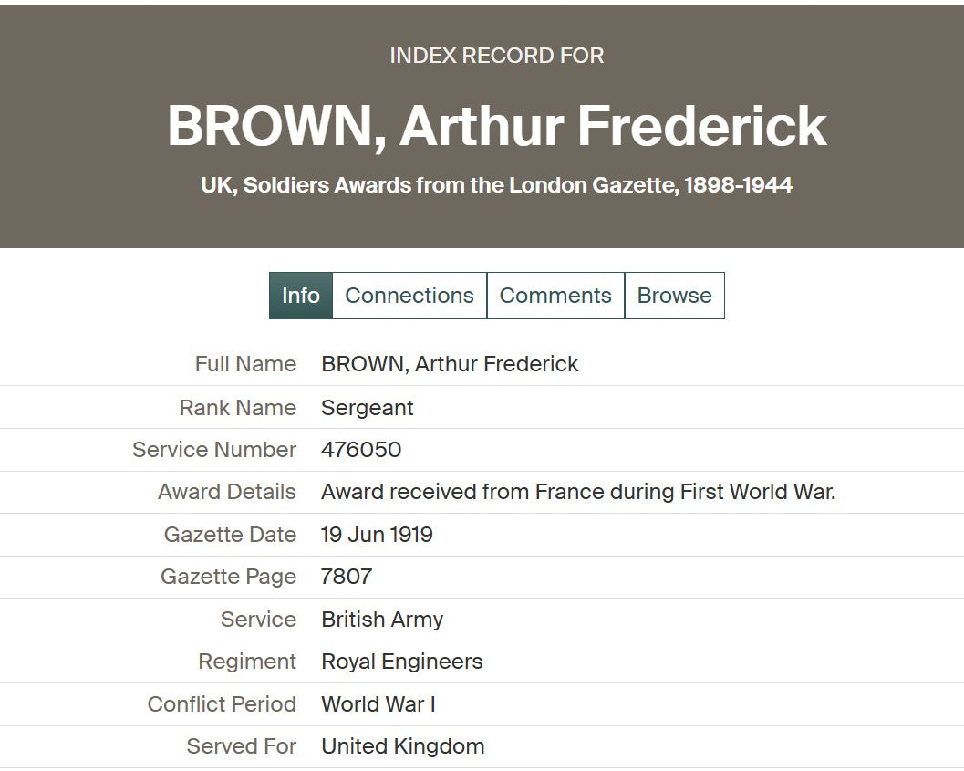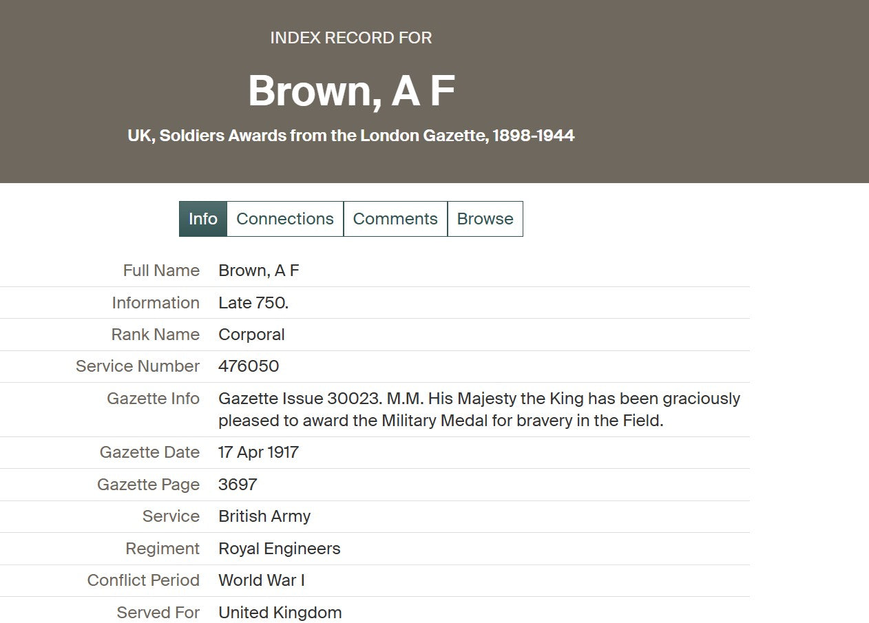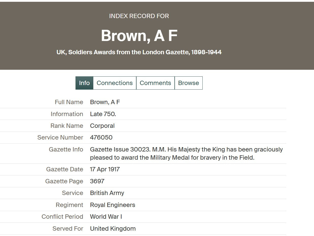 For his First World War service, Sergeant Brown was awarded two Gallantry Awards: