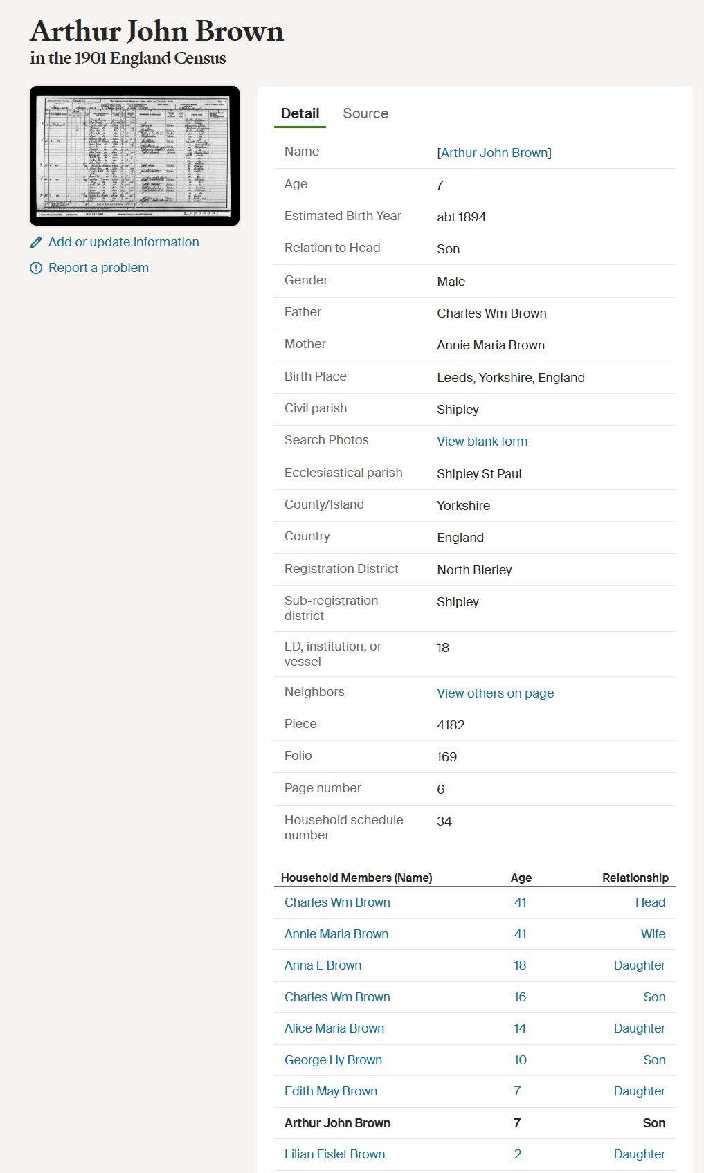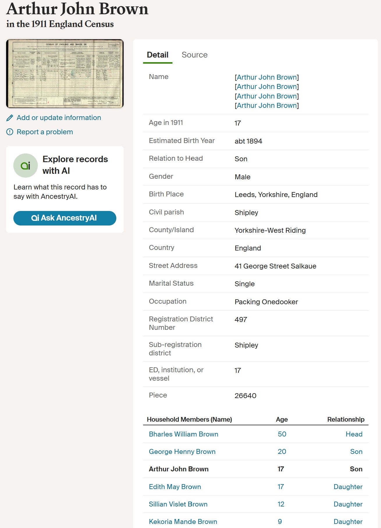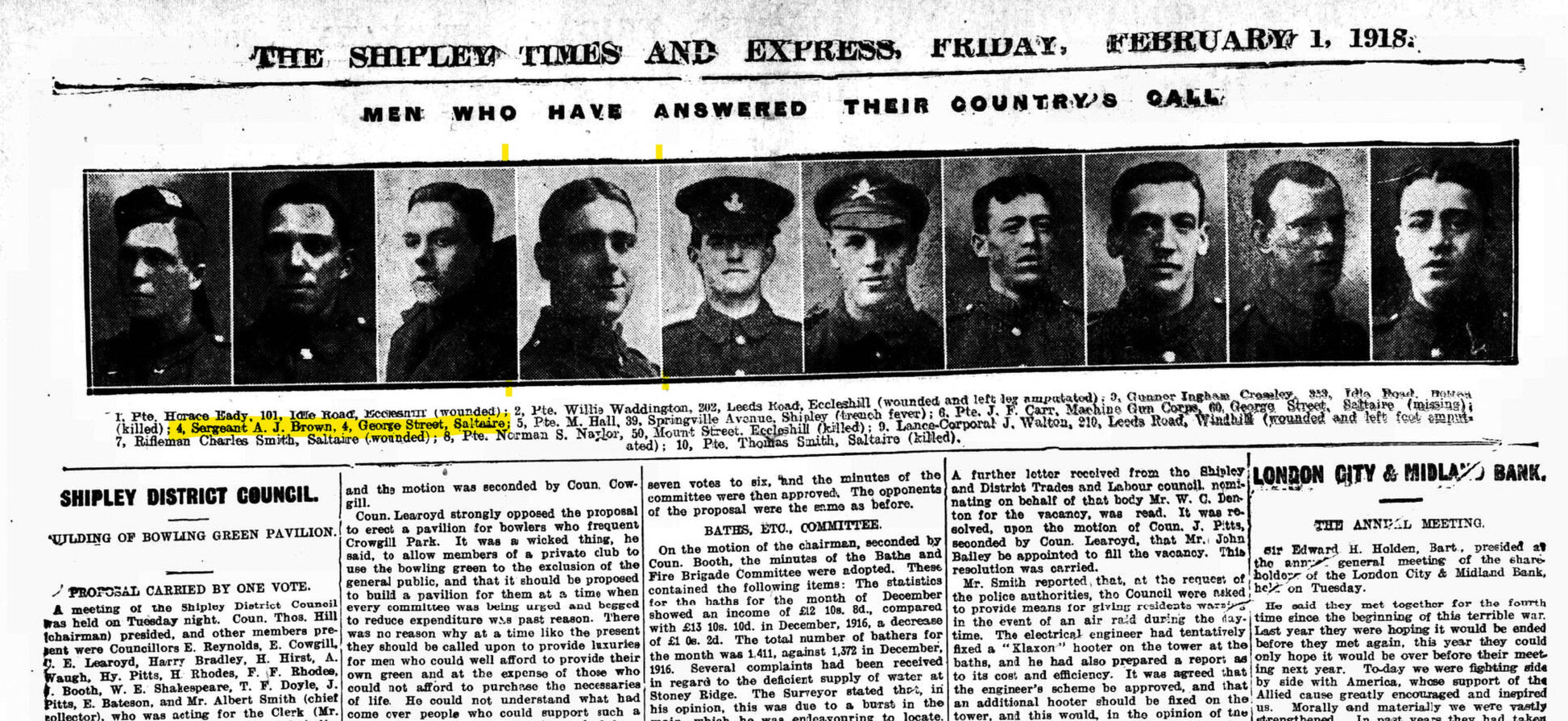 Arthur John Brown (1895–1946) was born on 16th September 1895, the son of Charles William Brown and Annie Maria Brown of Shipley, Yorkshire. He lived at 41 George Street, Saltaire, and is frequently referred to in local newspapers during the war.