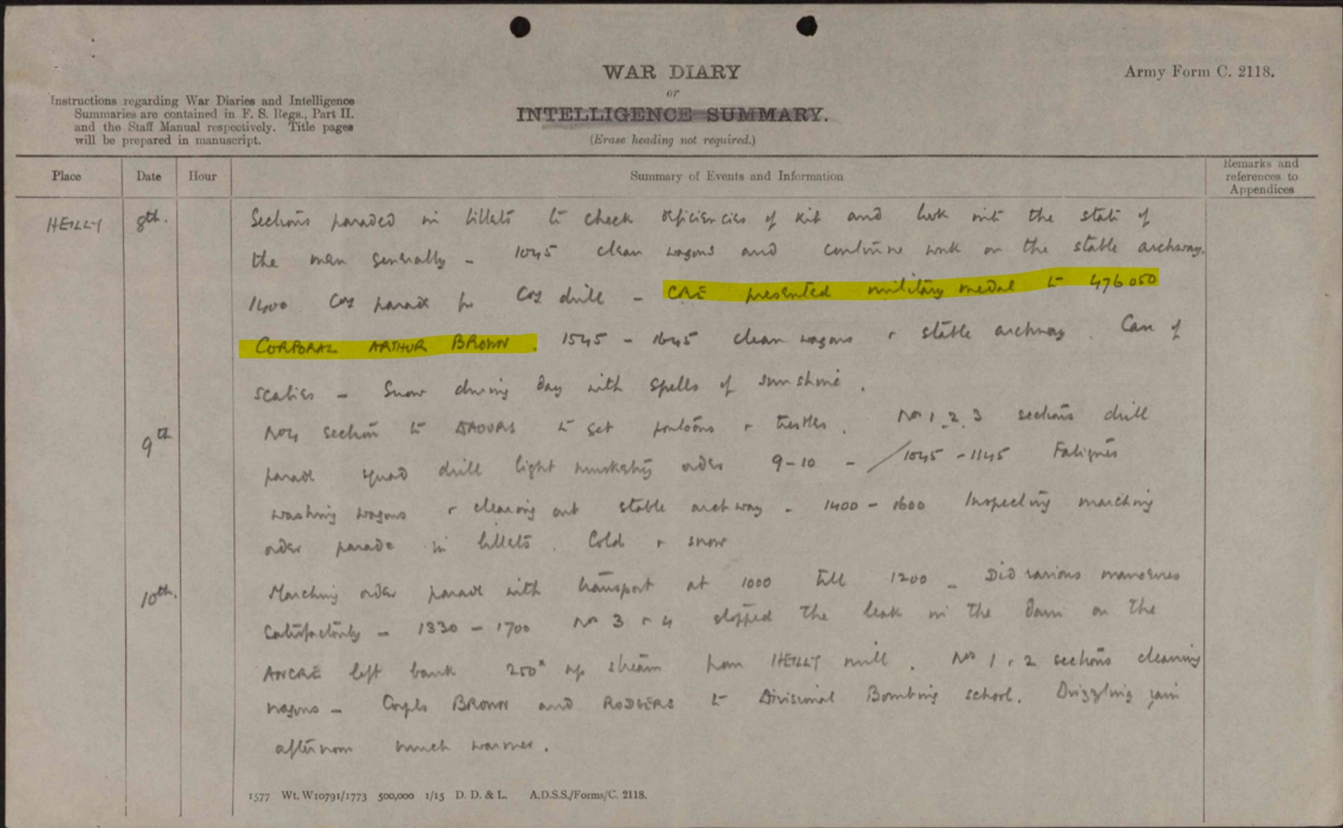 Military Medal – Awarded for gallantry in action, announced London Gazette 17th April 1917. The War Diary of the 455th Field Company confirms the award of the M.M. to Corporal Arthur Brown in March 1917. He was also mentioned several times in the Company’s war diaries during the conflict.