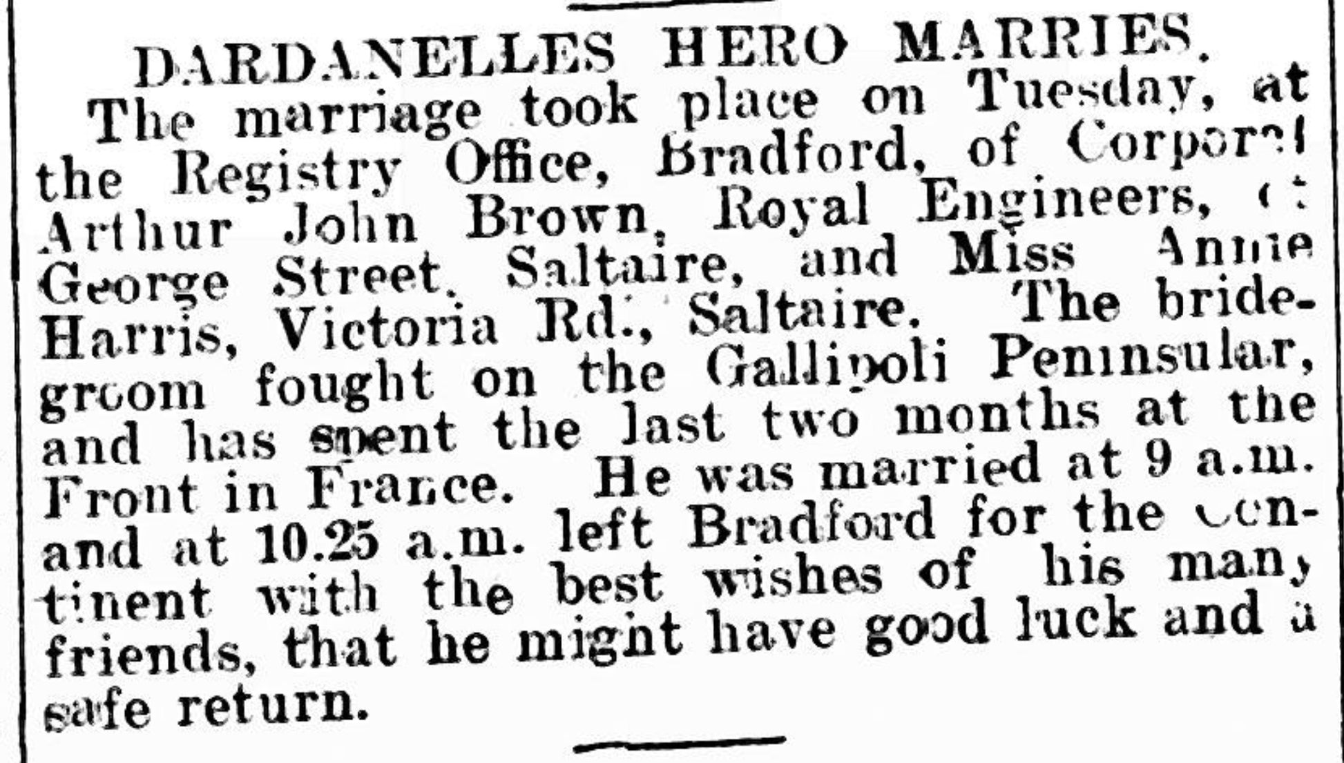 The marriage took place on Tuesday, at the Registry Office, Bradford, of Corporal Arthur John Brown, Royal Engineers, of George Street, Saltaire, and Miss Annie Harris, Victoria Rd., Saltaire. The bridegroom fought on the Gallipoli Peninsular, and has spent the last two months at the Front in France. He was married at 9 a.m. and at 10.25 a.m. left Bradford for the Continent with the best wishes of his many friends, that he might have good luck and a safe return.