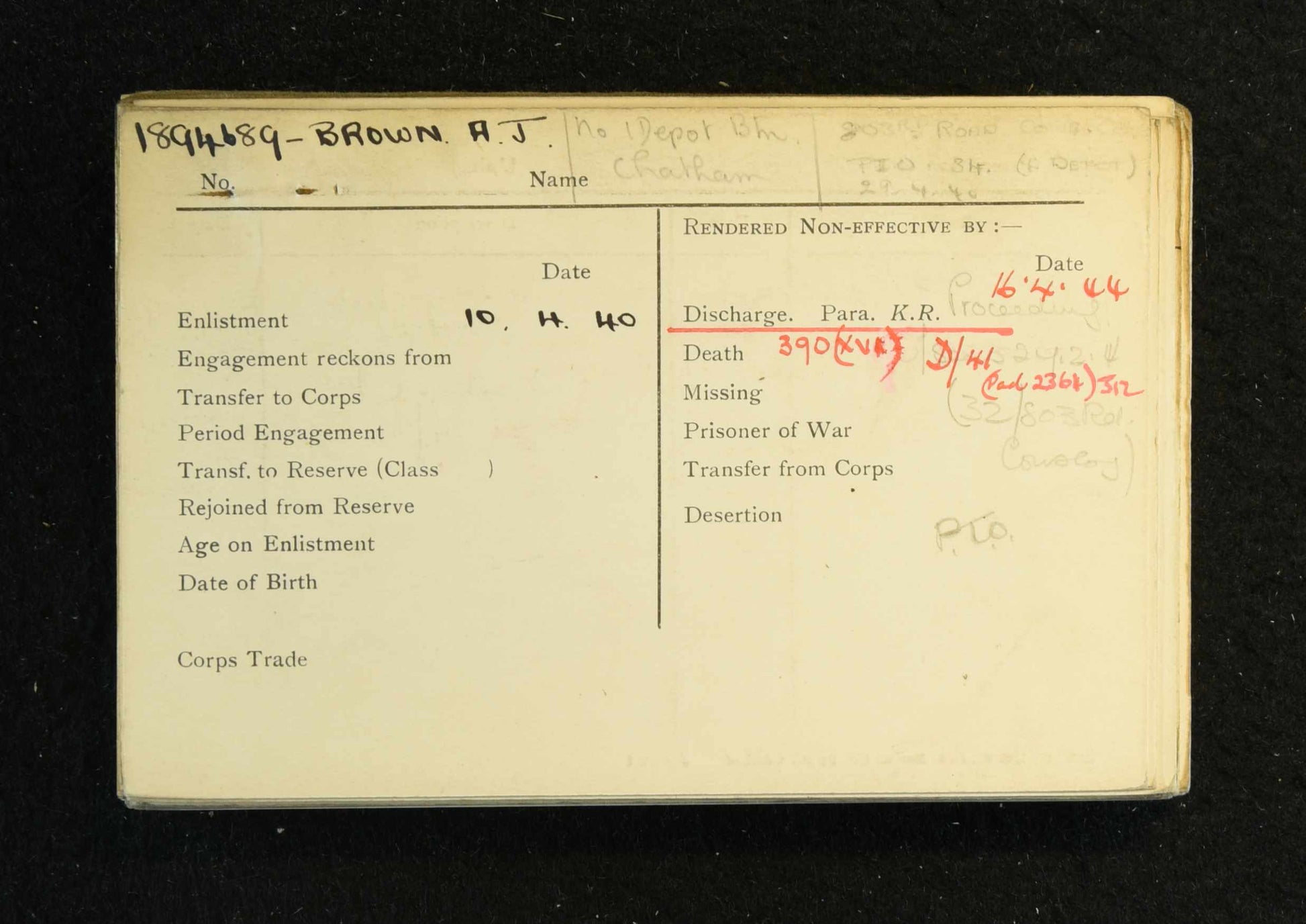 Arthur Brown reenlisted on 10th April 1940 as 1894689 Company Quartermaster Sergeant A. J. Brown, M.M., Royal Engineers. He served with the 803rd Road Construction Company, R.E. His WW2 service included: