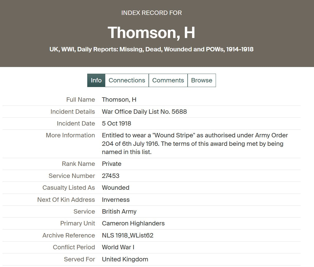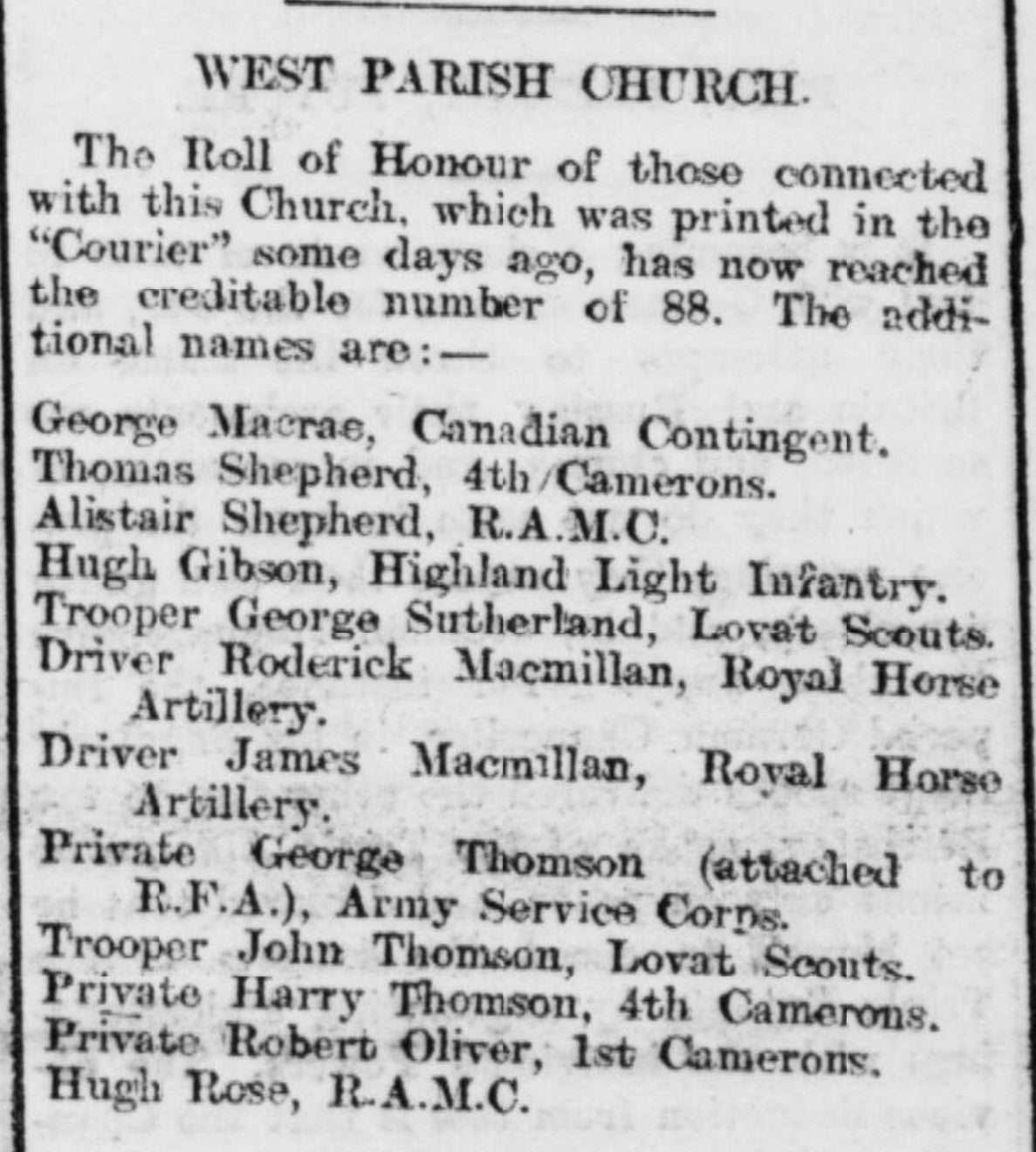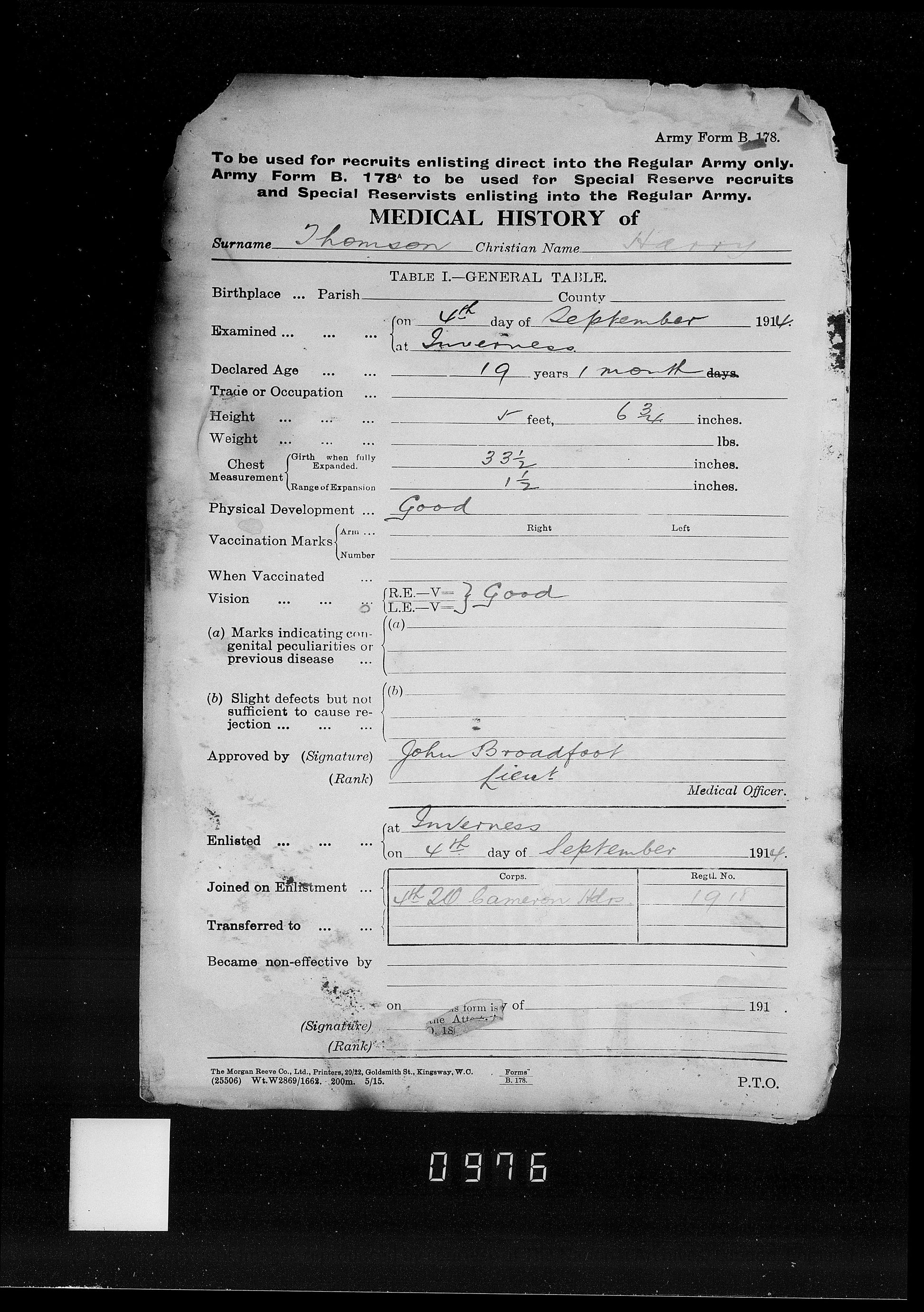 Harry Thomson was born in Inverness on 7 January 1897. He enlisted at Inverness on 4 September 1914, aged 19, joining the 4th Battalion, Cameron Highlanders. His early service is confirmed by his inclusion in the Inverness West Parish Church Roll of Honour, printed in the Inverness Courier on 8 December 1914.