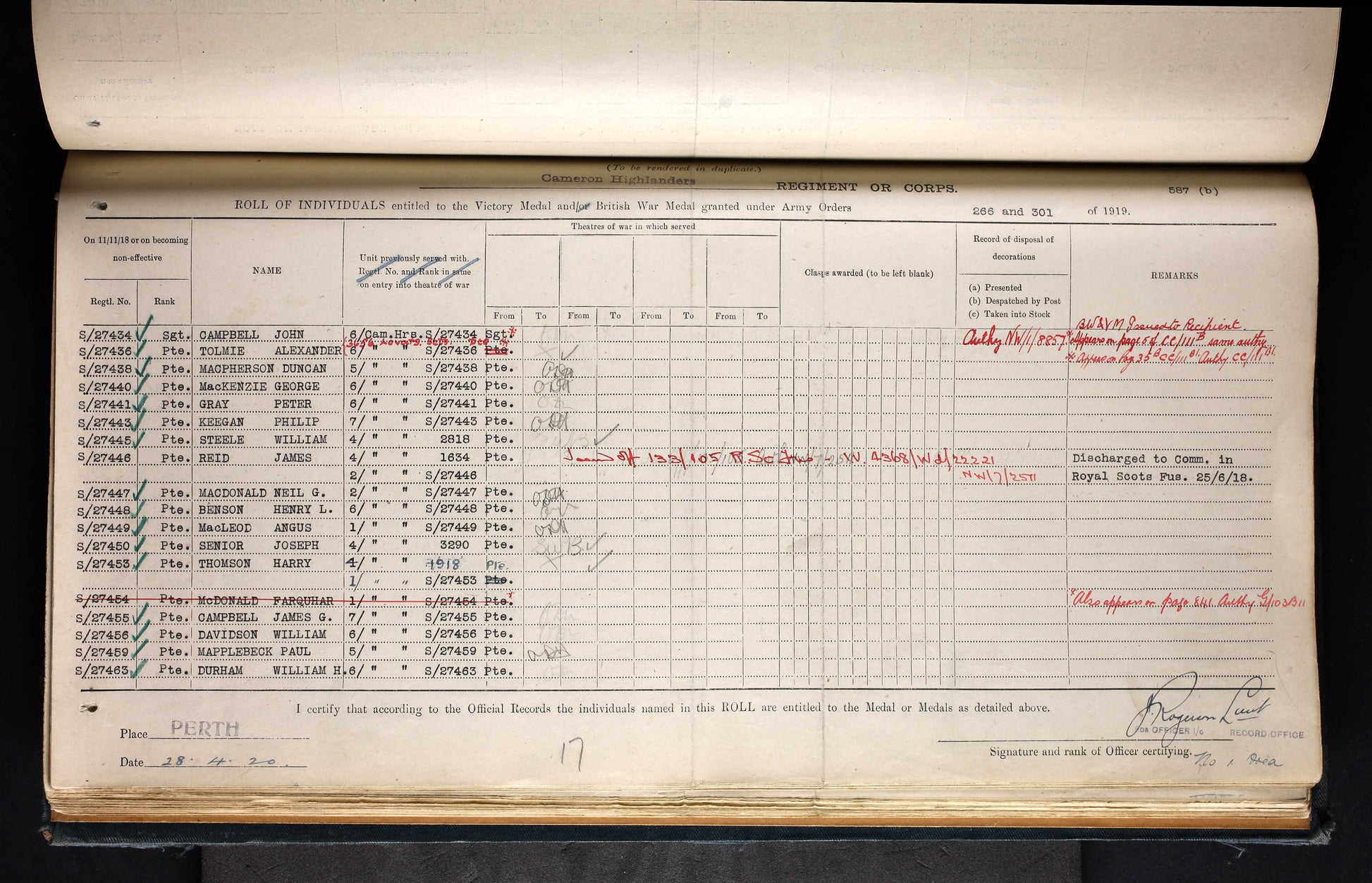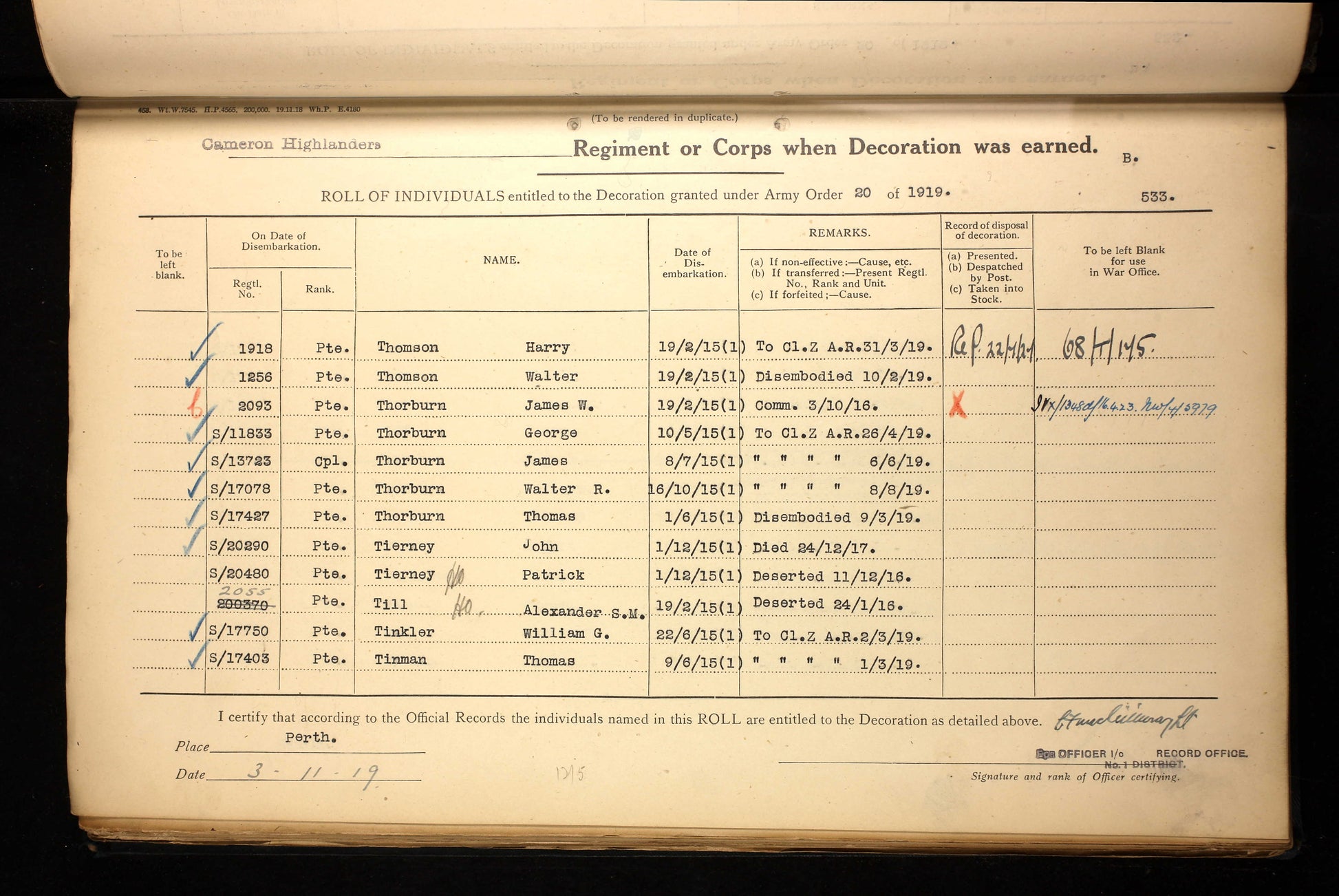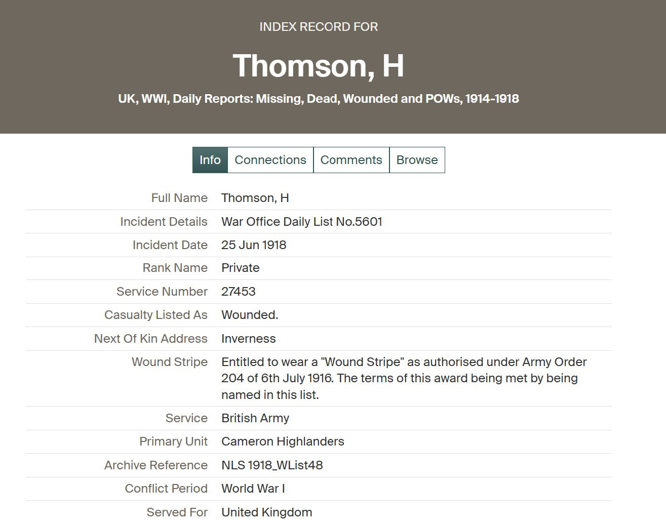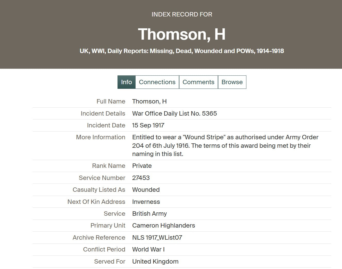 Harry Thomson was born in Inverness on 7 January 1897. He enlisted at Inverness on 4 September 1914, aged 19, joining the 4th Battalion, Cameron Highlanders. His early service is confirmed by his inclusion in the Inverness West Parish Church Roll of Honour, printed in the Inverness Courier on 8 December 1914.