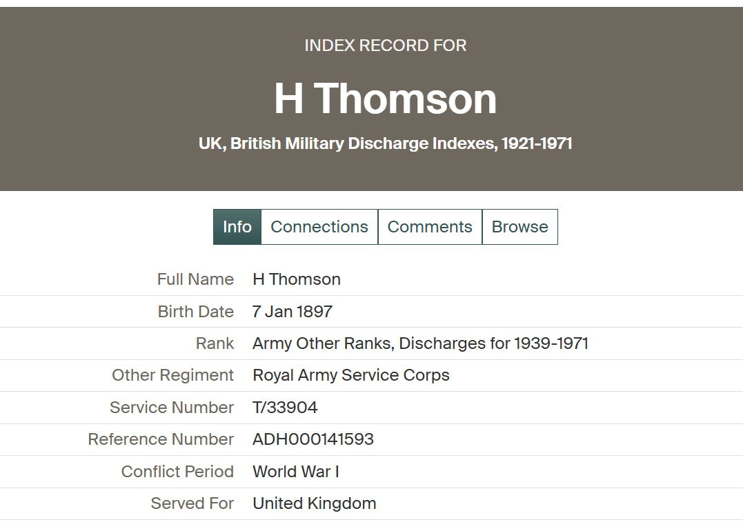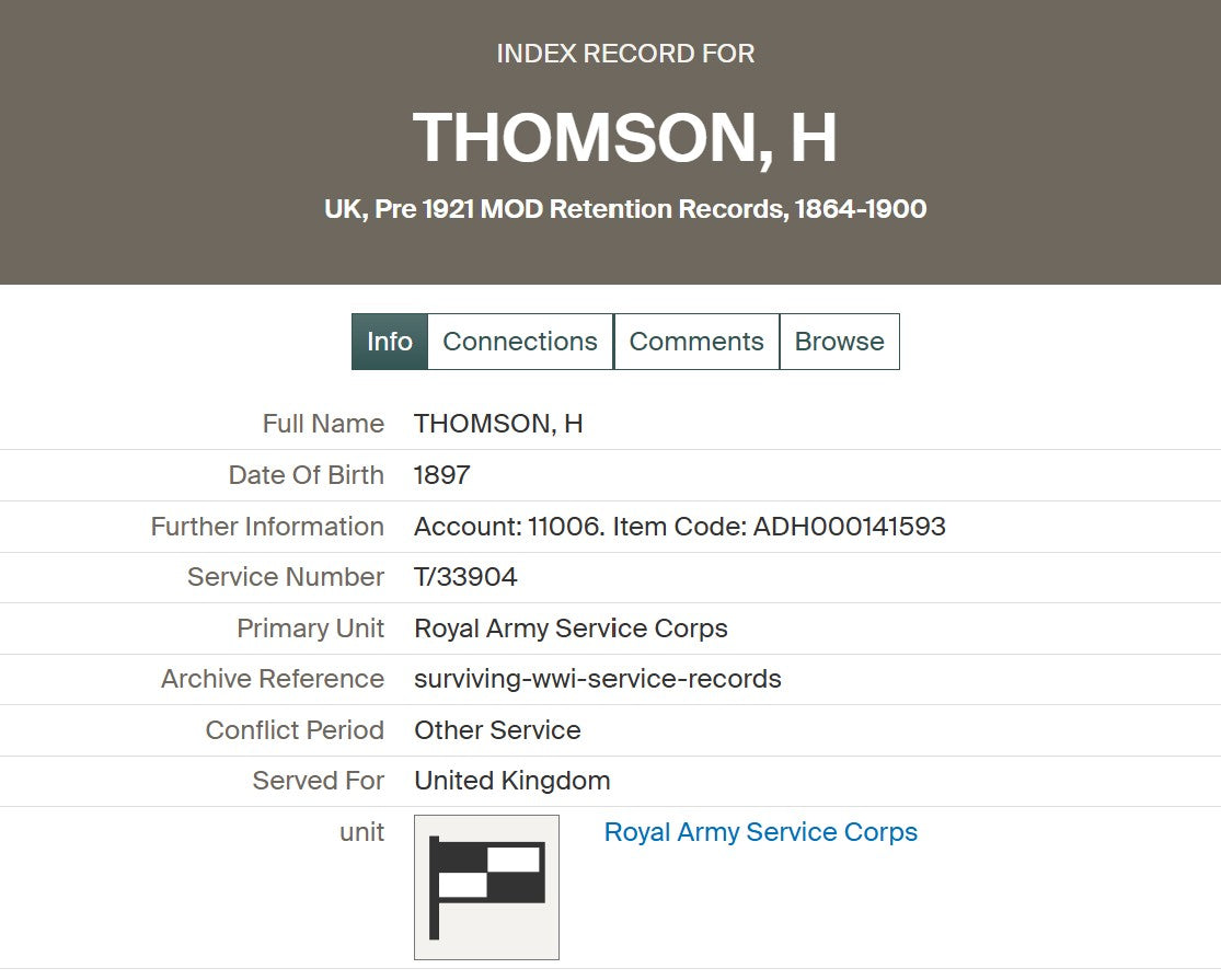 Having been wounded on five separate occasions, Thomson nevertheless continued his military career. He later transferred to the Royal Army Service Corps, remaining in service throughout the 1920s and 1930s.