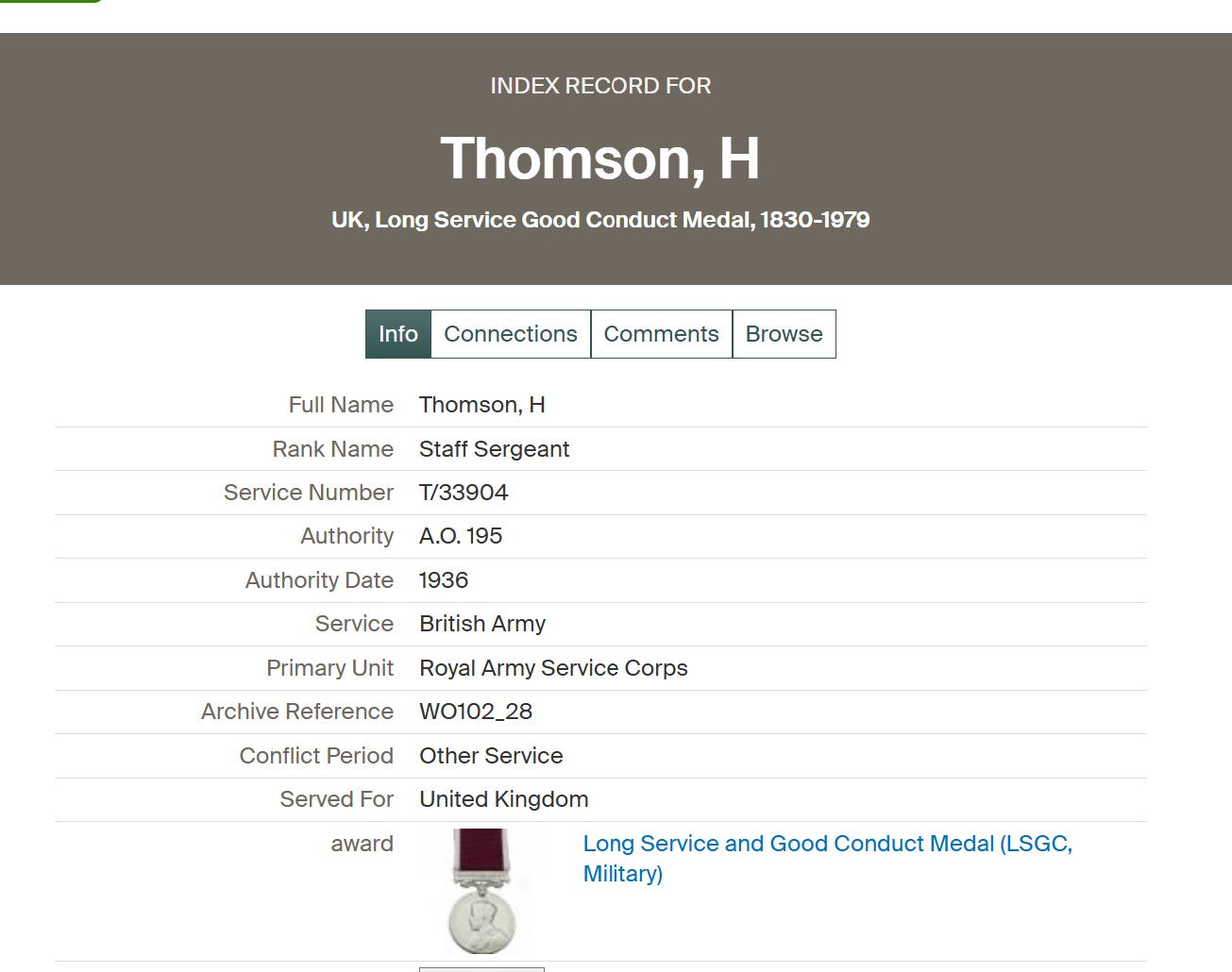 His long and exemplary service was recognised in 1936, when he was awarded the Long Service and Good Conduct Medal as a Staff Sergeant, marking over two decades of continuous and disciplined service following his hard-fought experiences on the Western Front.
