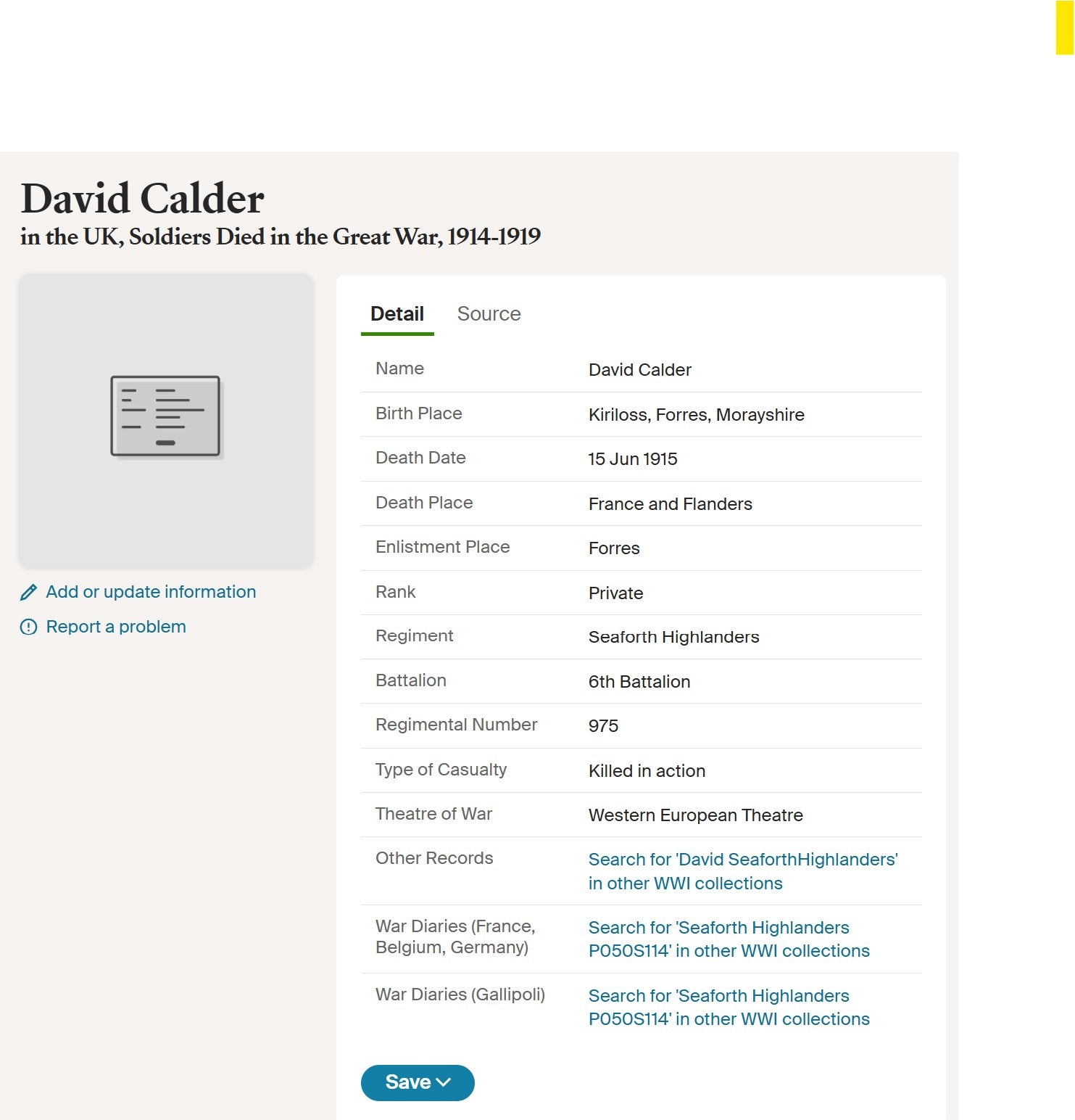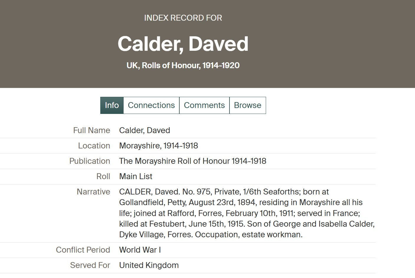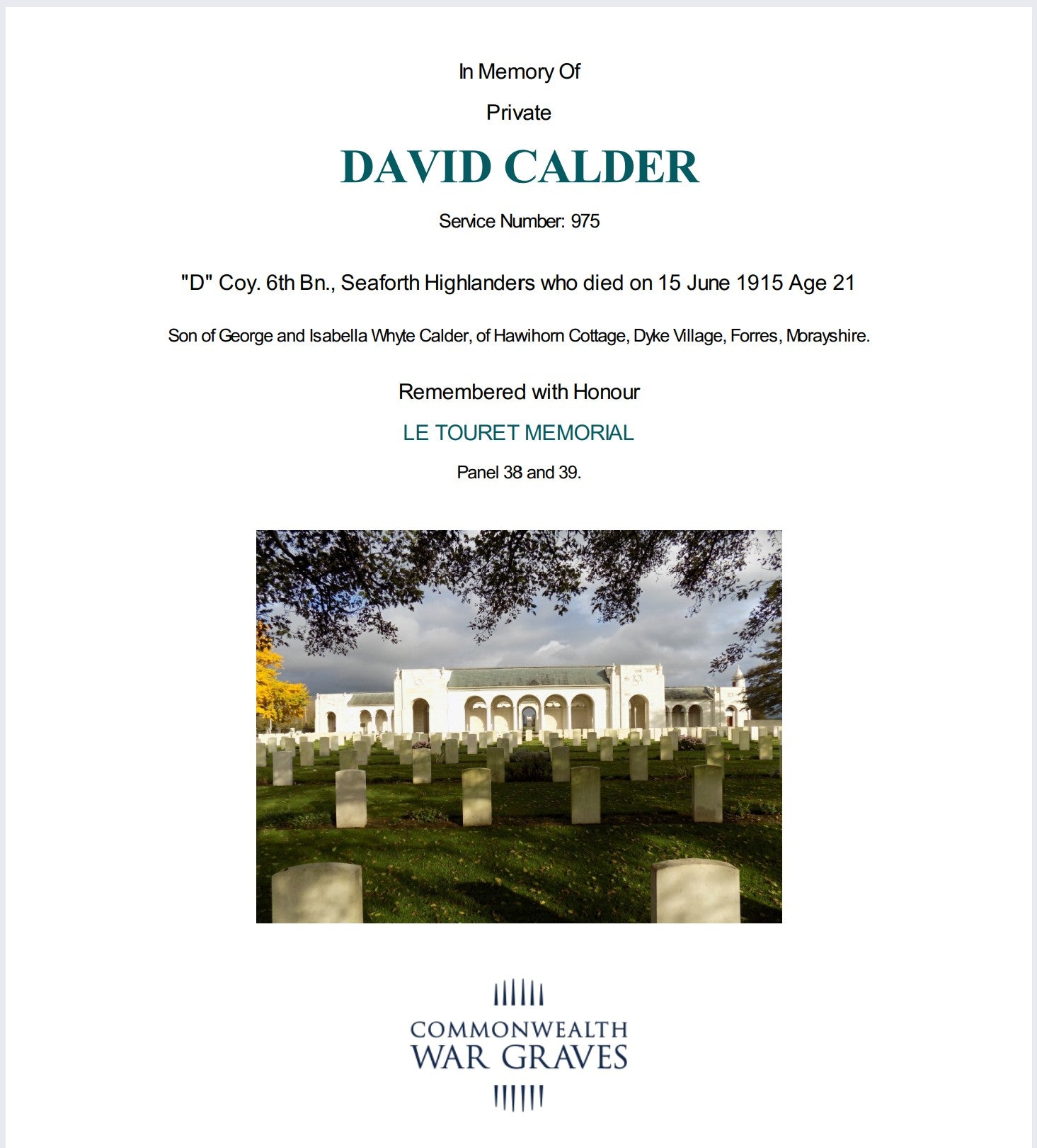 David Calder was born at Gollanfield, Petty on 23 August 1894, the son of George and Isabella Calder. He was the second of three children born to the couple and their only son. In the 1901 census the family lived at Rafford, but by the end of the war his parents were living at Hawthorn Cottage, Dyke. In the 1911 census, David was living with John Forbes and was employed as a ploughman on the Fernielea Farm, Rafford.