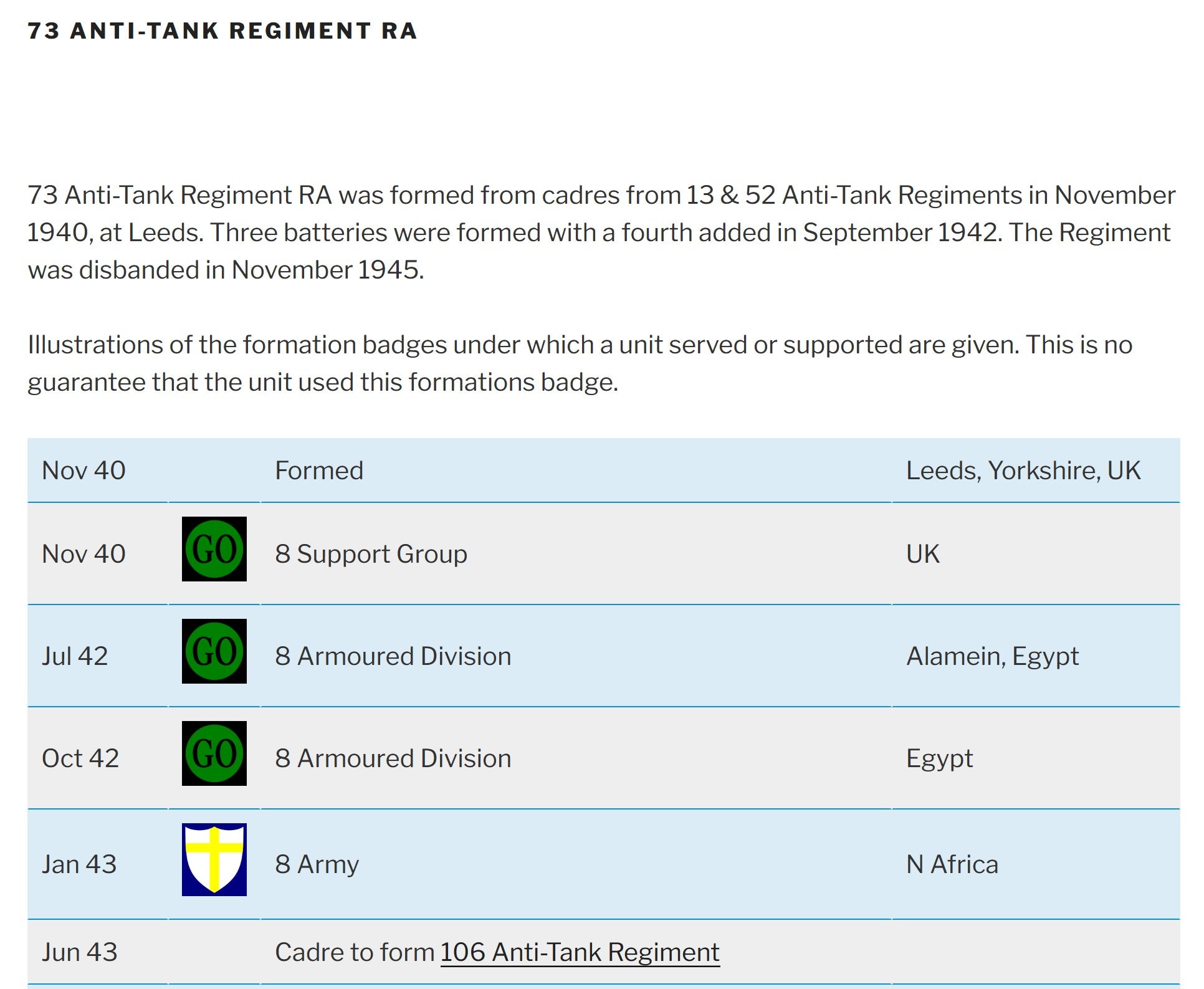 73 Anti-Tank Regiment, Royal Artillery was formed in November 1940 at Leeds, drawing cadres from 13 and 52 Anti-Tank Regiments. Initially composed of three batteries, a fourth battery was added in September 1942. The regiment saw active service at El Alamein and in Egypt with the 8th Armoured Division, before joining the 8th Army for the campaigns in Sicily and Italy. Later, in the campaign in North West Europe, 198 and 234 Batteries were detached to 50th (Northumbrian) Division for the D-Day assault, each equipped with 12 x M10 17-pounder tank destroyers. The regiment was disbanded in November 1945.
