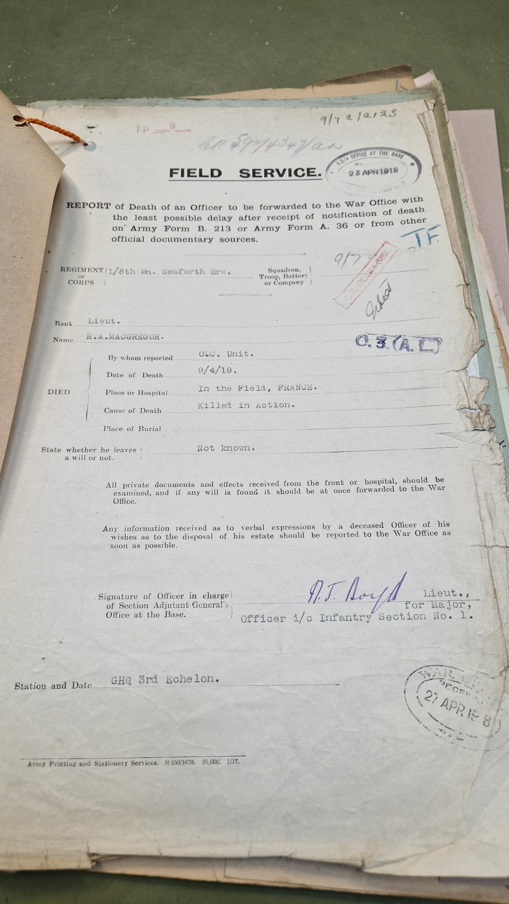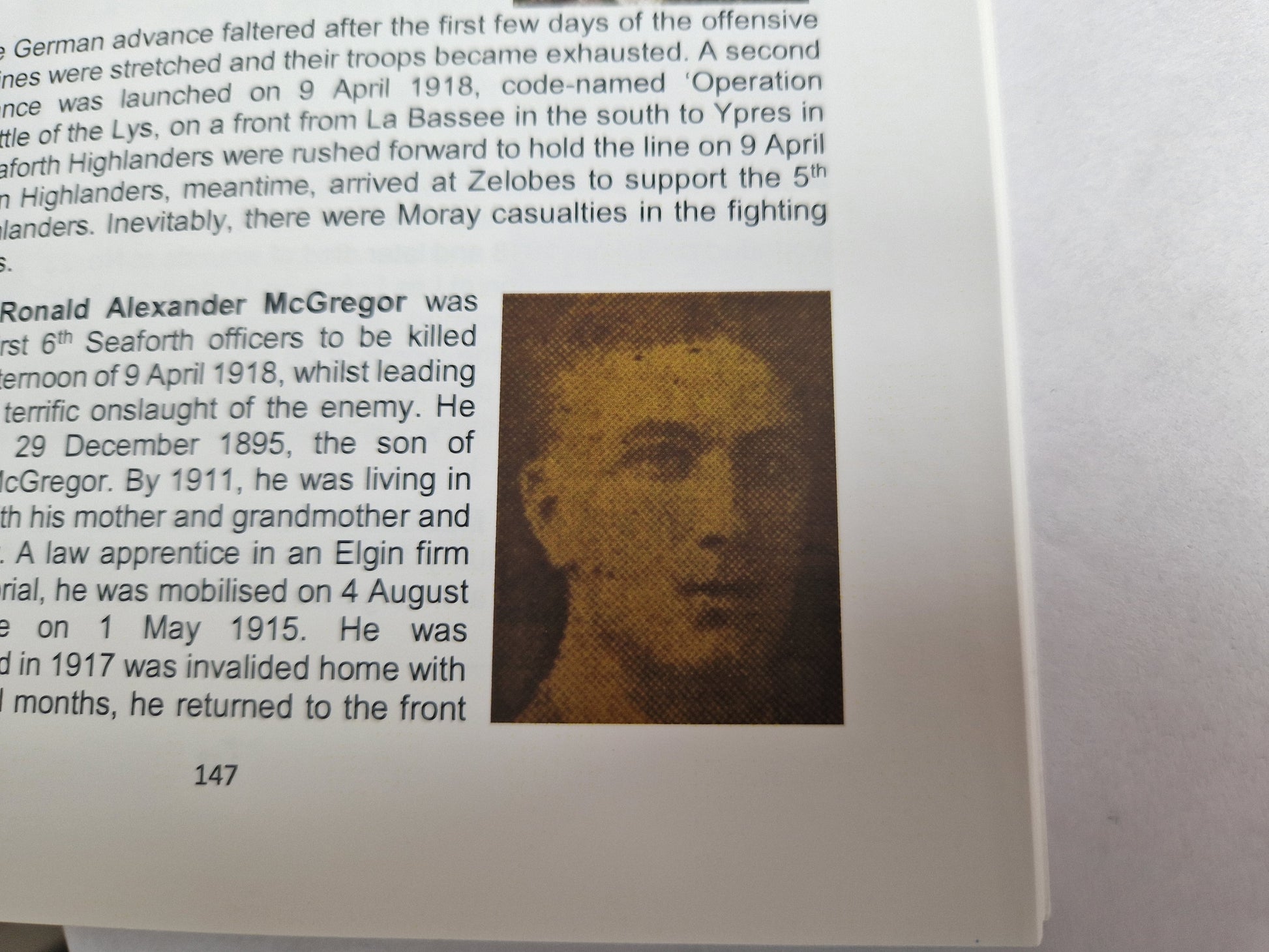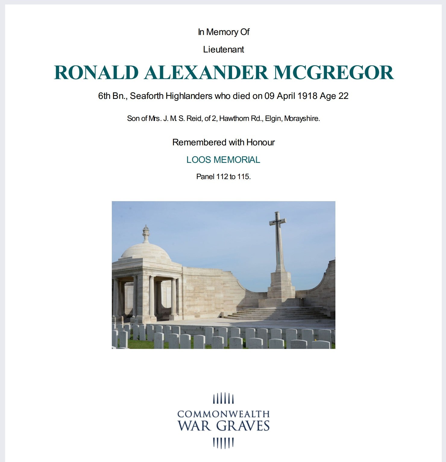 "Lieutenant Ronald Alexander McGregor was one of the first 6th Seaforth officers to be killed early in the afternoon of 9 April 1918, whilst leading his platoon to stop the terrific onslaught of the enemy. He was born in Banff on 29 December 1895, the son of Alexander and Jeanie McGregor. By 1911, he was living in Hawthorn Road, Elgin with his mother and grandmother and attended Elgin Academy. A law apprentice in an Elgin firm of solicitors, and a Territorial, he was mobilised on 4 August 1914, going to France on 1 May 1915. He was commissioned in 1916 and in 1917 was invalided home with trench fever. After several months, he returned to the front line. He is commemorated on the Loos Memorial and on the Elgin War Memorial and the Elgin Academy War Memorial Plaque."