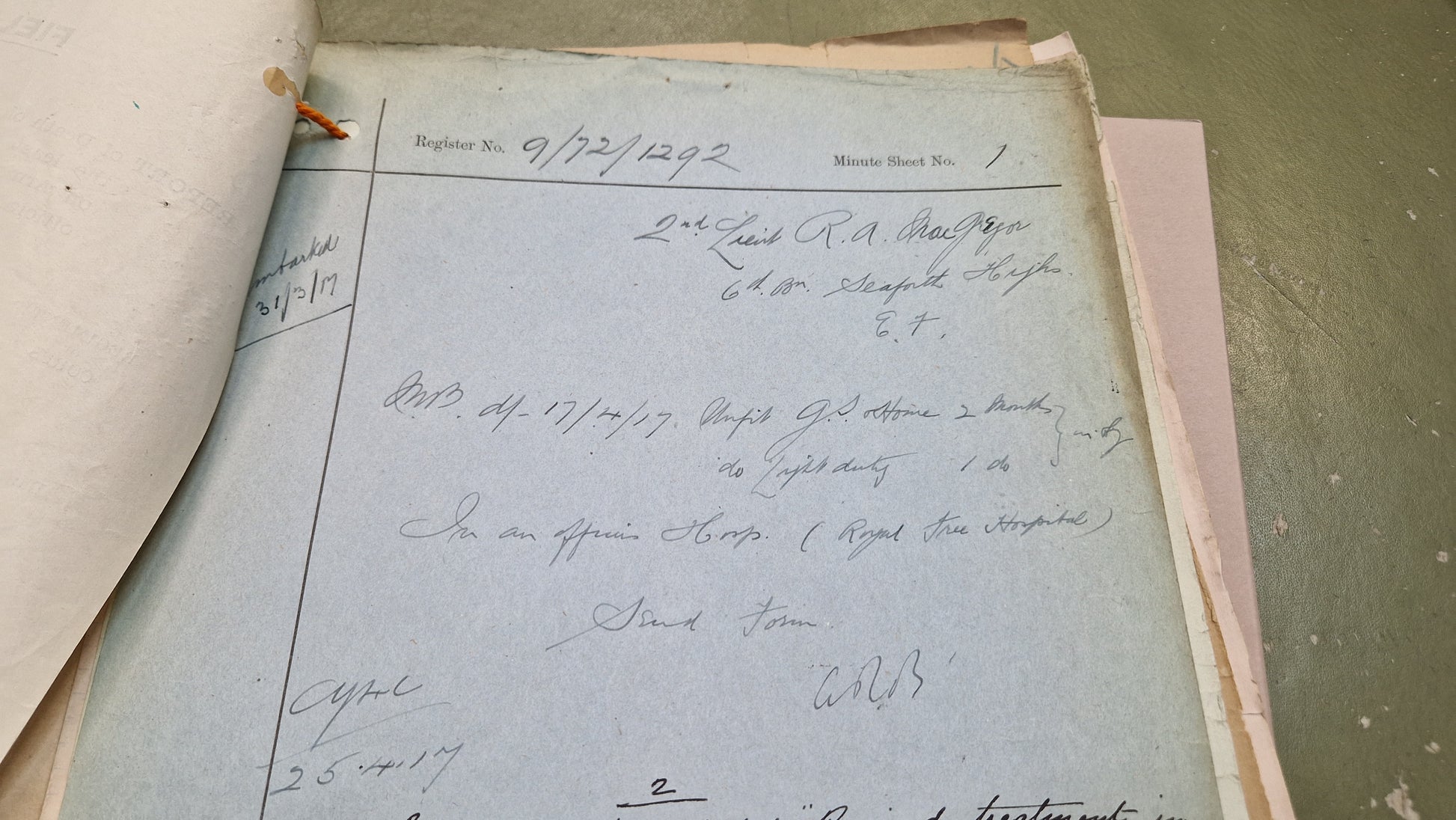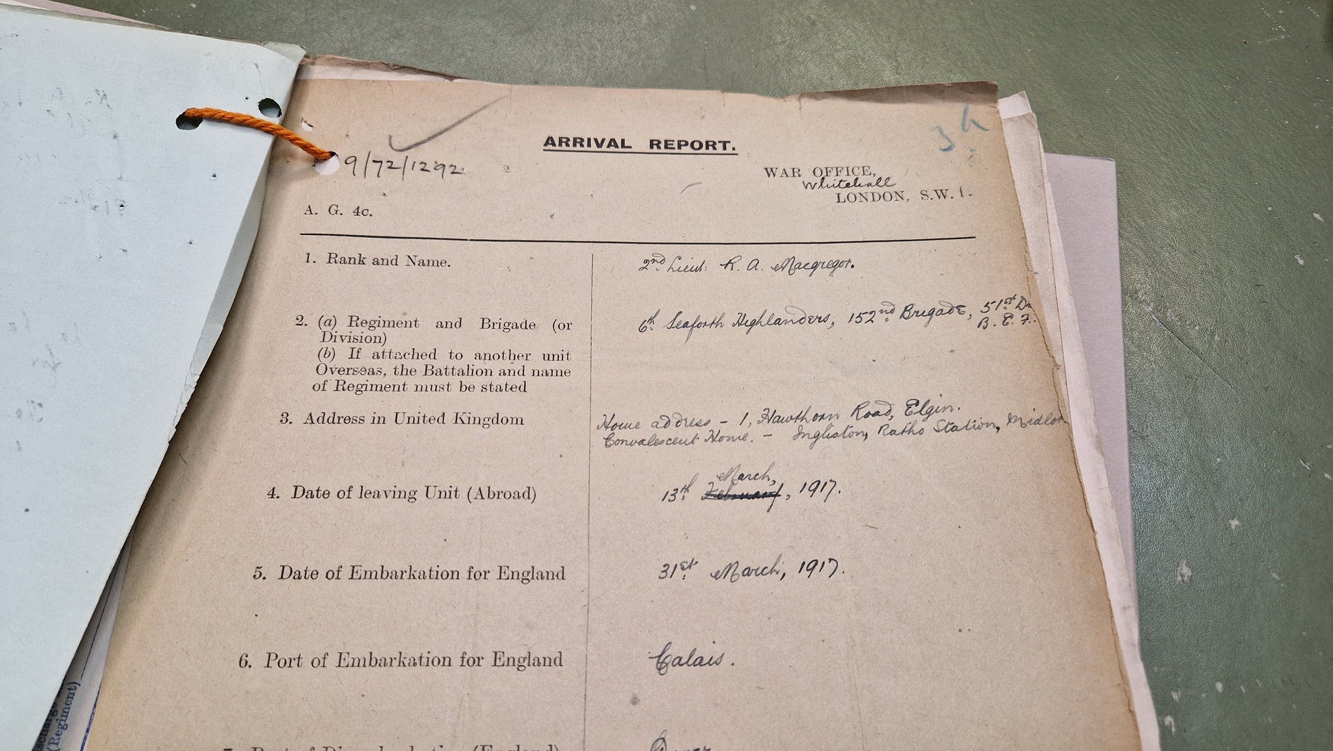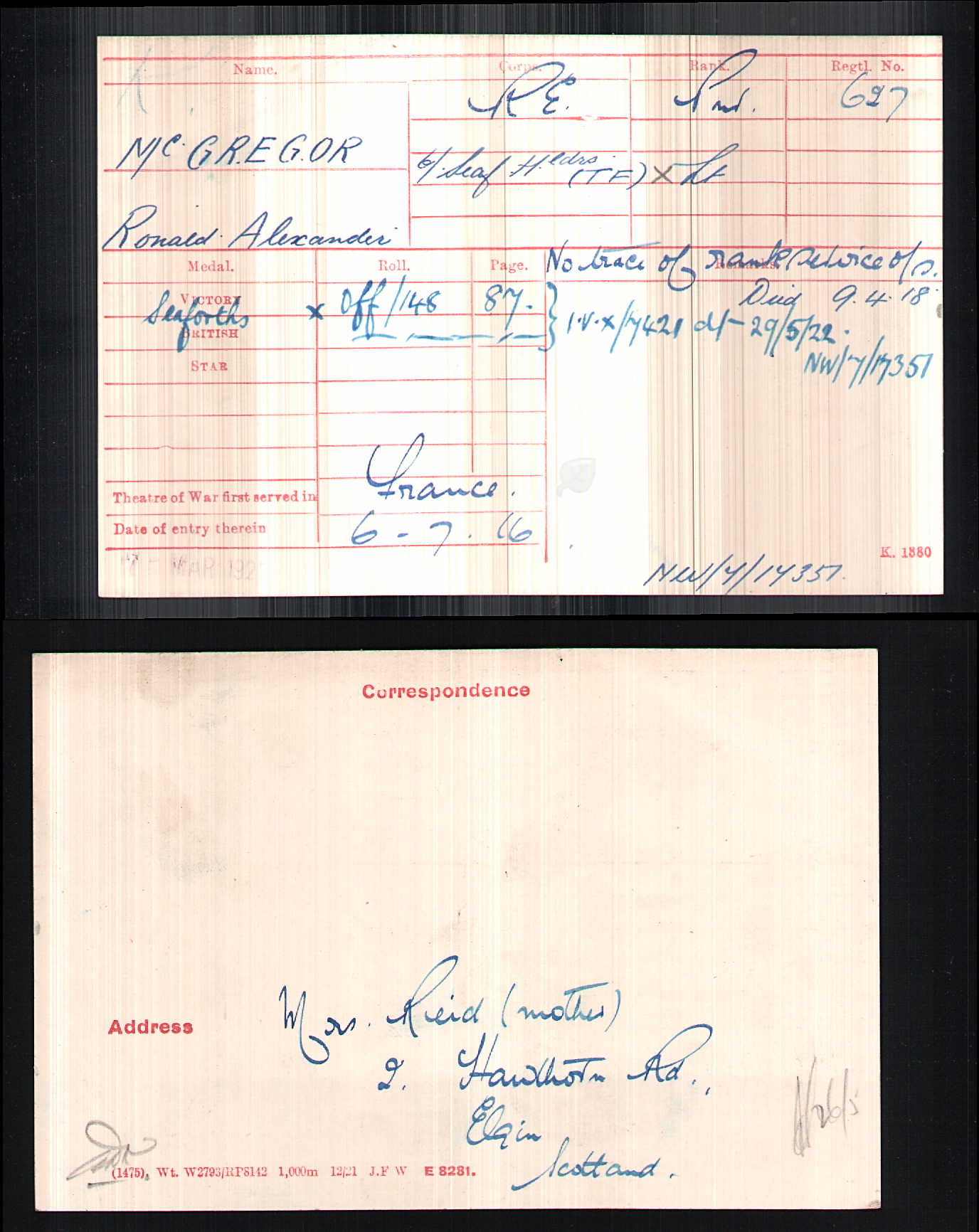 "Lieutenant Ronald Alexander McGregor was one of the first 6th Seaforth officers to be killed early in the afternoon of 9 April 1918, whilst leading his platoon to stop the terrific onslaught of the enemy. He was born in Banff on 29 December 1895, the son of Alexander and Jeanie McGregor. By 1911, he was living in Hawthorn Road, Elgin with his mother and grandmother and attended Elgin Academy. A law apprentice in an Elgin firm of solicitors, and a Territorial, he was mobilised on 4 August 1914, going to France on 1 May 1915. He was commissioned in 1916 and in 1917 was invalided home with trench fever. After several months, he returned to the front line. He is commemorated on the Loos Memorial and on the Elgin War Memorial and the Elgin Academy War Memorial Plaque."