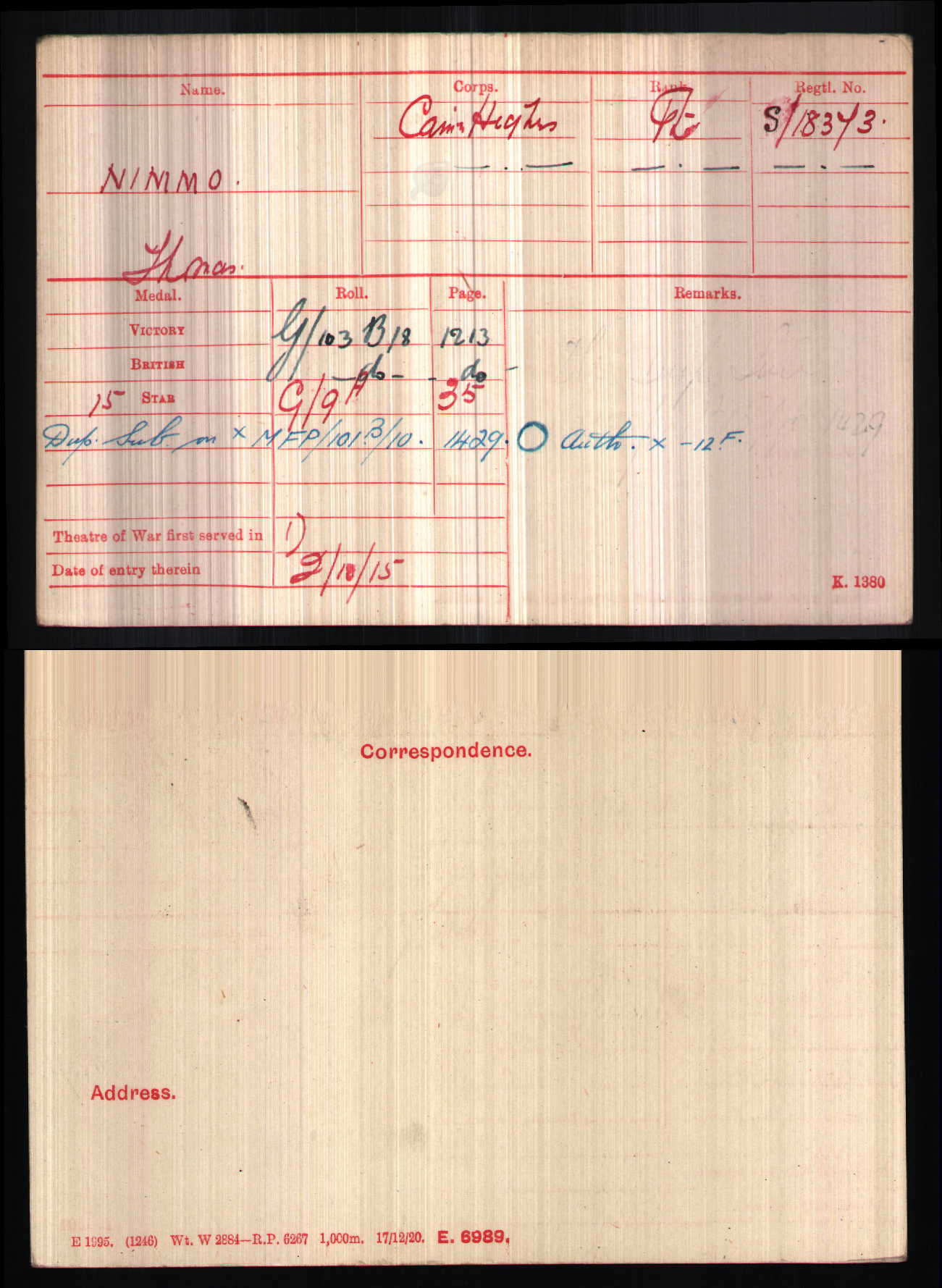 1914-15 Star - S-18373 PTE. T. NIMMO. CAM'N HIGHRS.