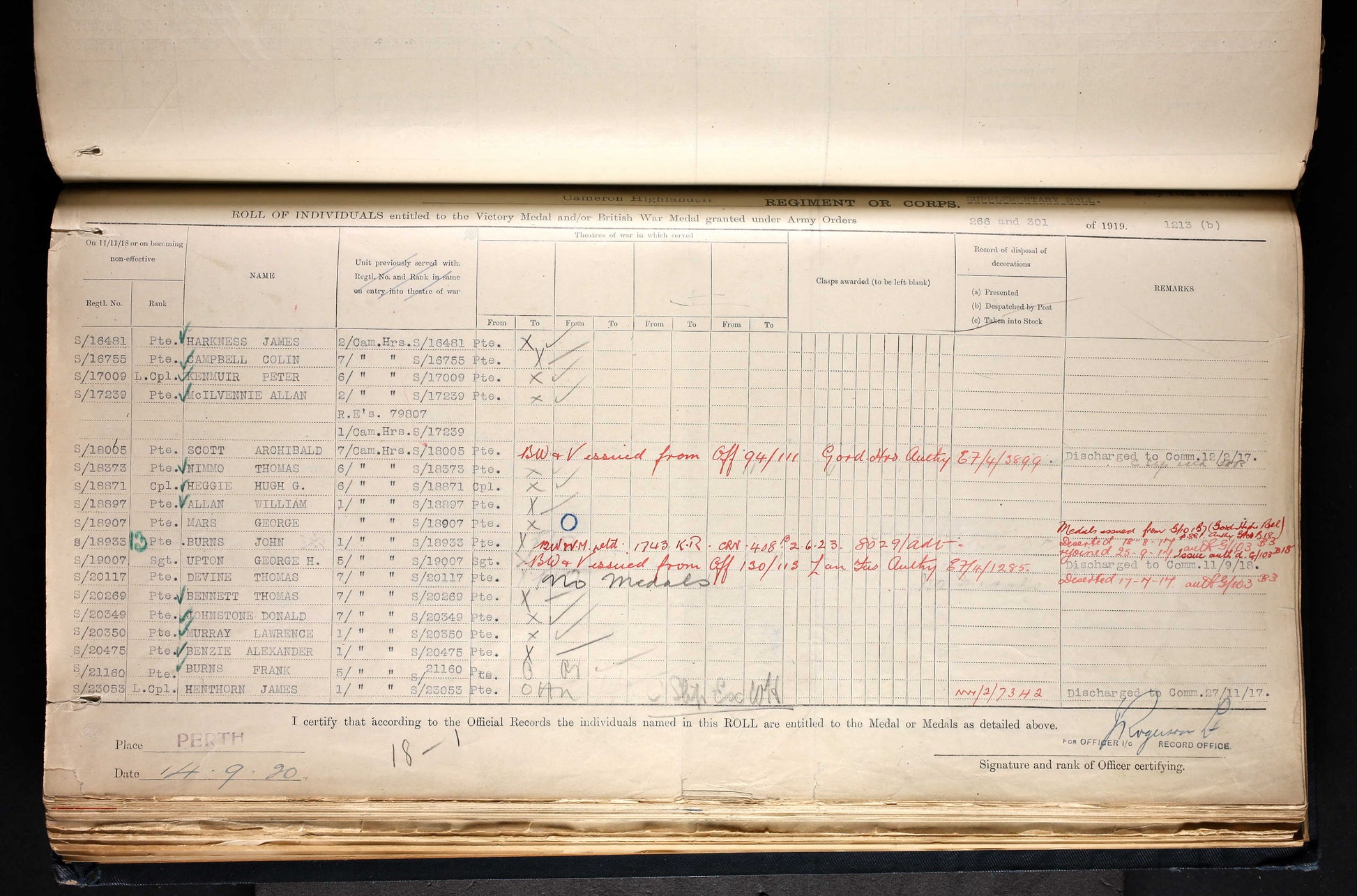 British War Medal - S-18373 PTE. T. NIMMO. CAMERONS.