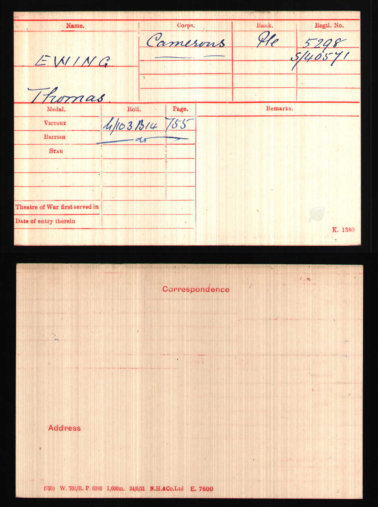 Victory Medal – 5298 PTE. T. EWING. CAMERONS.