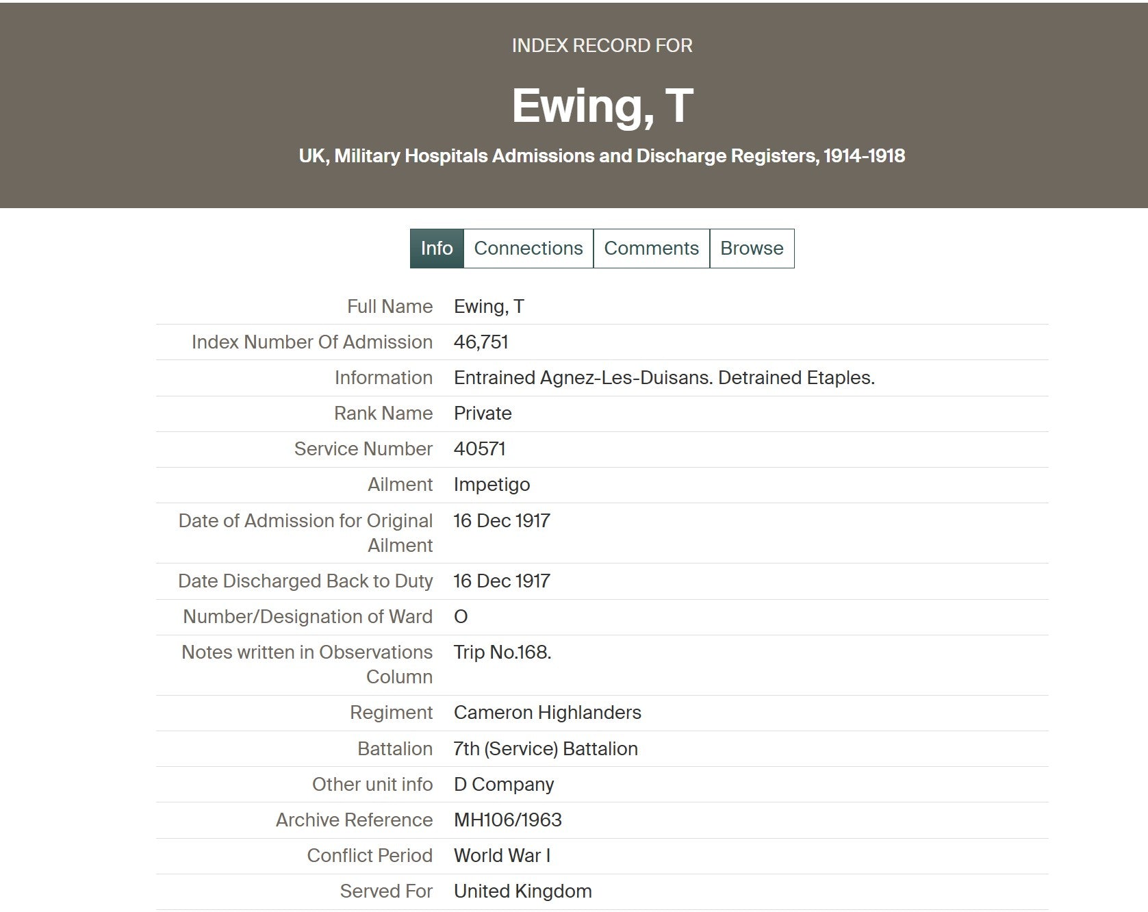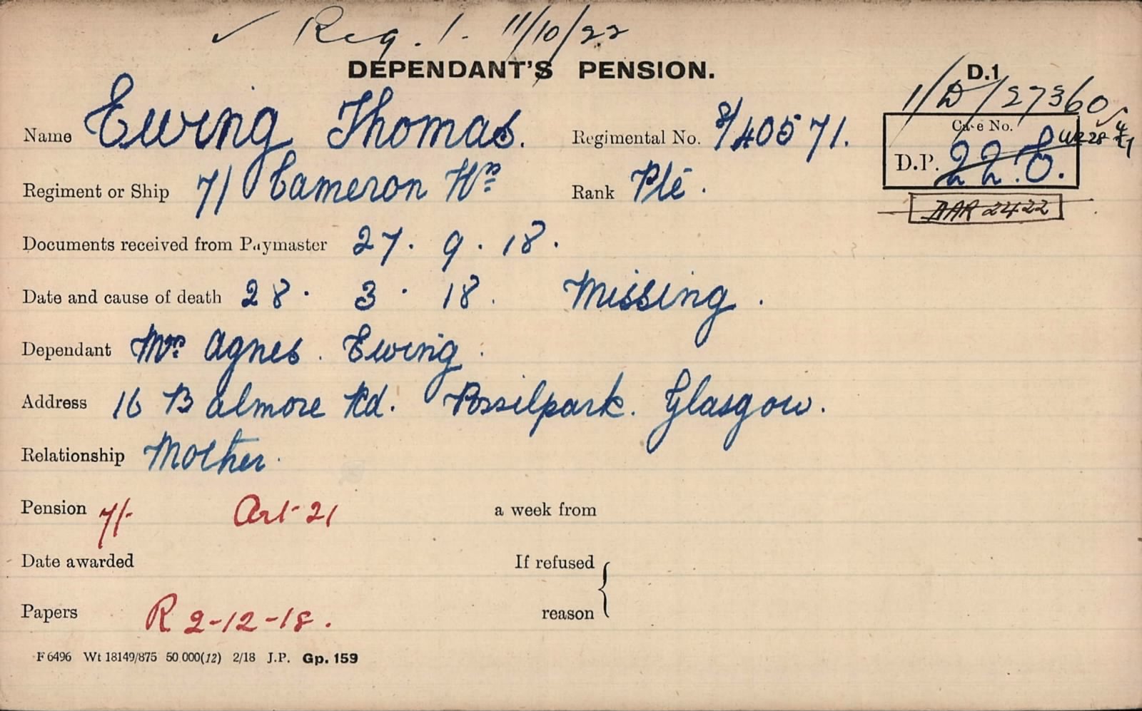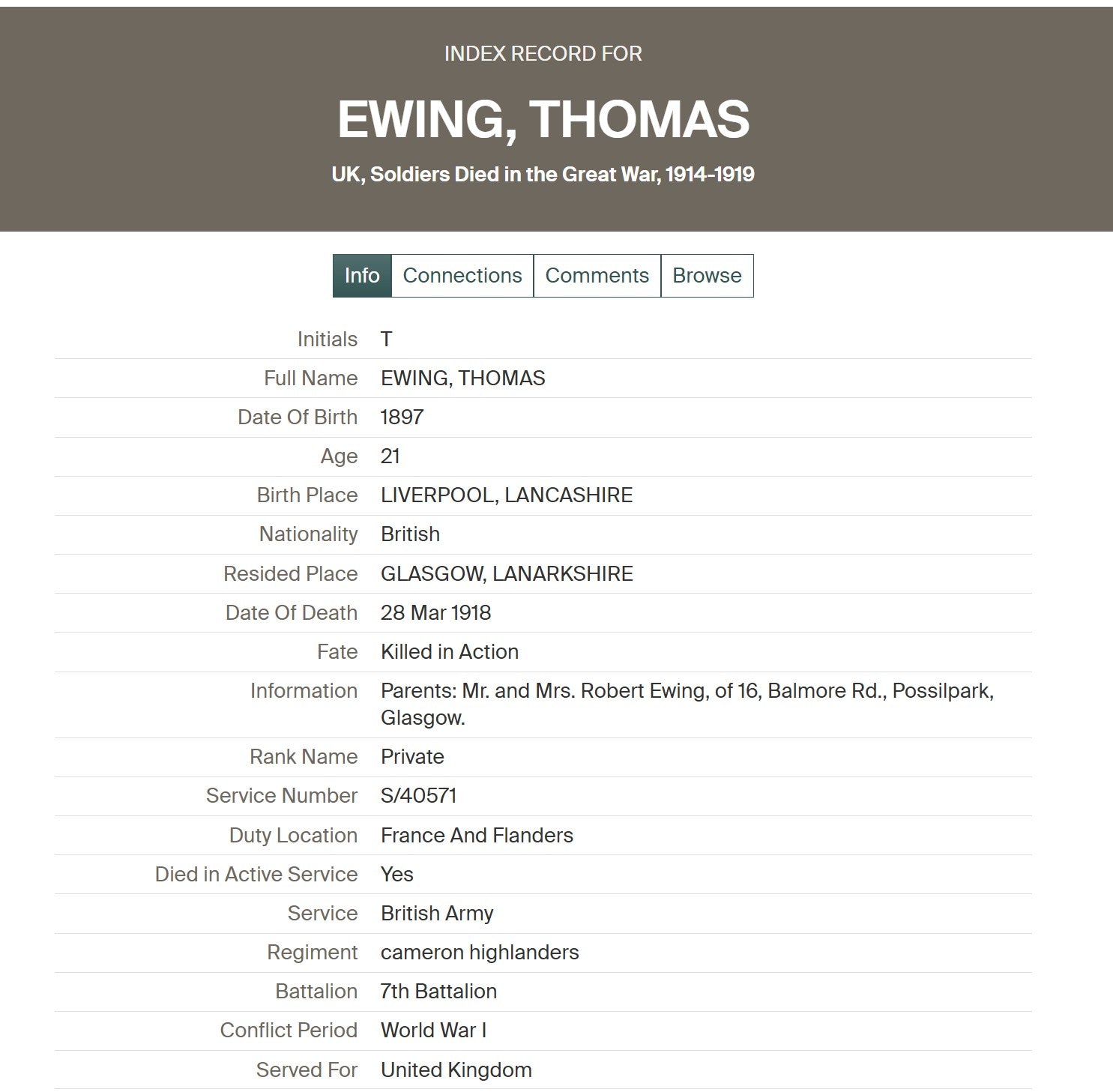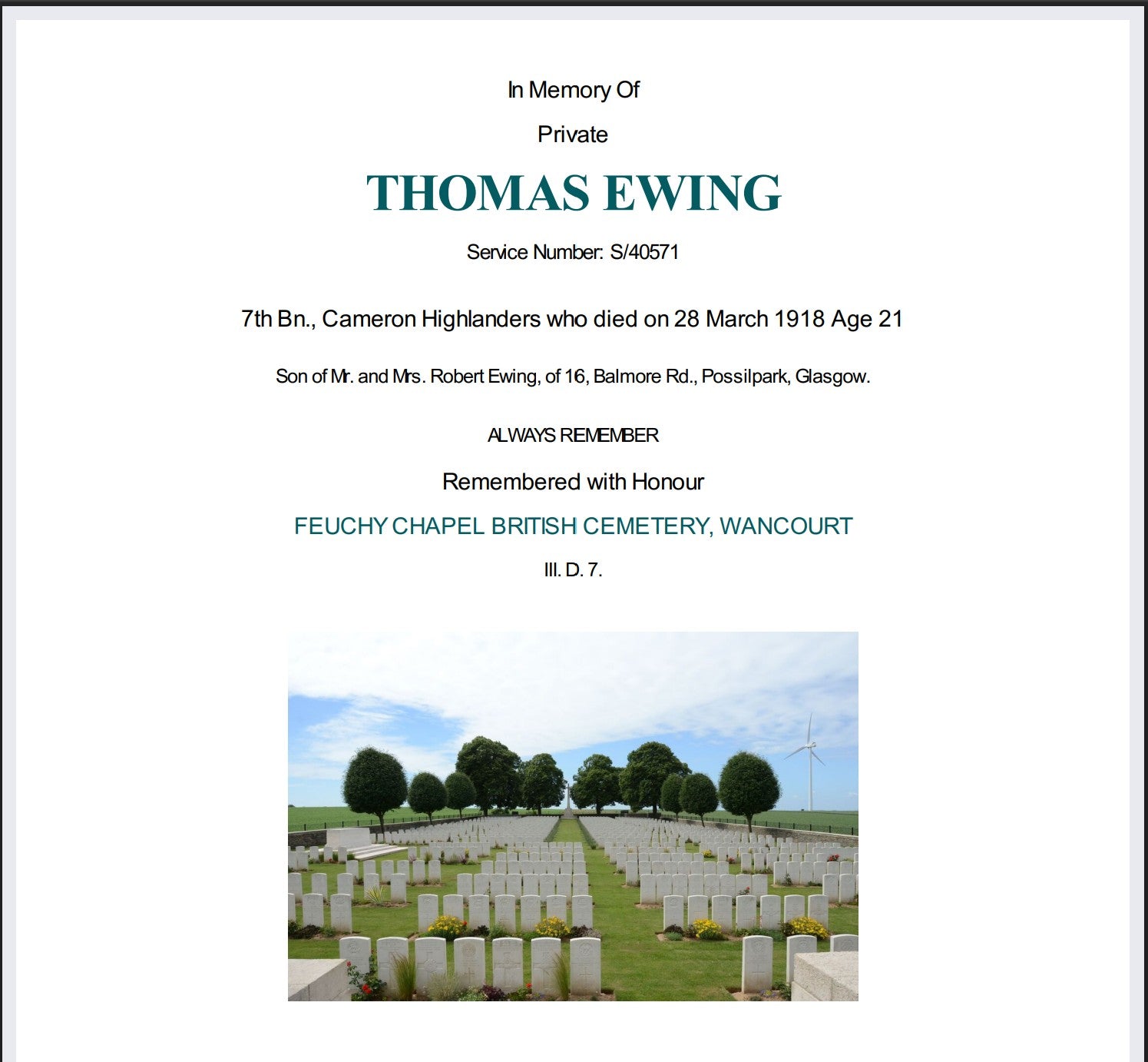 Thomas Ewing’s service represents that of a young Highland infantryman who served with the 7th Camerons on the Western Front and lost his life during one of the most critical phases of the war. His records, casualty listings, medical entry, and burial details provide a clear and well-documented account of his short but active military service.