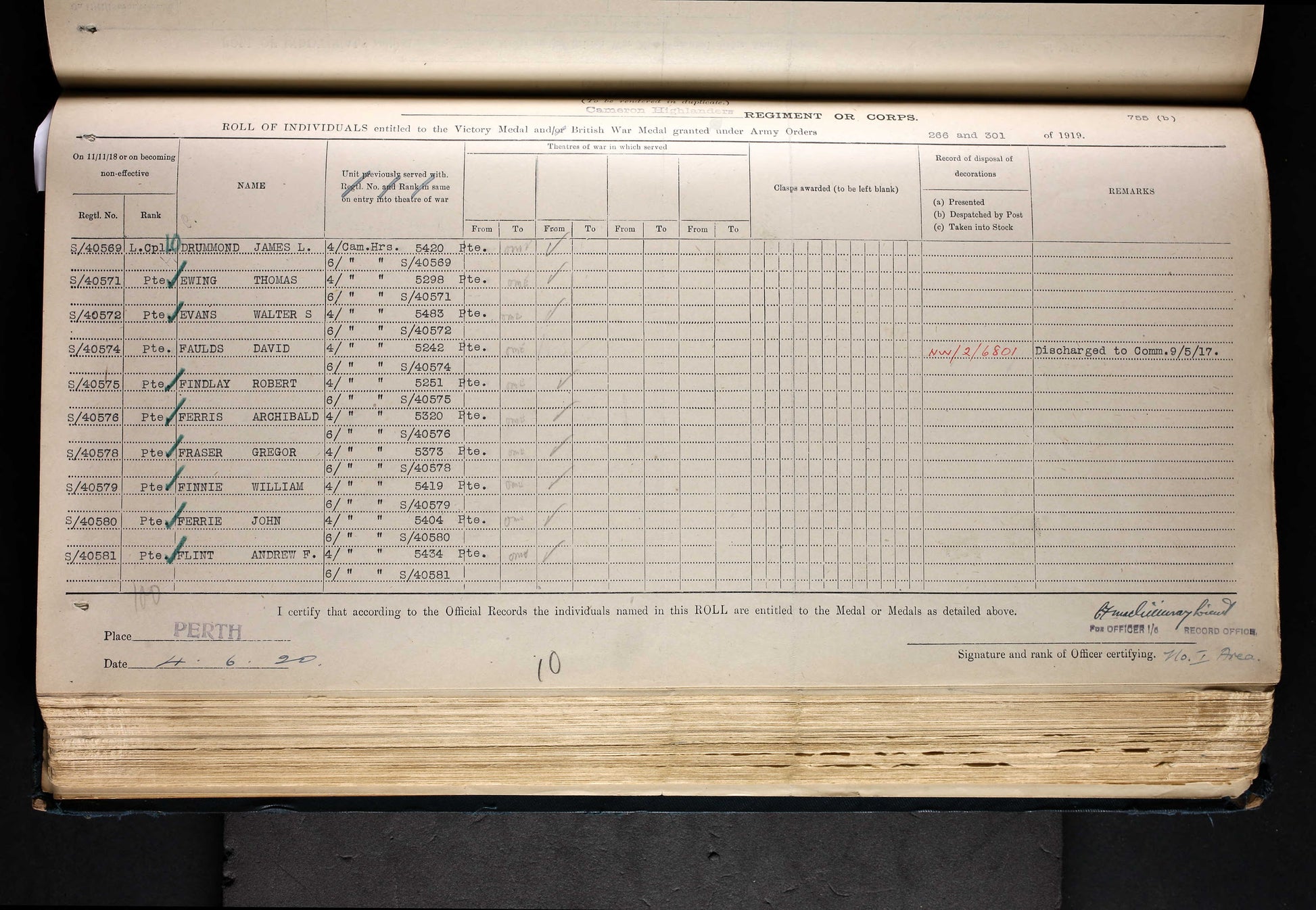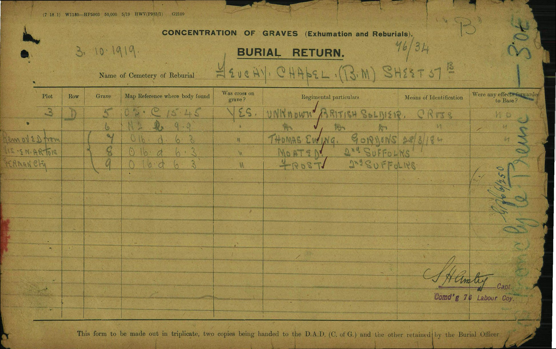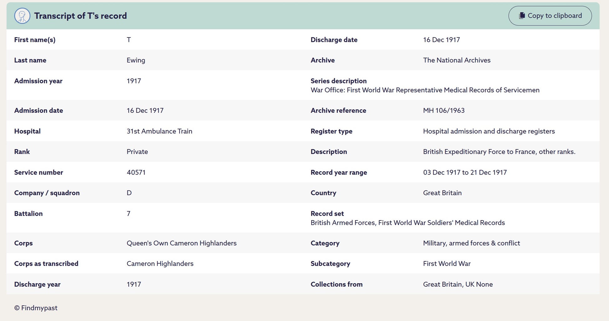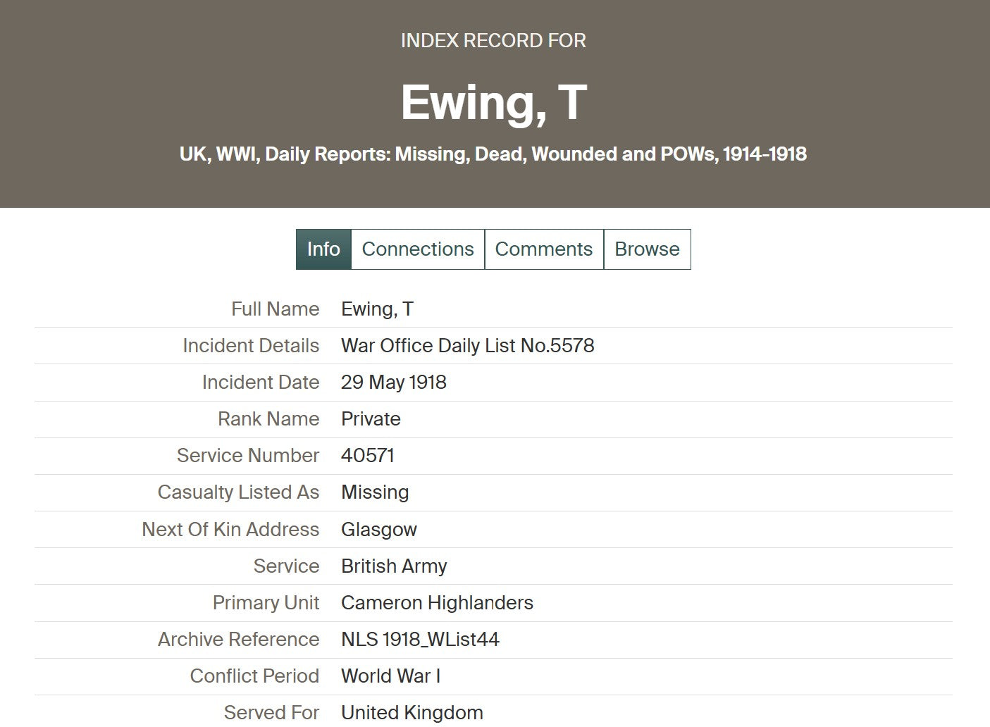 Thomas Ewing’s service represents that of a young Highland infantryman who served with the 7th Camerons on the Western Front and lost his life during one of the most critical phases of the war. His records, casualty listings, medical entry, and burial details provide a clear and well-documented account of his short but active military service.