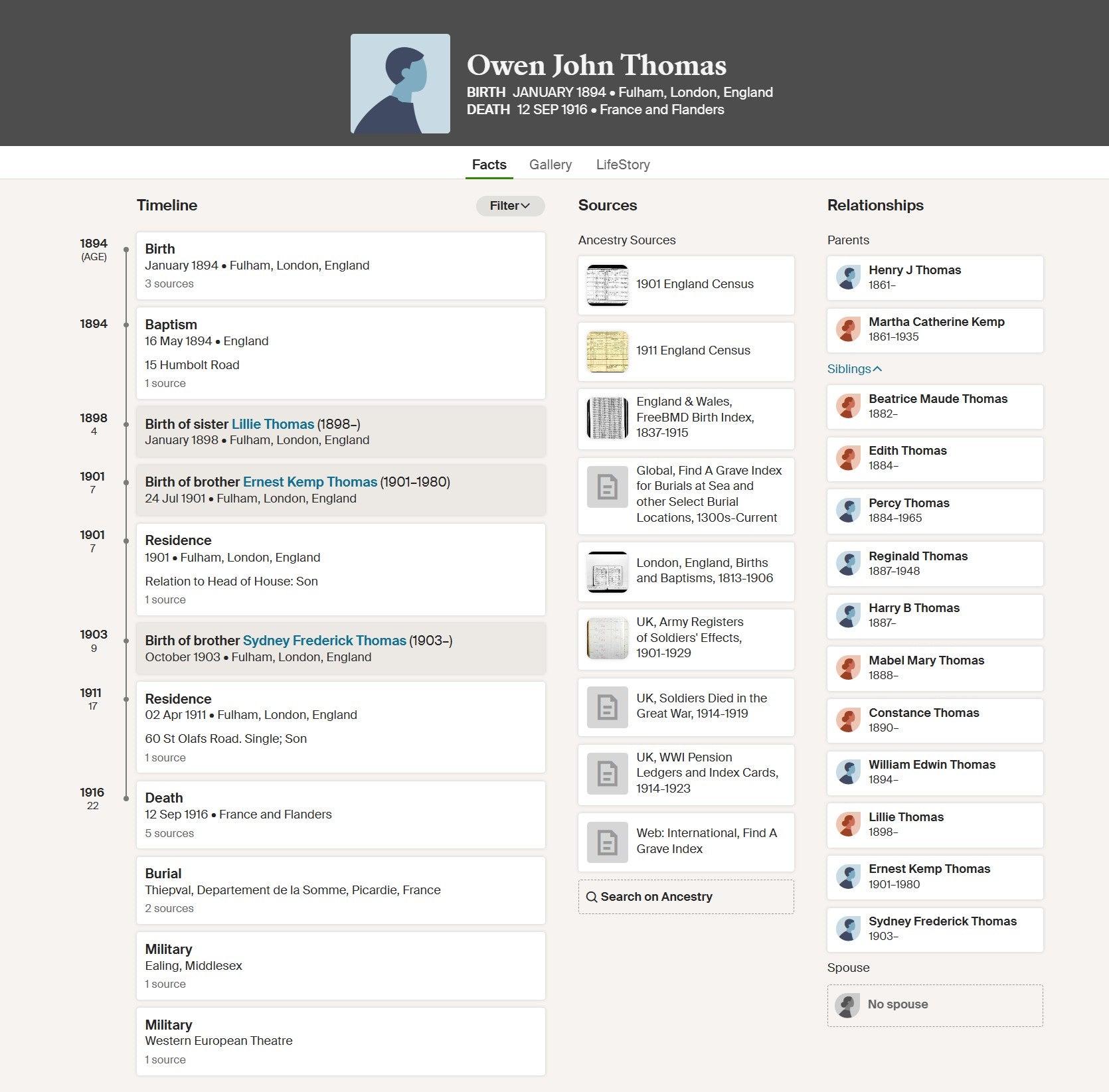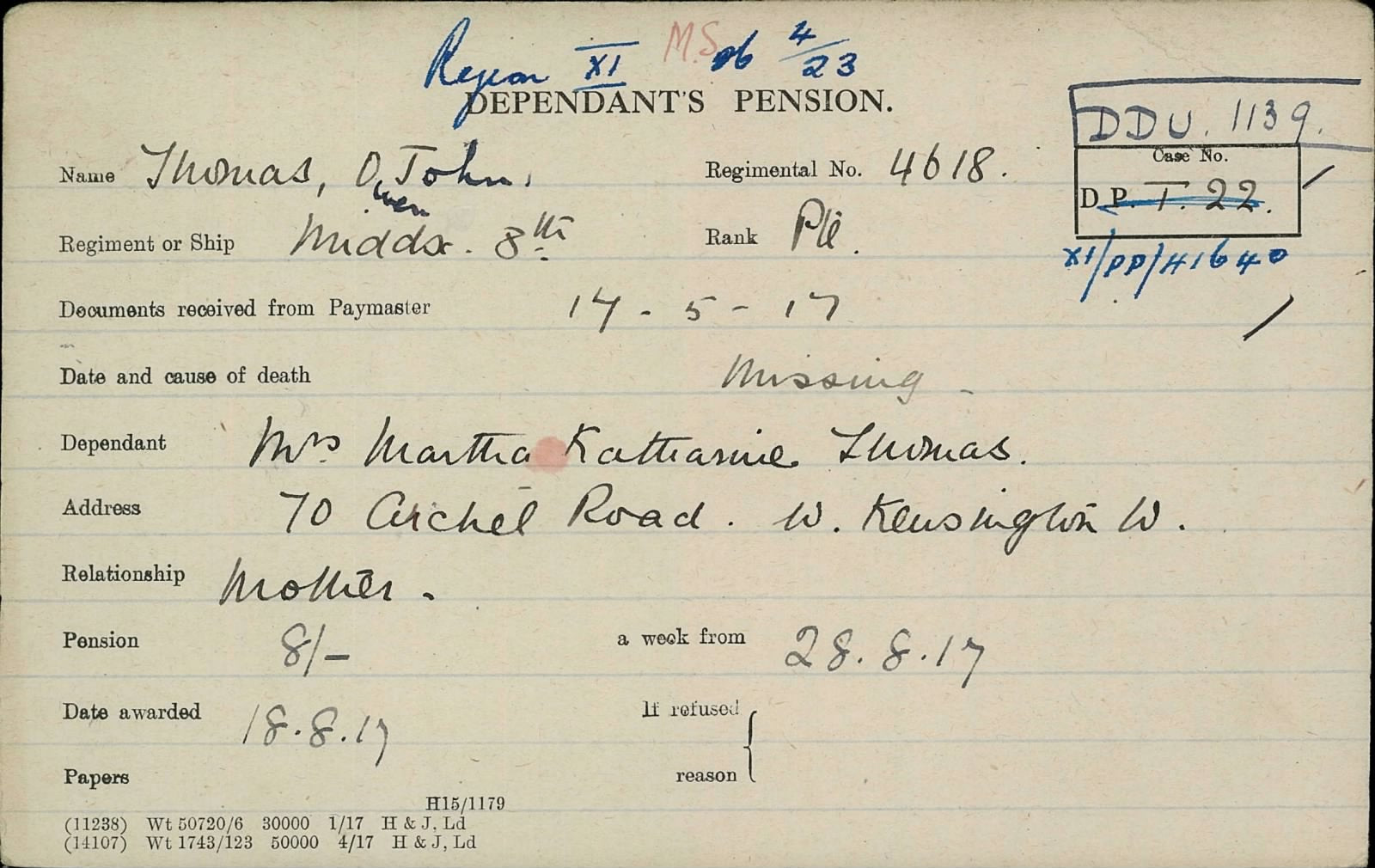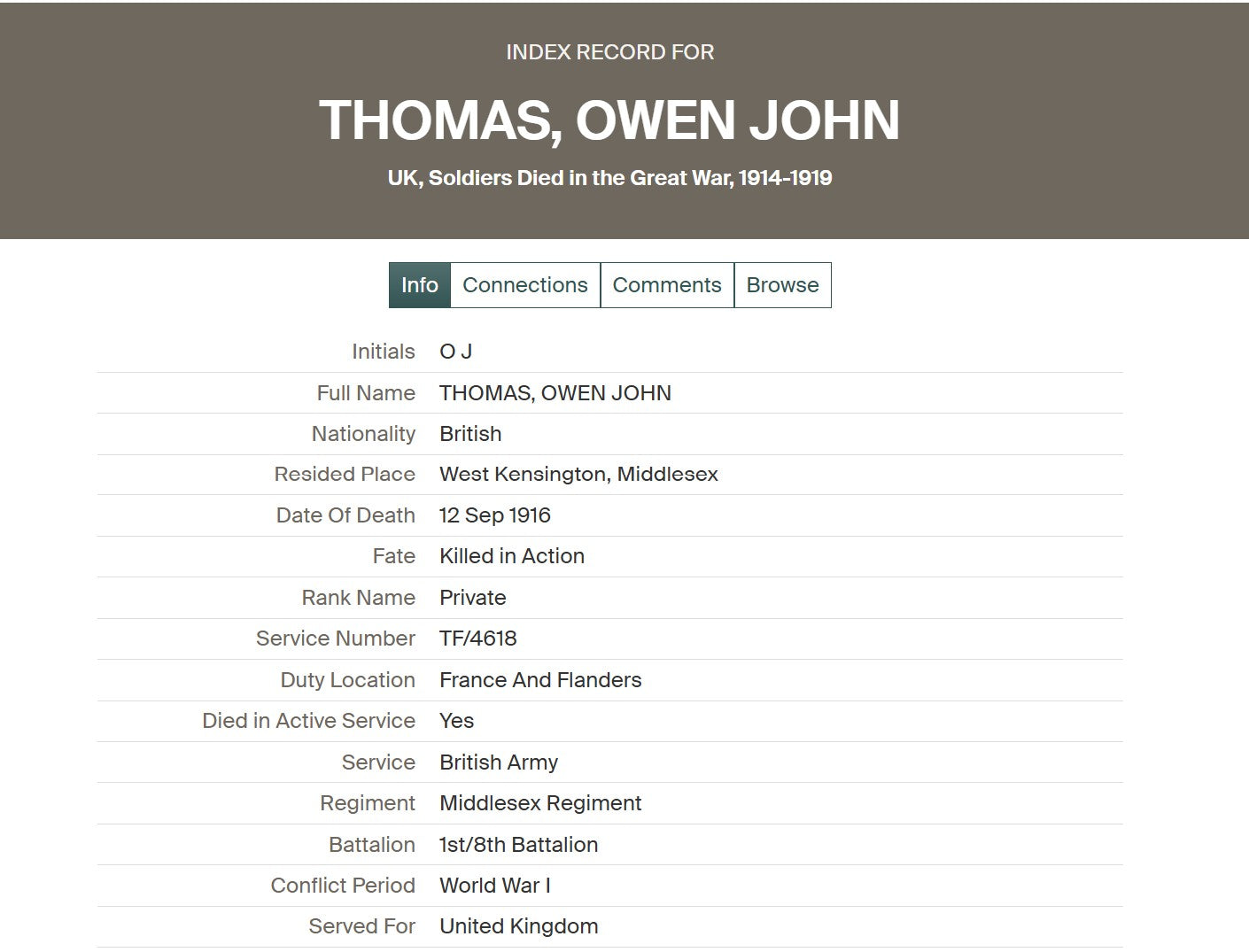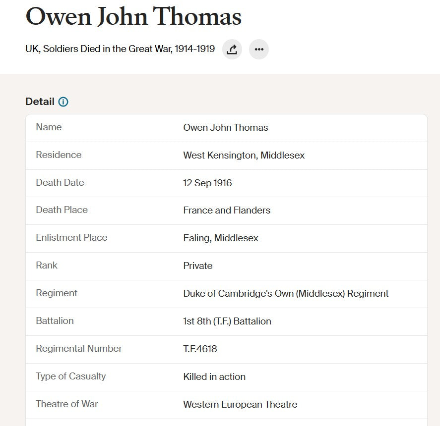 Owen John Thomas was born in January 1894 at Fulham, London, the son of Henry J. Thomas and Martha Catherine (née Kemp). He was raised in Fulham, appearing with his family in both the 1901 and 1911 Census, and by 1911 was living at 60 St Olafs Road, Fulham, where he was employed as a shop assistant. Coming from a large working-class household, Owen was one of several siblings, many of whom were still children when war broke out.