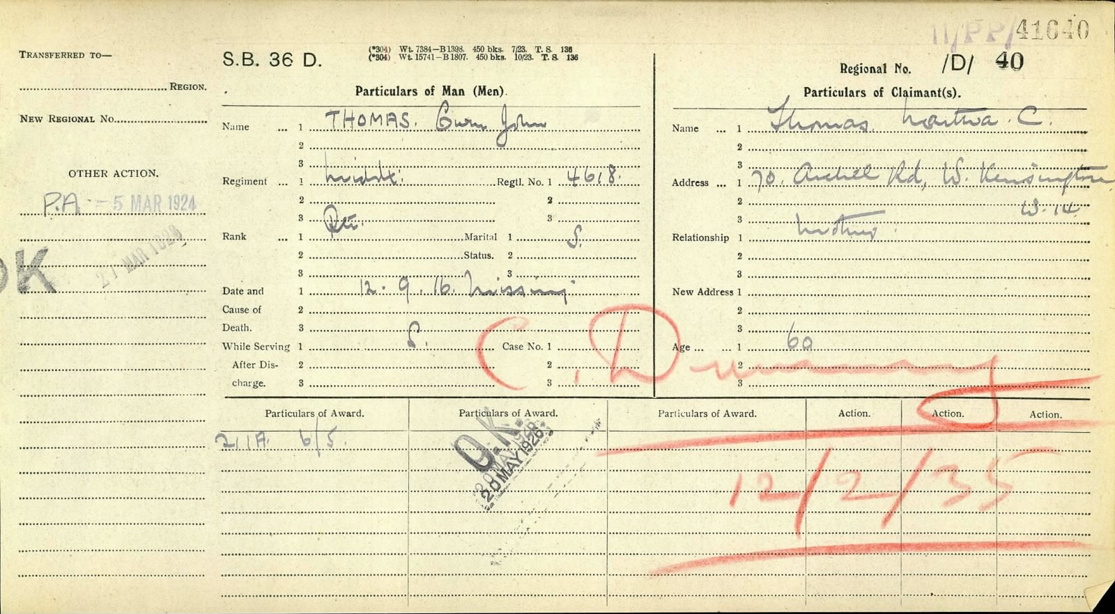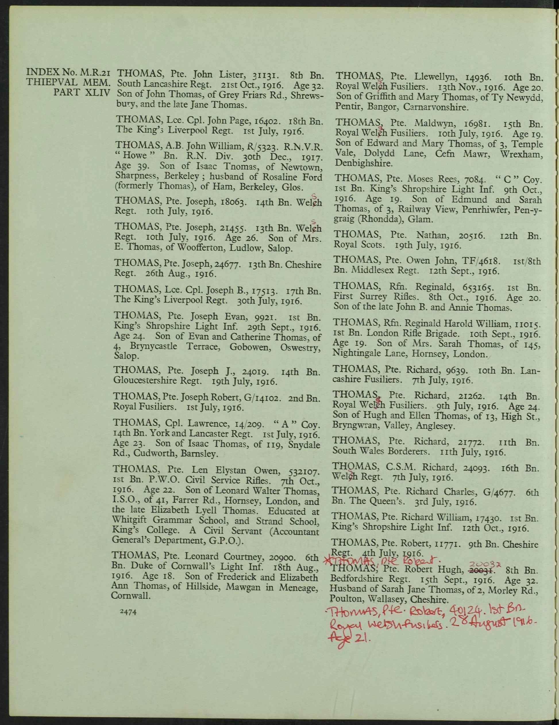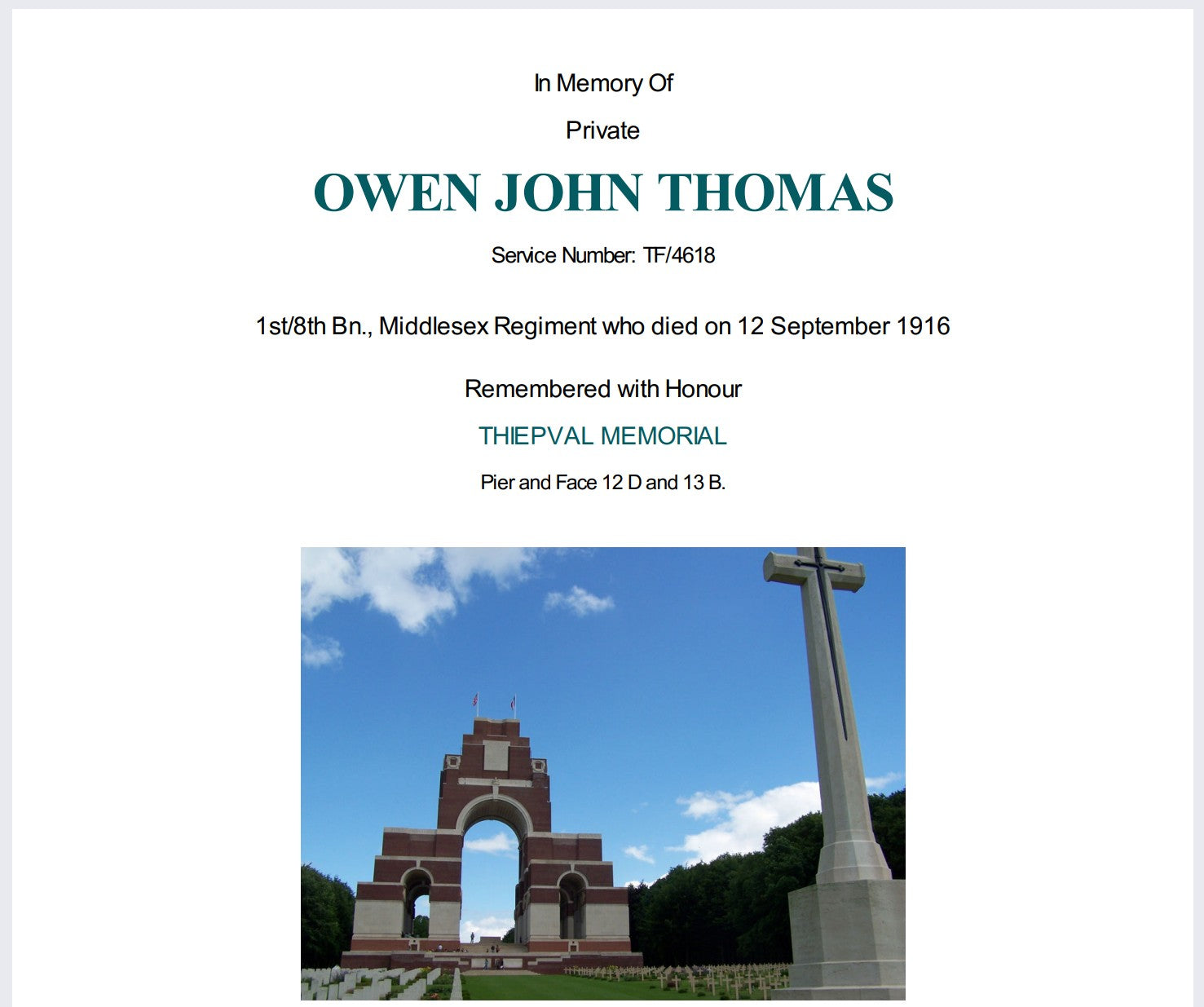 Private Owen John Thomas was killed in action on 12 September 1916, during these Somme operations. He was 22 years old.