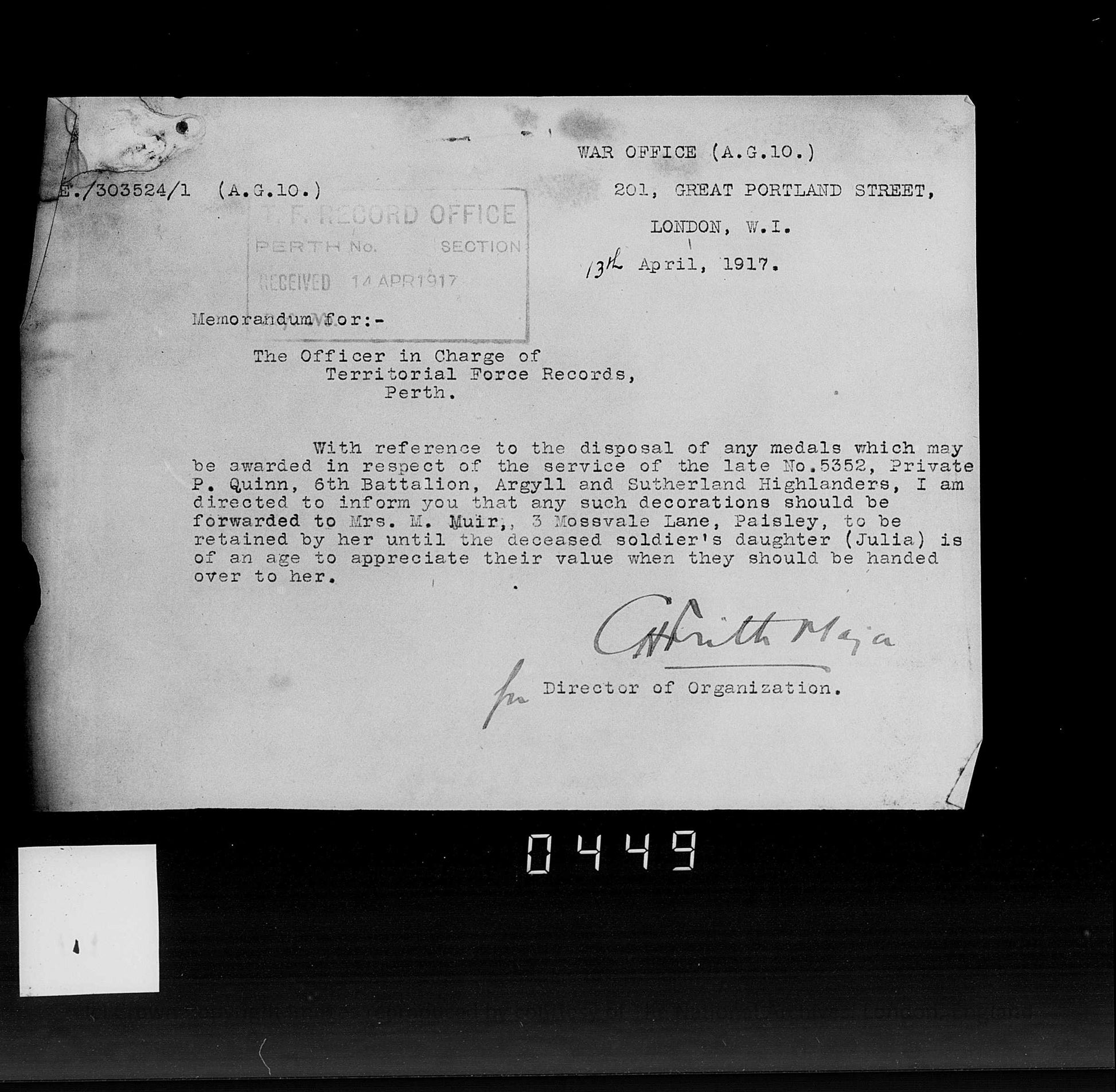 Victory Medal - 5352 PTE. P. QUINN. A. & S. HIGHRS.