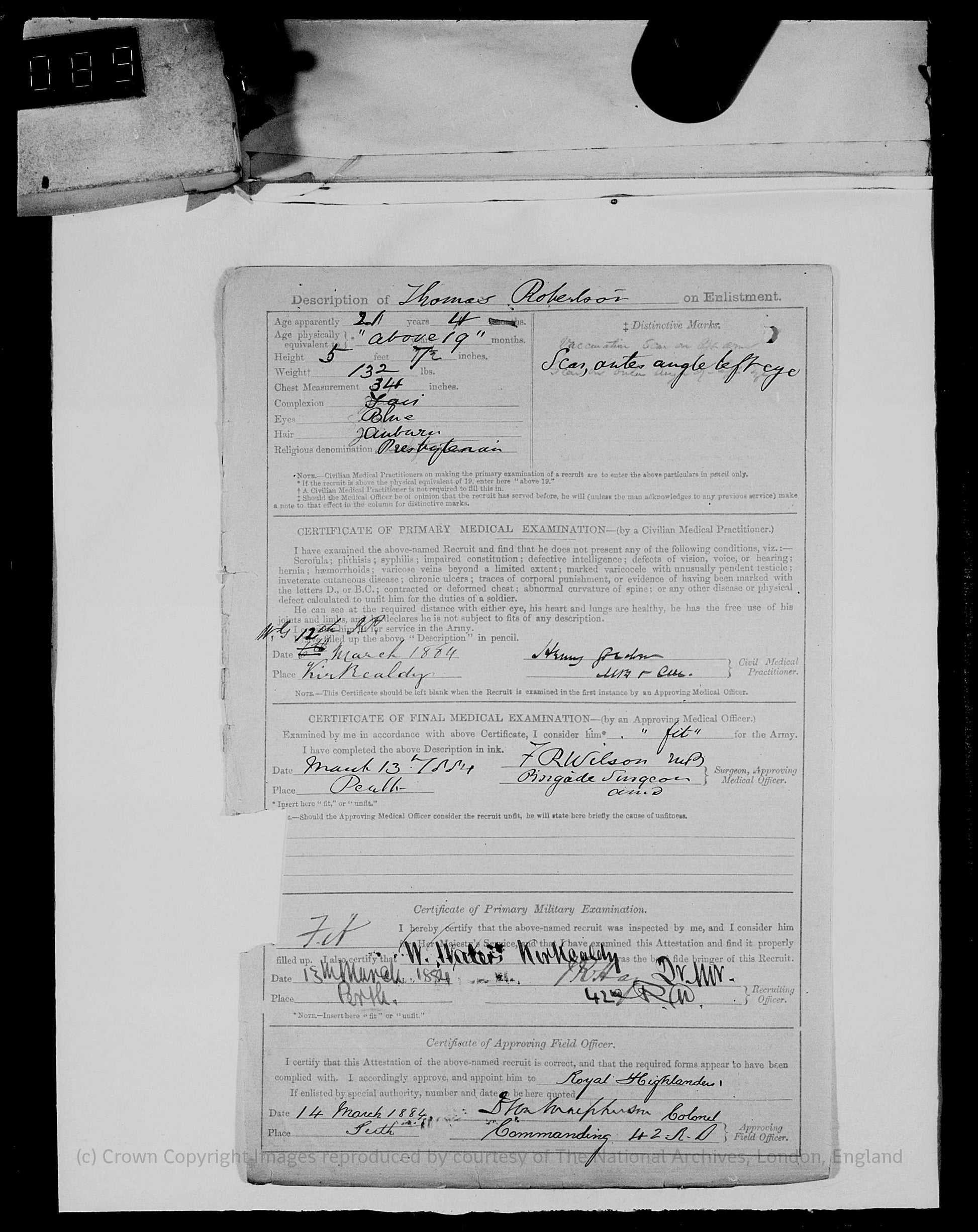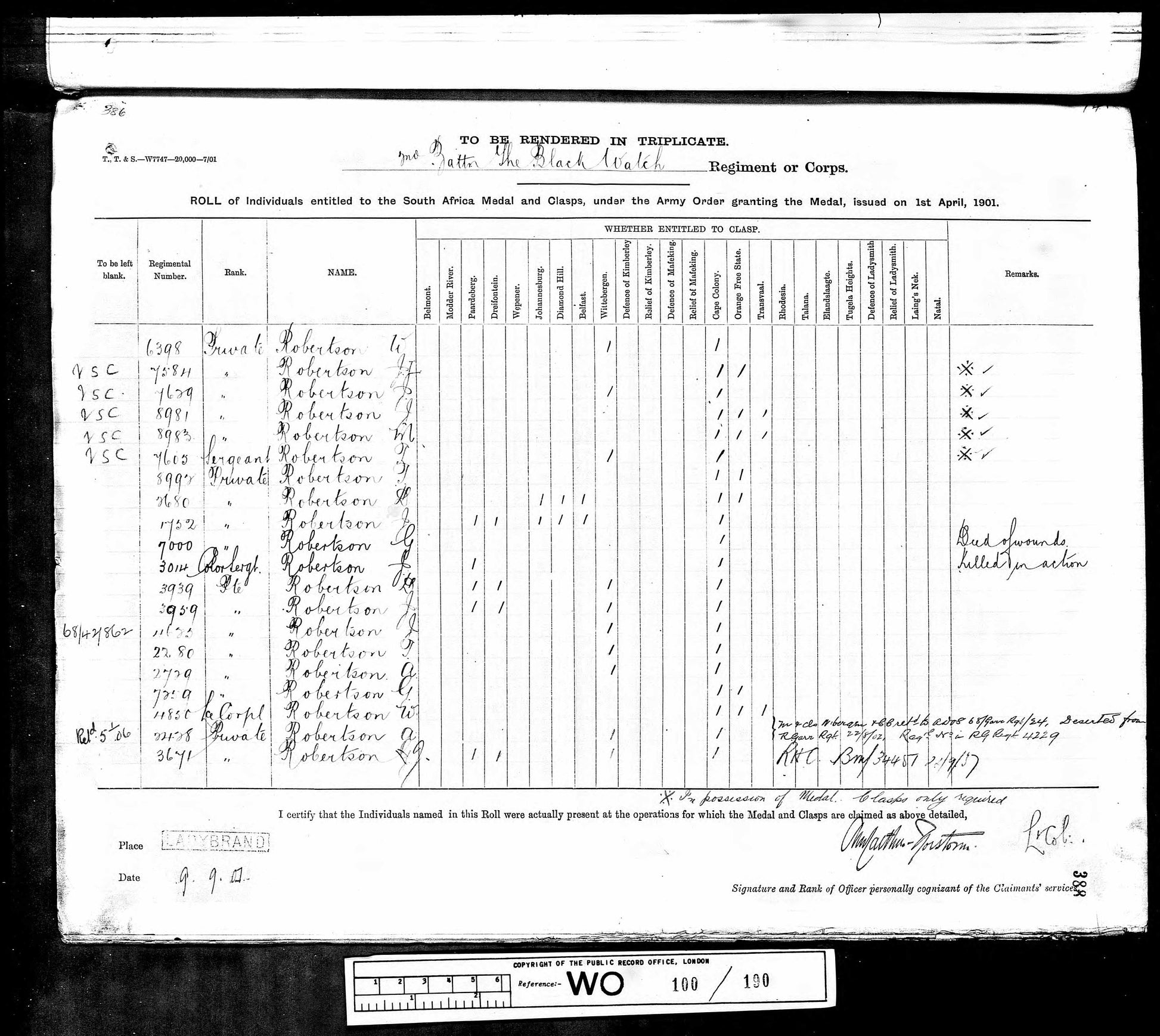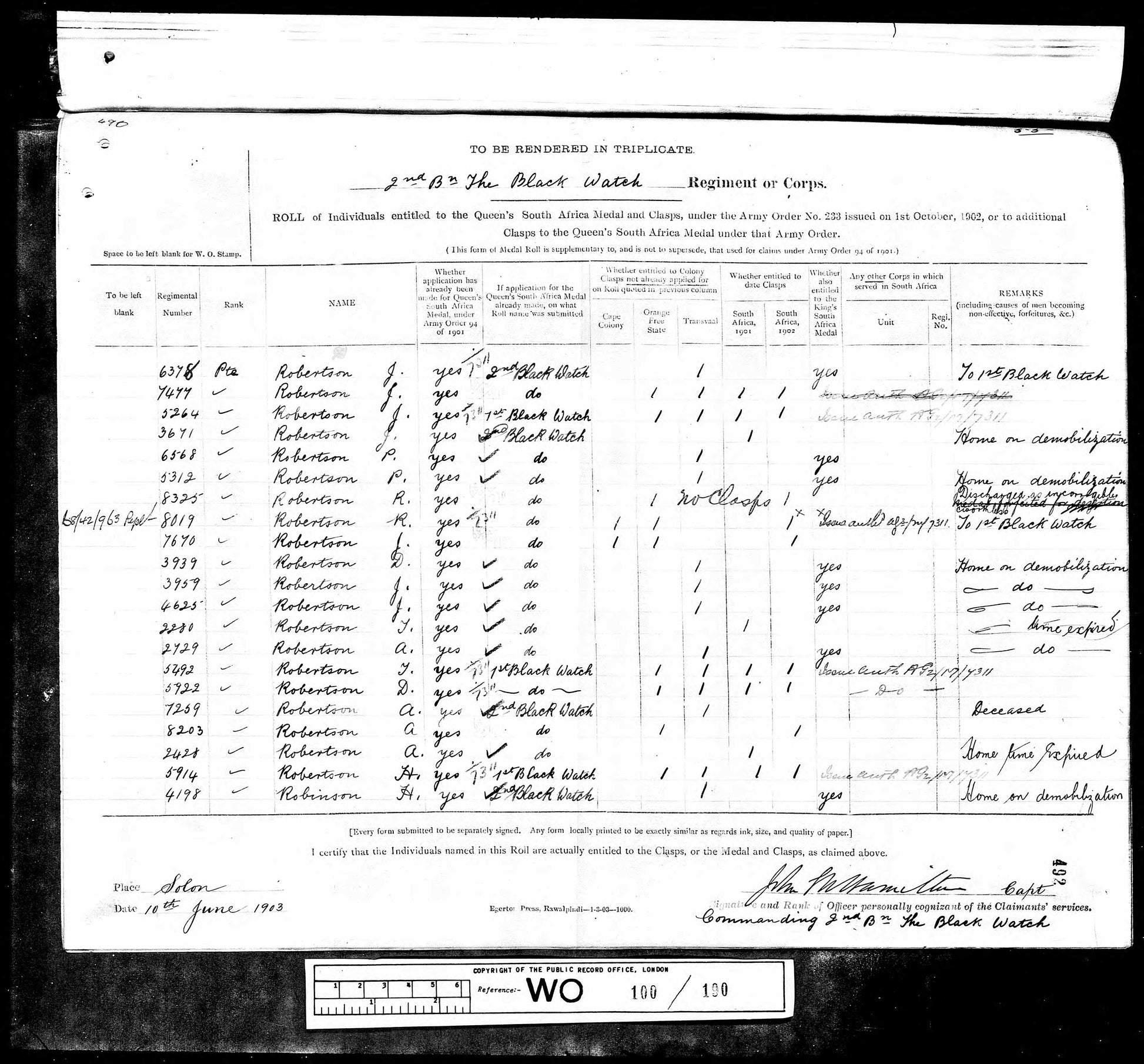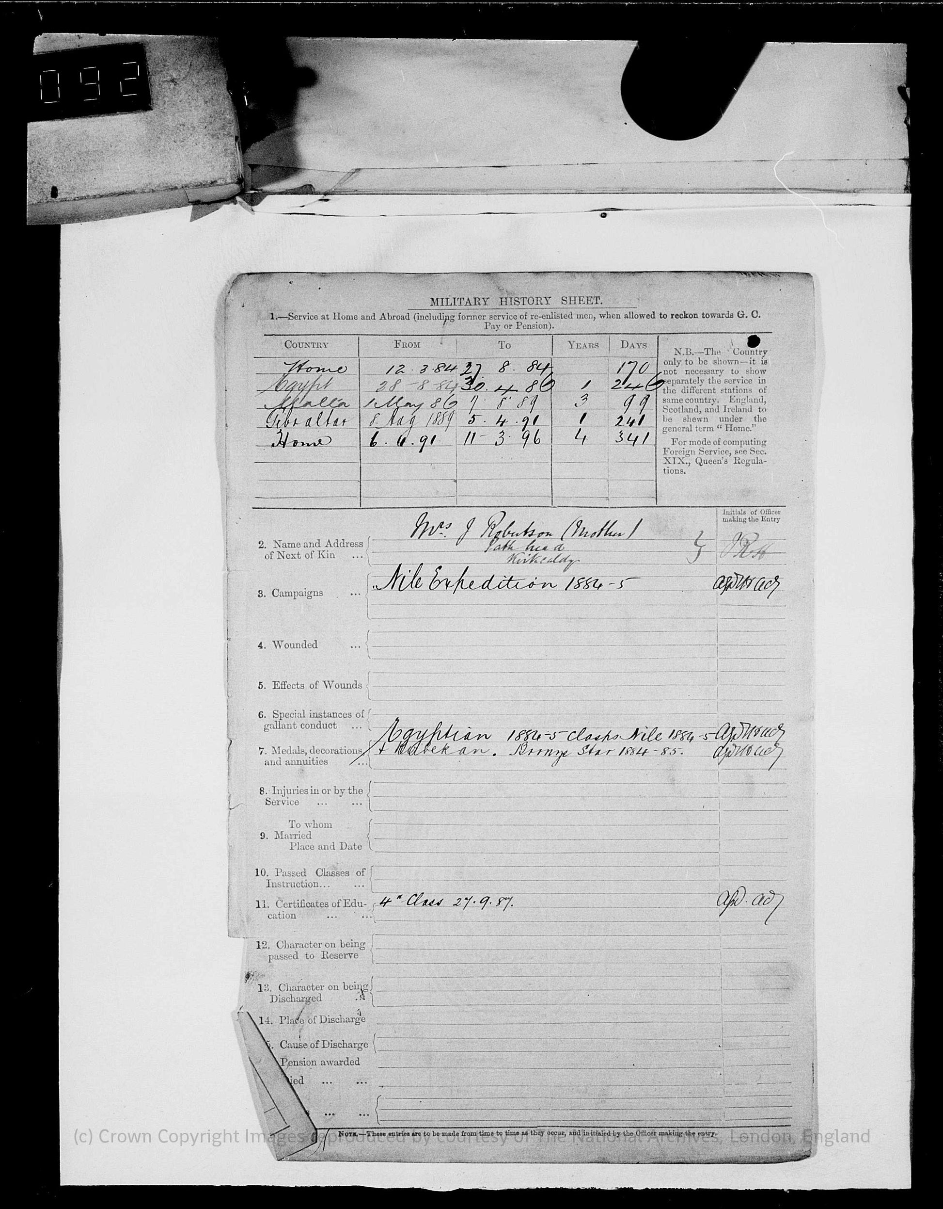 Private Robertson saw active service during the Nile Expedition 1884-5 and was awarded the Egyptian Medal 1884-5, clasps Nile 1884-5 & Kirbekan, as well as the Khedive's Bronze Star. For his service during the Boer War he received the Queen's South Africa Medal.