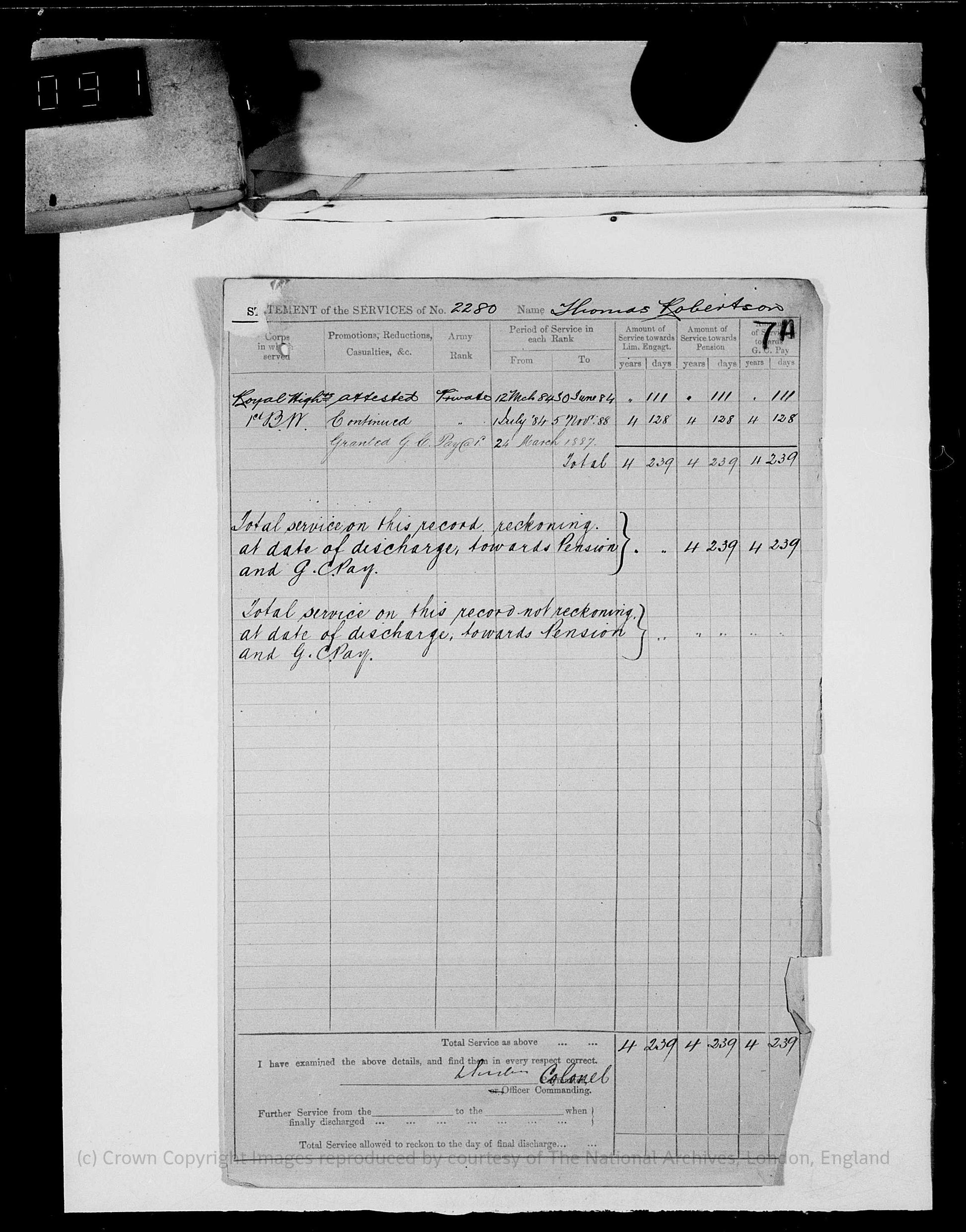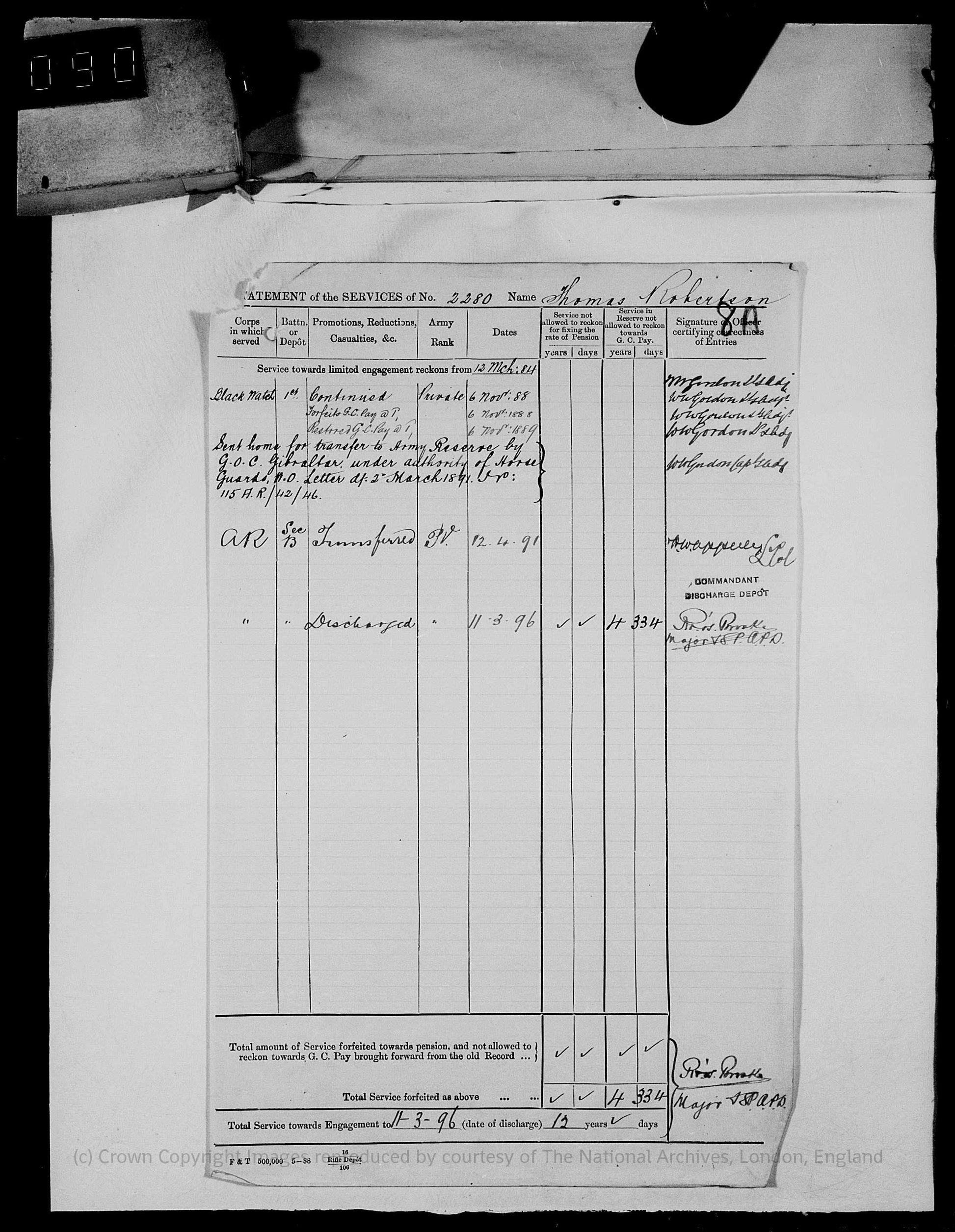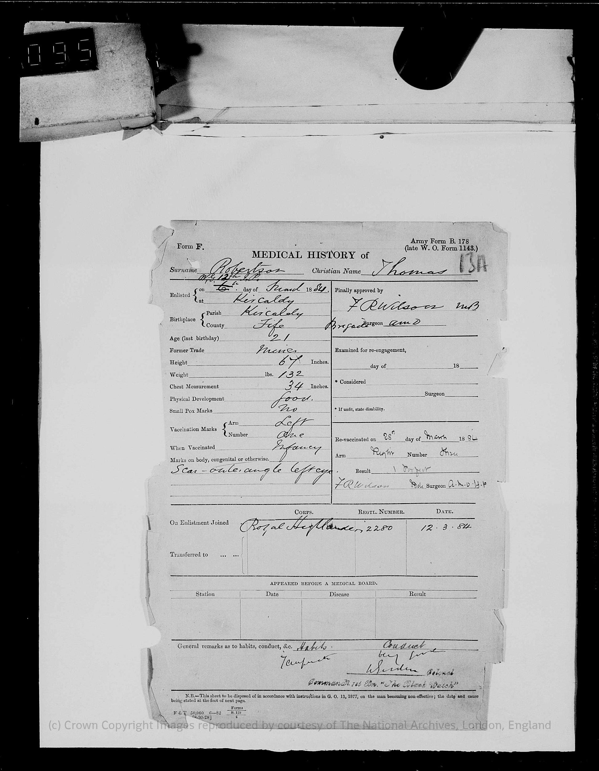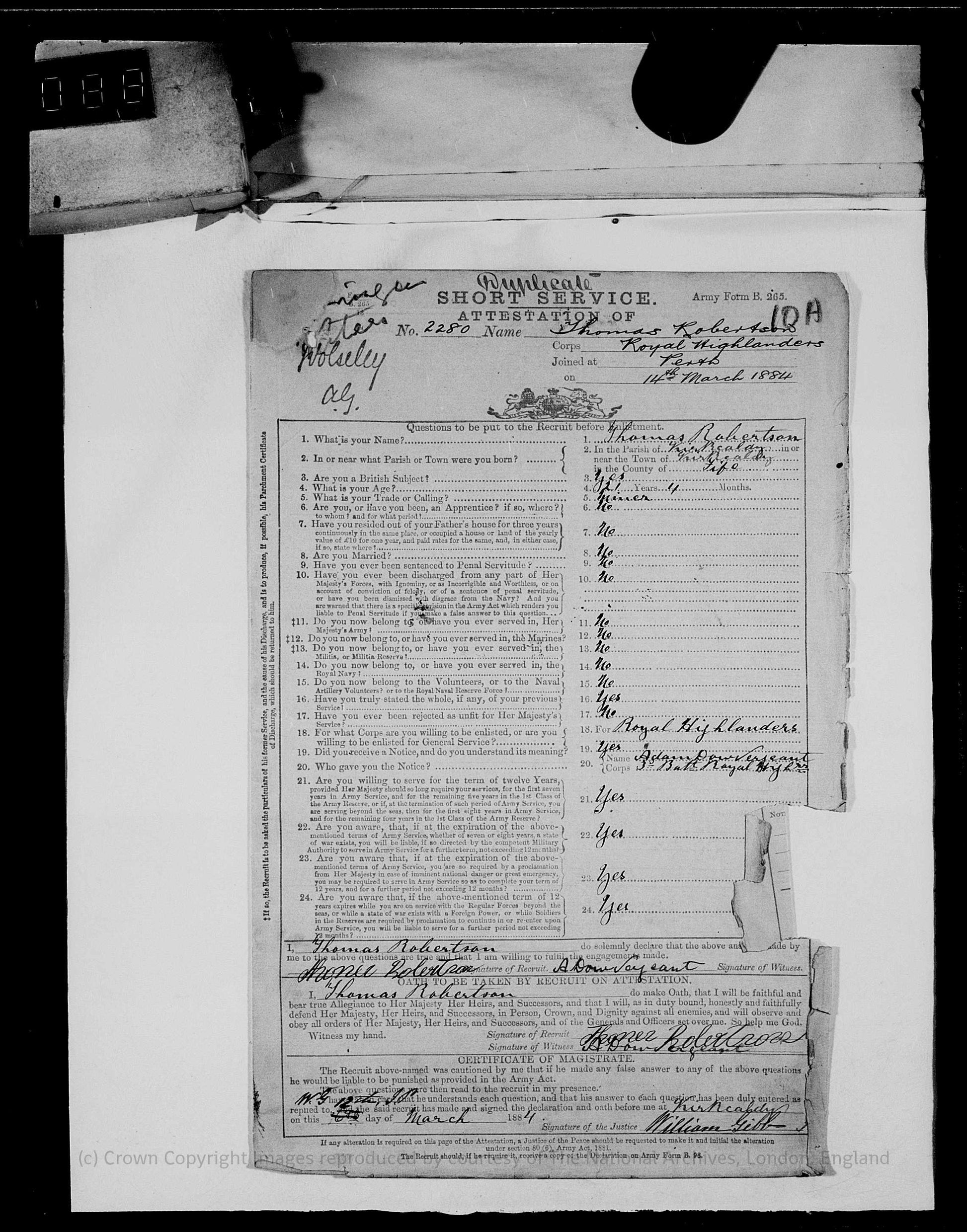 Private Robertson saw active service during the Nile Expedition 1884-5 and was awarded the Egyptian Medal 1884-5, clasps Nile 1884-5 & Kirbekan, as well as the Khedive's Bronze Star. For his service during the Boer War he received the Queen's South Africa Medal.