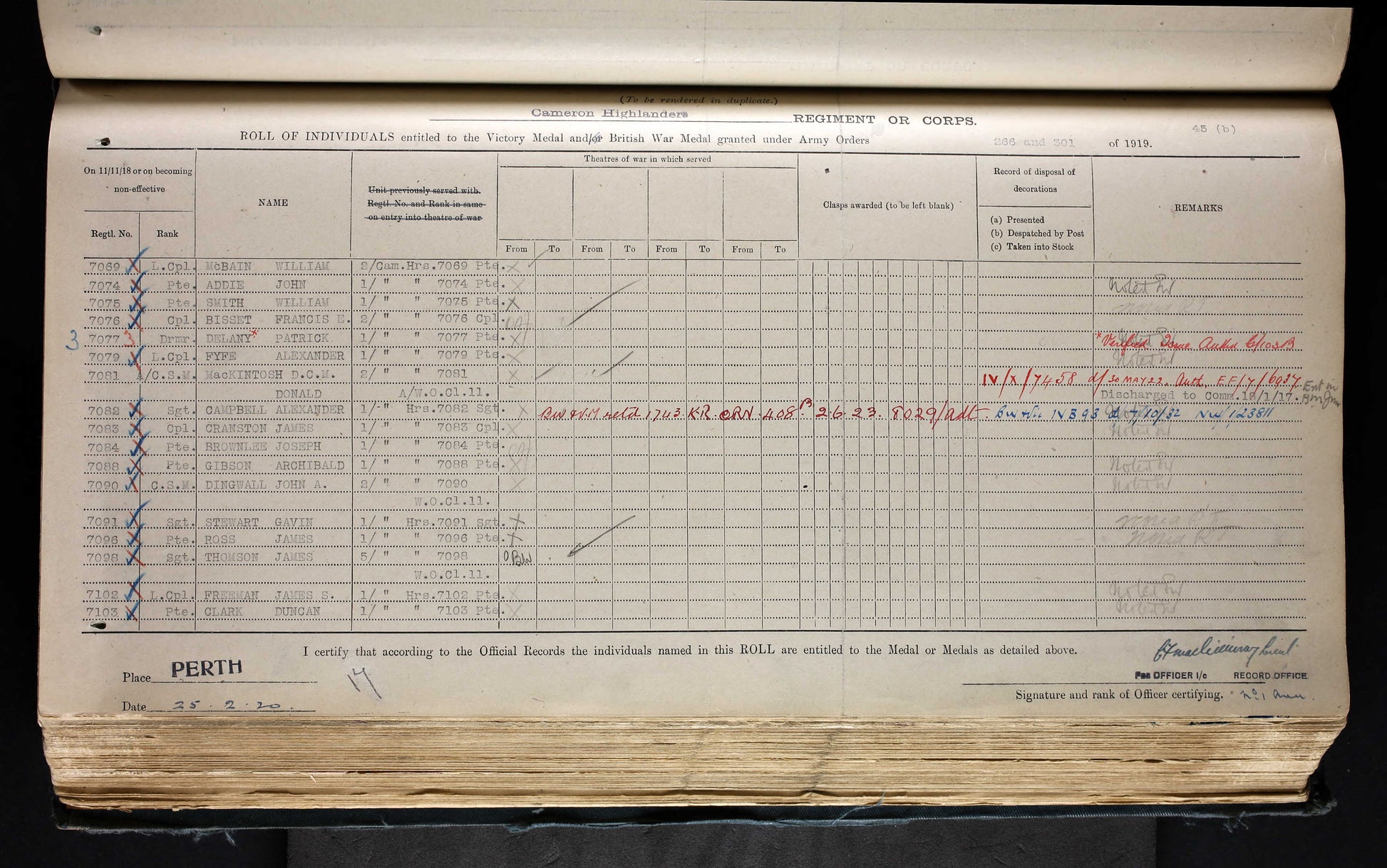 Victory Medal – 7069 PTE. W. MC BAIN. CAM'N HIGHRS.