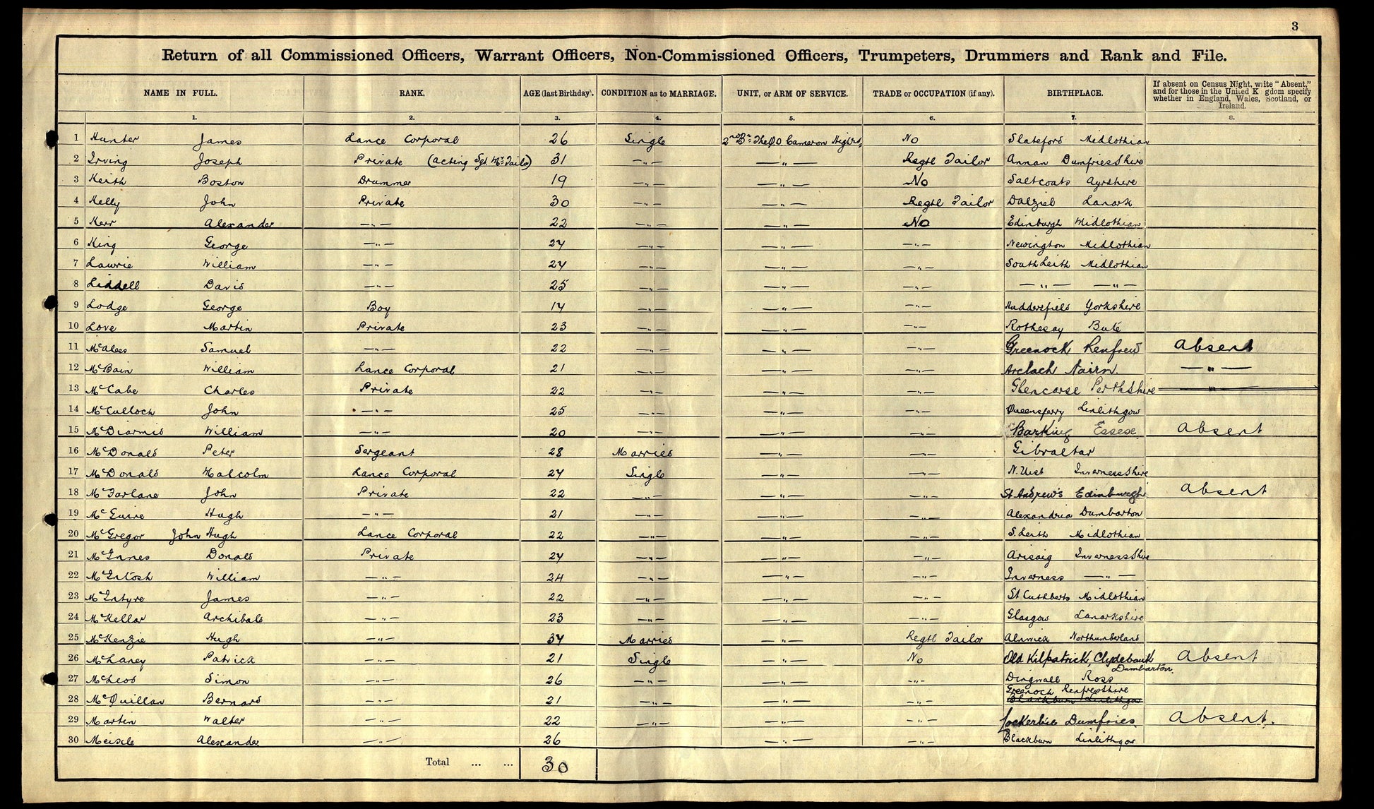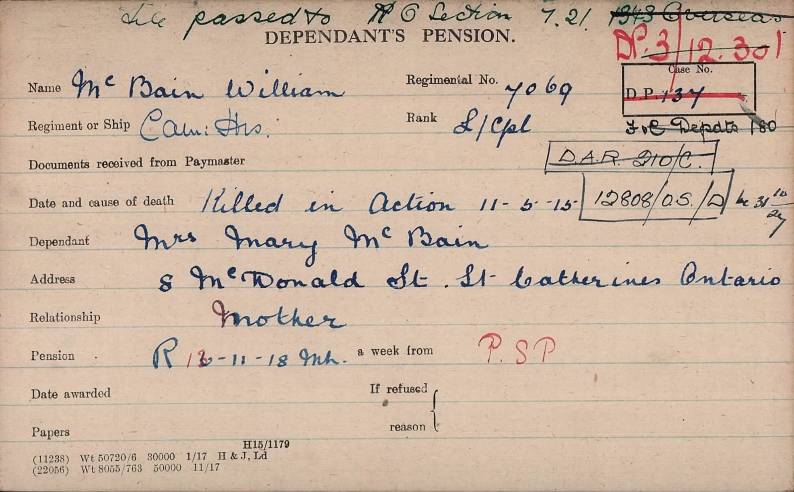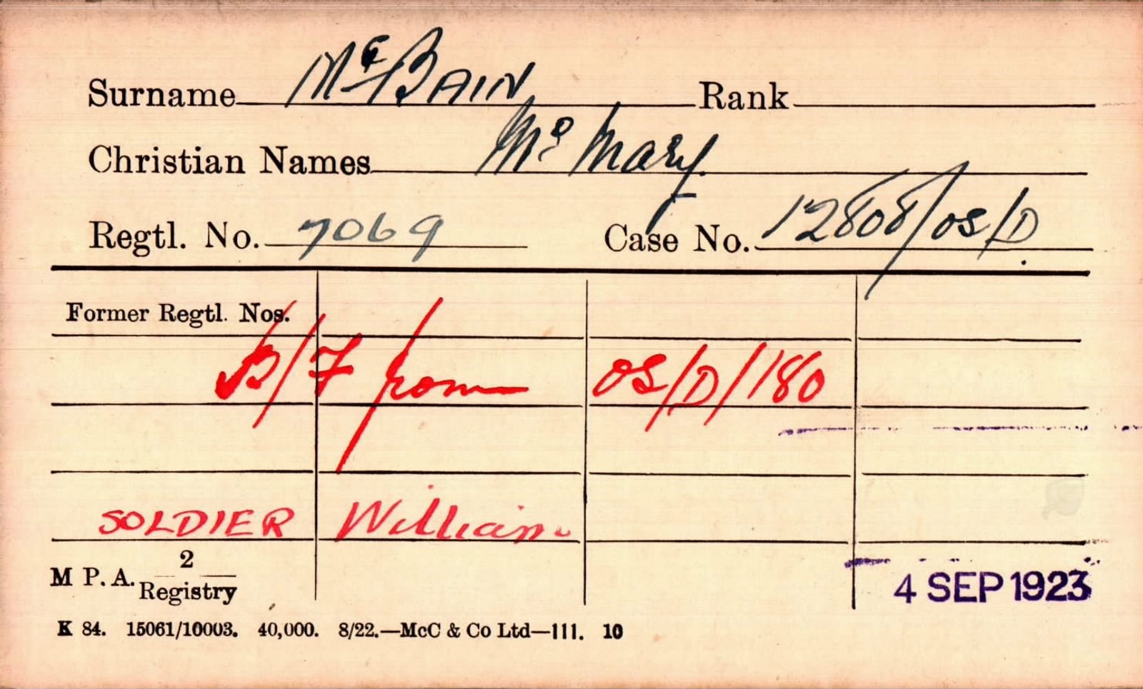William McBain was born at Archlach, near Nairn, Nairnshire, and was later resident at Kingussie, Inverness-shire. He was the son of John and Mary McBain, who in later years emigrated to Irma, Alberta, Canada. McBain appears in the 1911 Census as a 21-year-old serving soldier, already holding the rank of Lance Corporal, indicating a lengthy period of prior military service before the outbreak of the Great War.