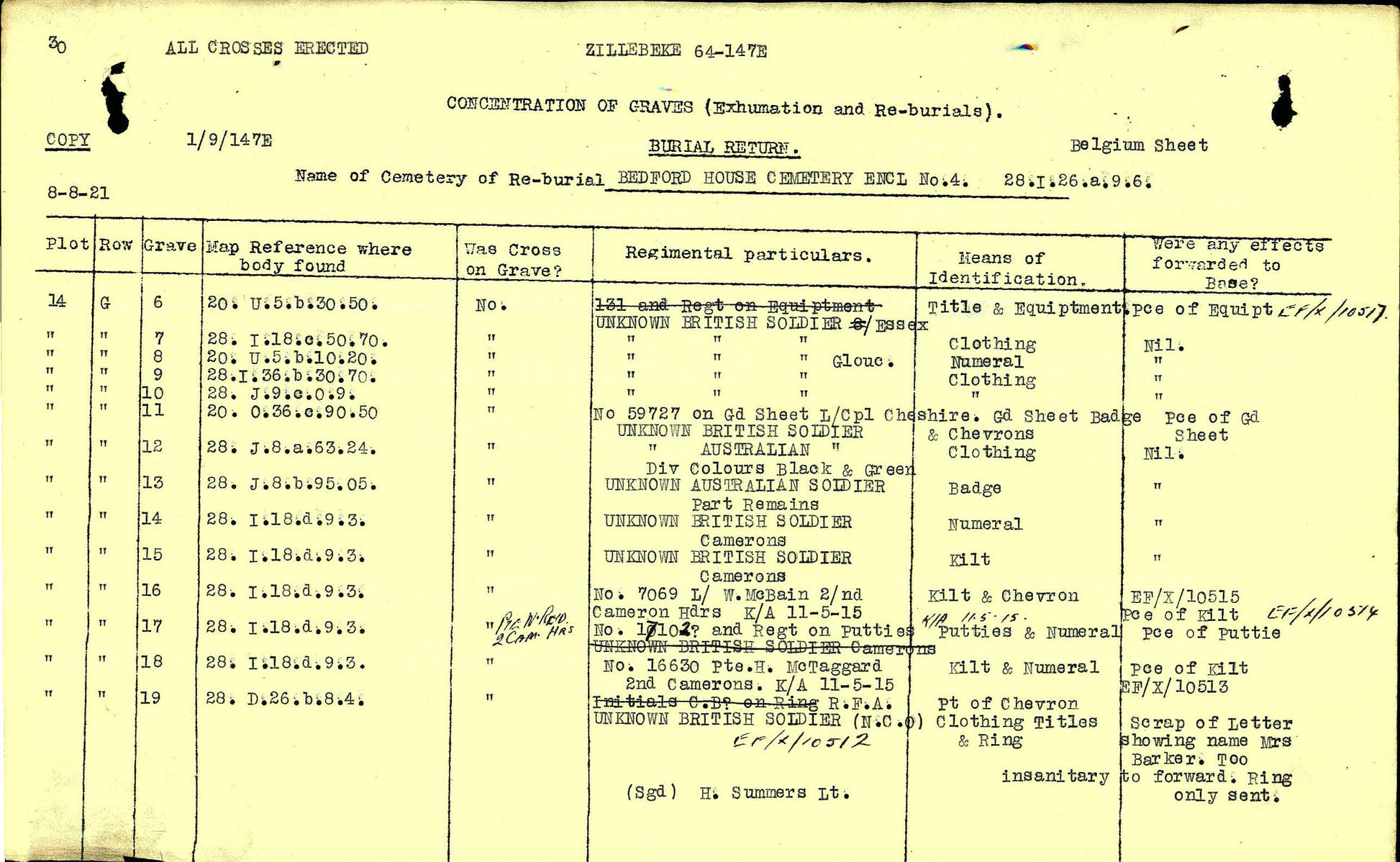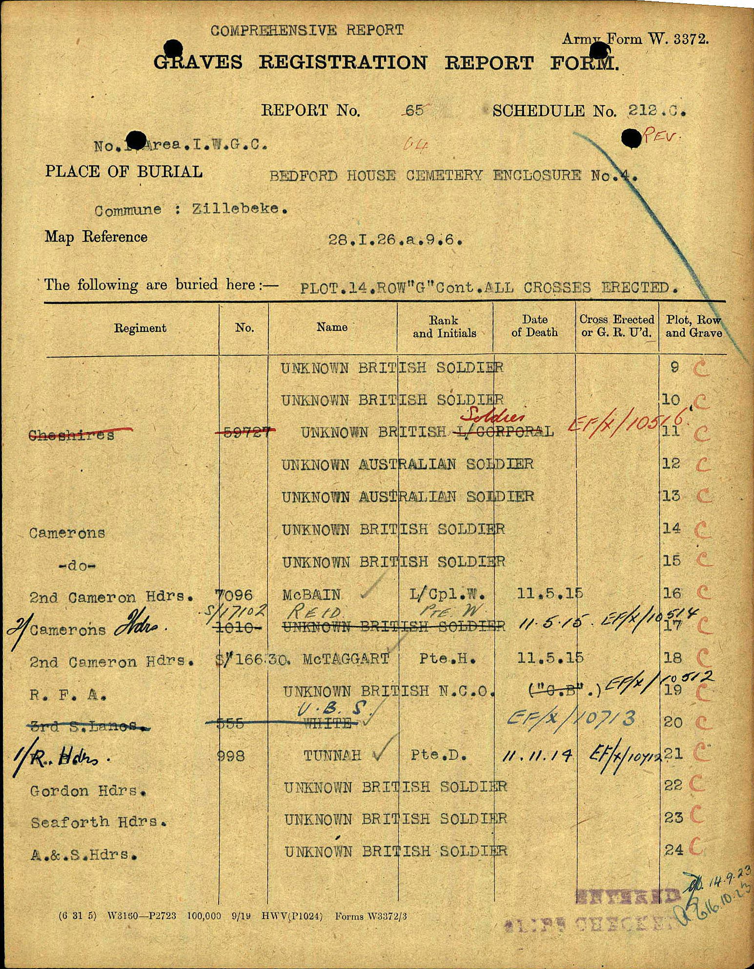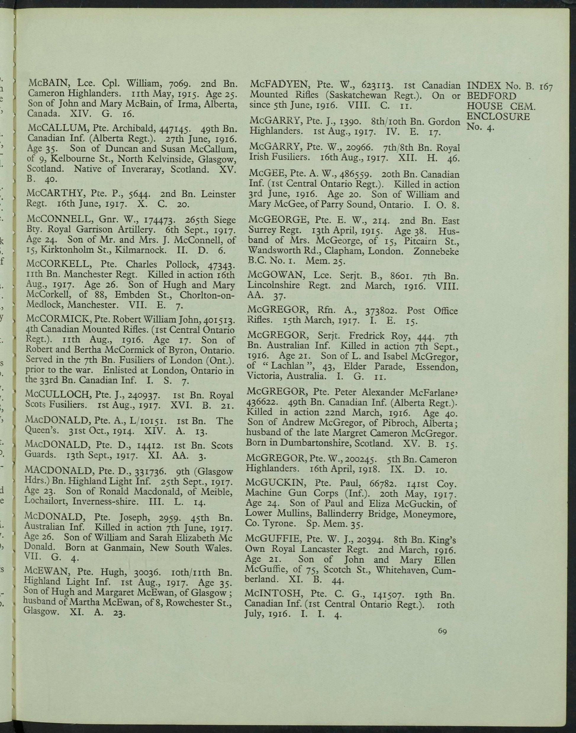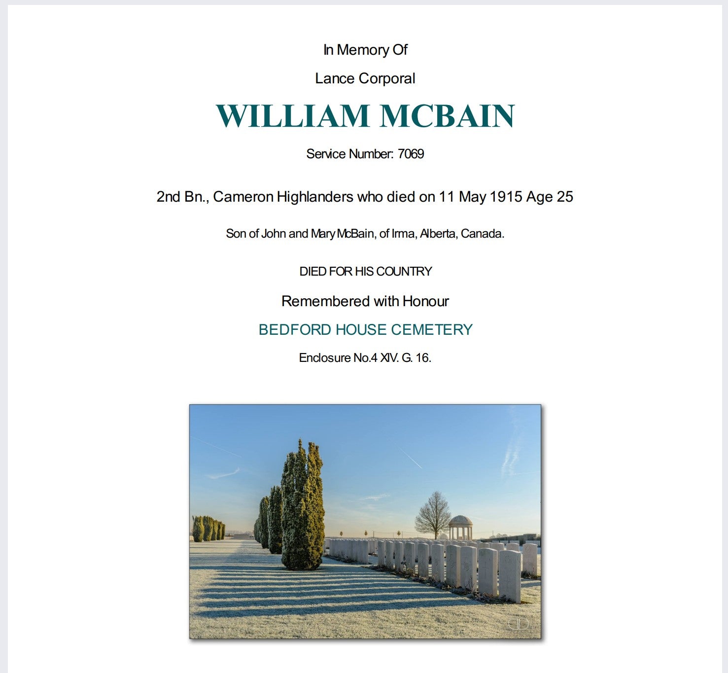 McBain is buried at Bedford House Cemetery, near Ypres, Belgium, Enclosure No. 4, Grave XIV.G.16. His headstone records his rank as Lance Corporal, his service with the 2nd Battalion, Cameron Highlanders, and commemorates him as the son of John and Mary McBain of Irma, Alberta, Canada, reflecting the family’s later emigration. The cemetery itself is one of the most significant burial grounds associated with the fighting around Ypres and contains the graves of many men who fell during the early gas battles of 1915.
