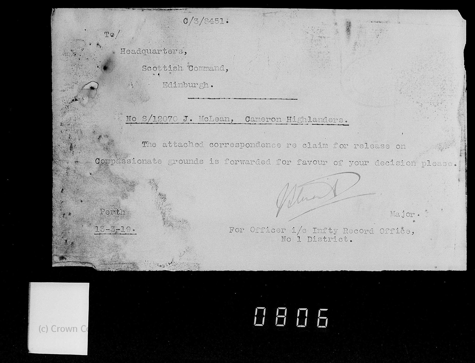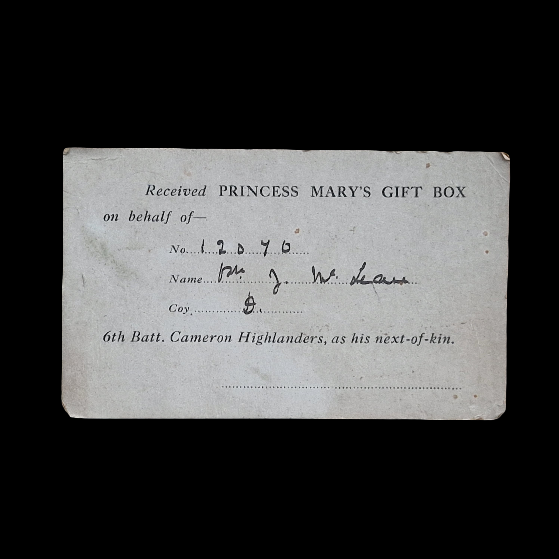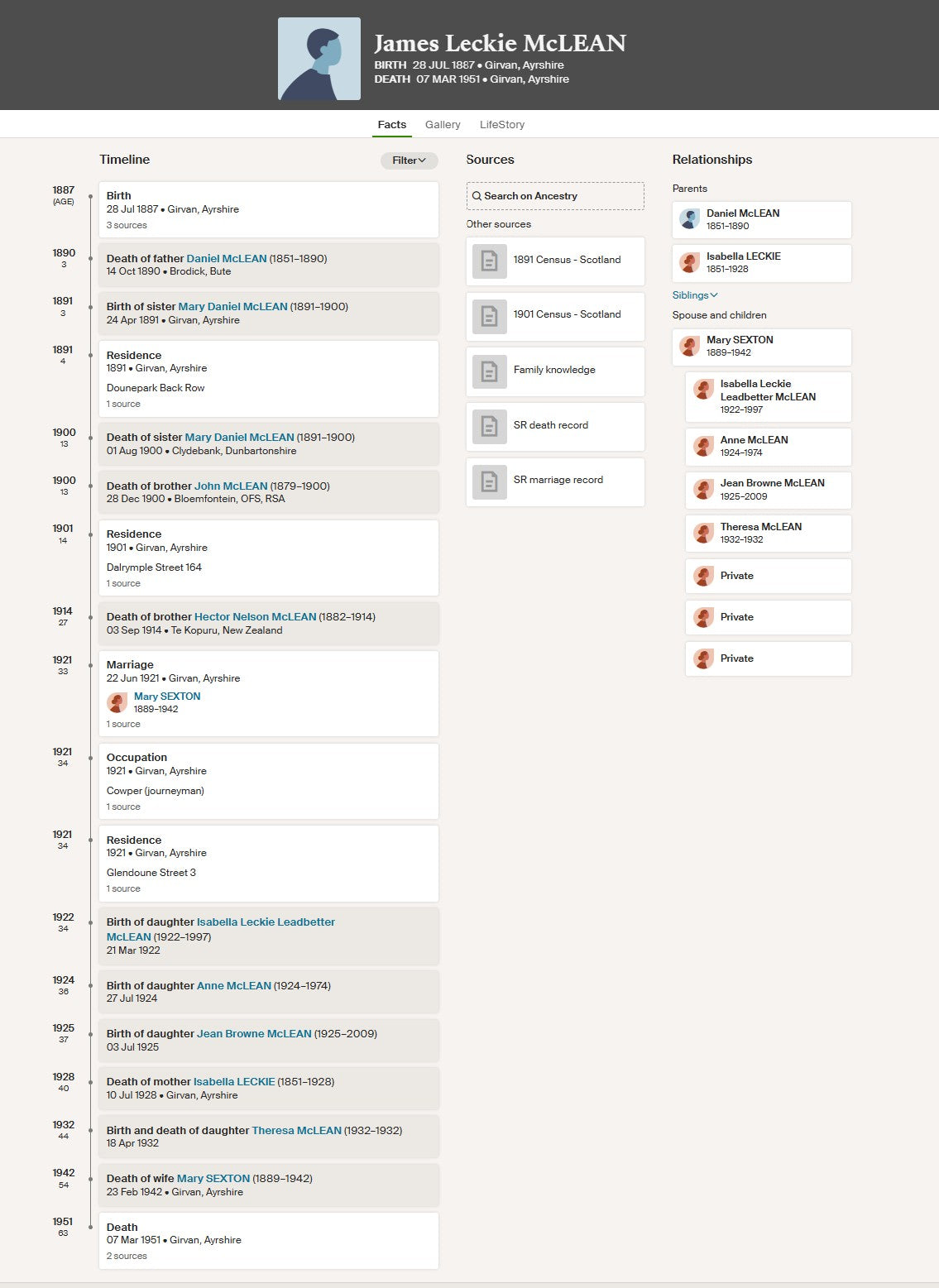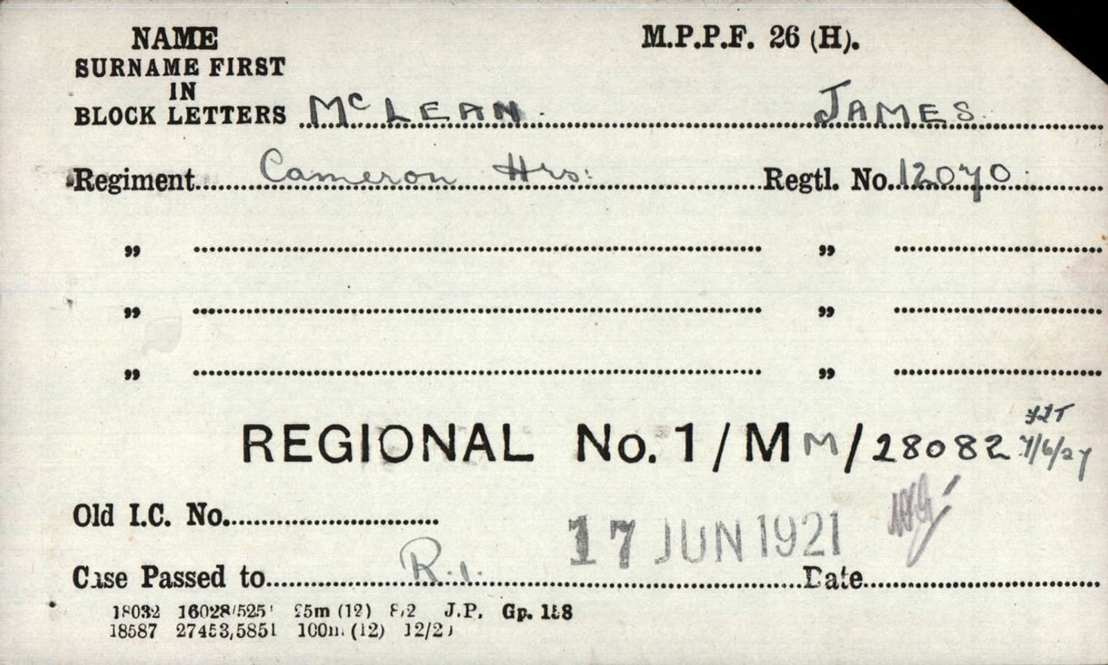 He survived the Great War and returned to civilian life in Girvan. In 1921 he married Mary Sexton, and the couple raised a family in Ayrshire. James Leckie McLean died at Girvan on 7th March 1951, aged 63, his life encompassing skilled civilian work, prior Volunteer service, and active wartime service as a piper of the 6th Battalion, Cameron Highlanders.