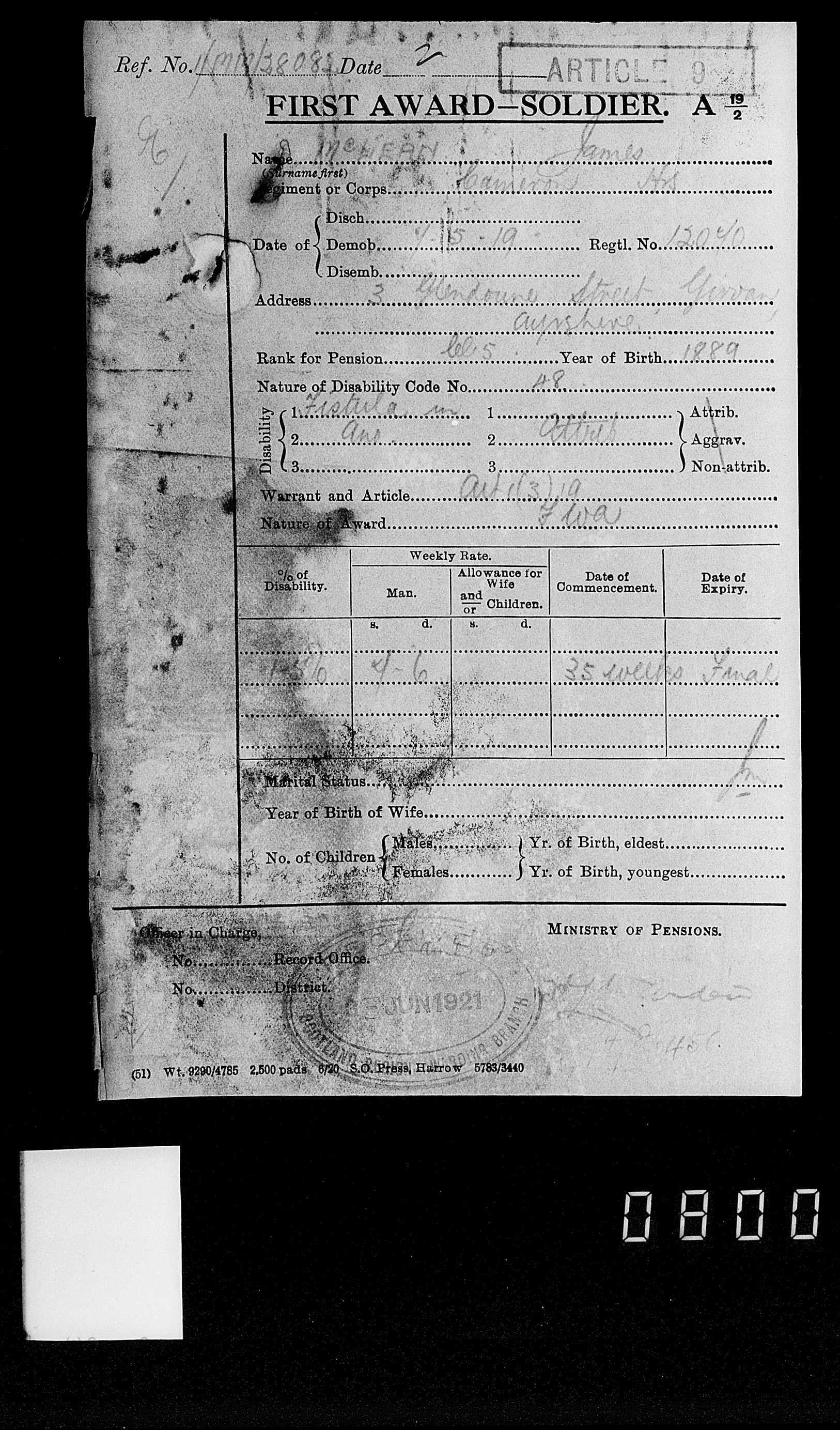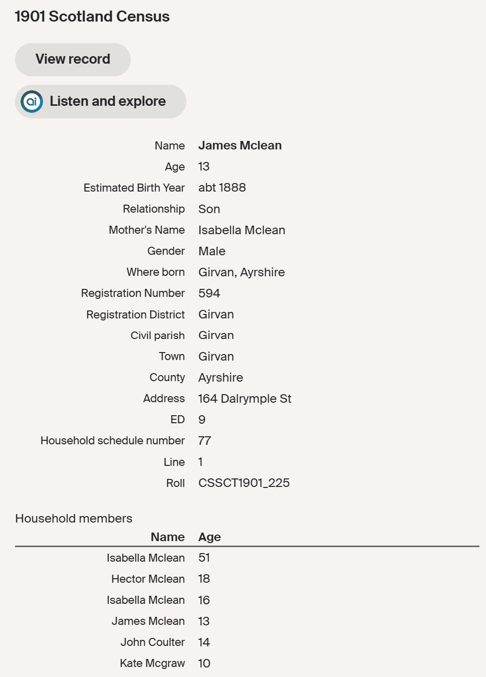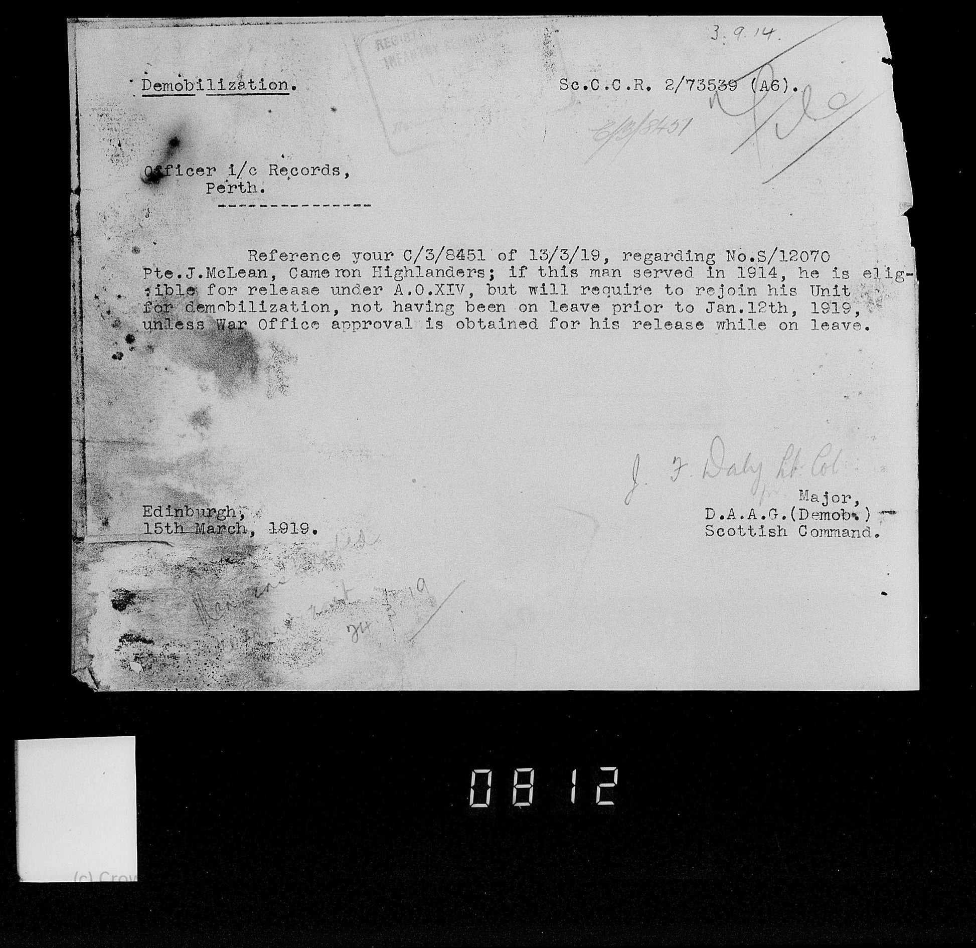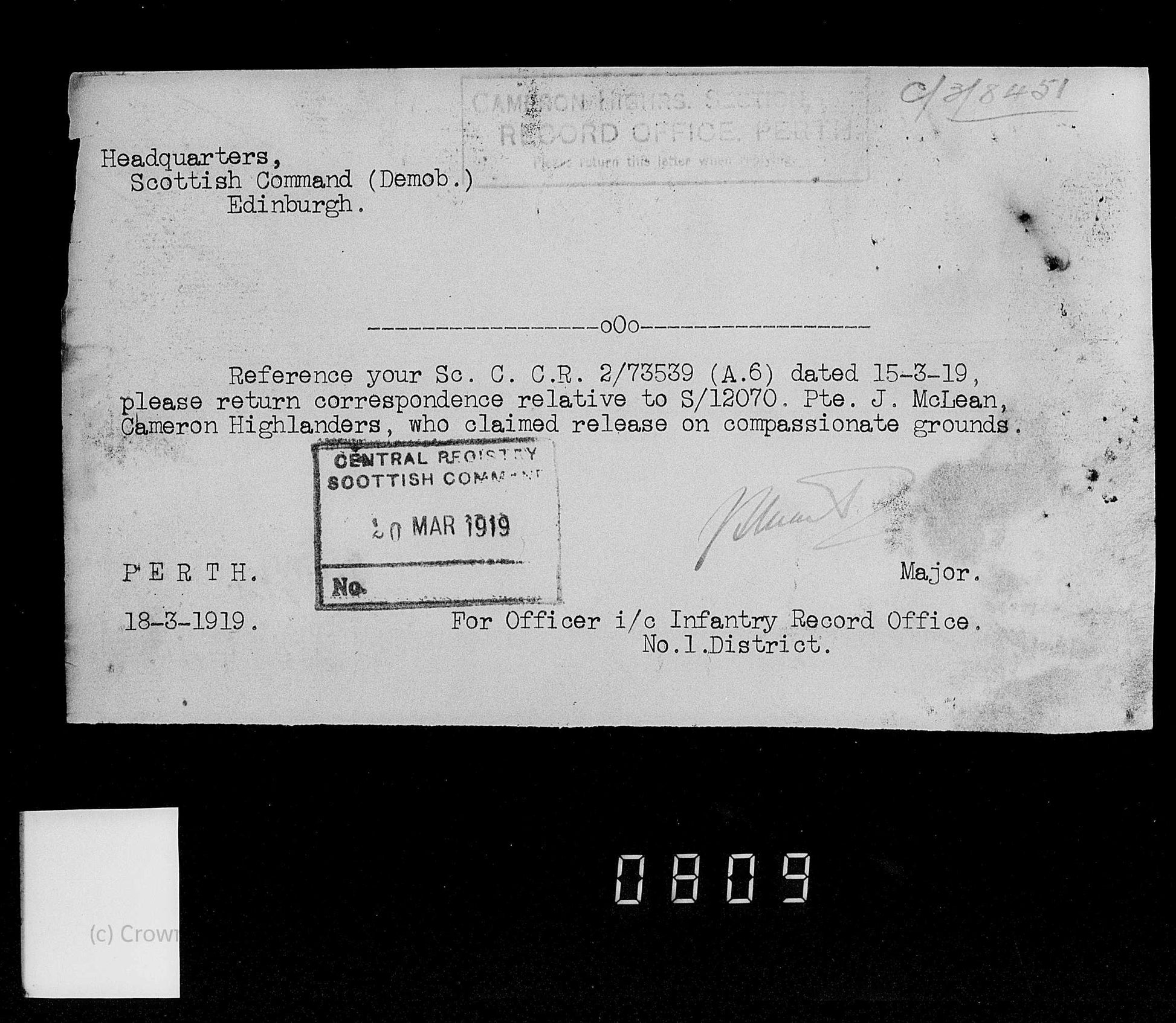 He survived the Great War and returned to civilian life in Girvan. In 1921 he married Mary Sexton, and the couple raised a family in Ayrshire. James Leckie McLean died at Girvan on 7th March 1951, aged 63, his life encompassing skilled civilian work, prior Volunteer service, and active wartime service as a piper of the 6th Battalion, Cameron Highlanders.