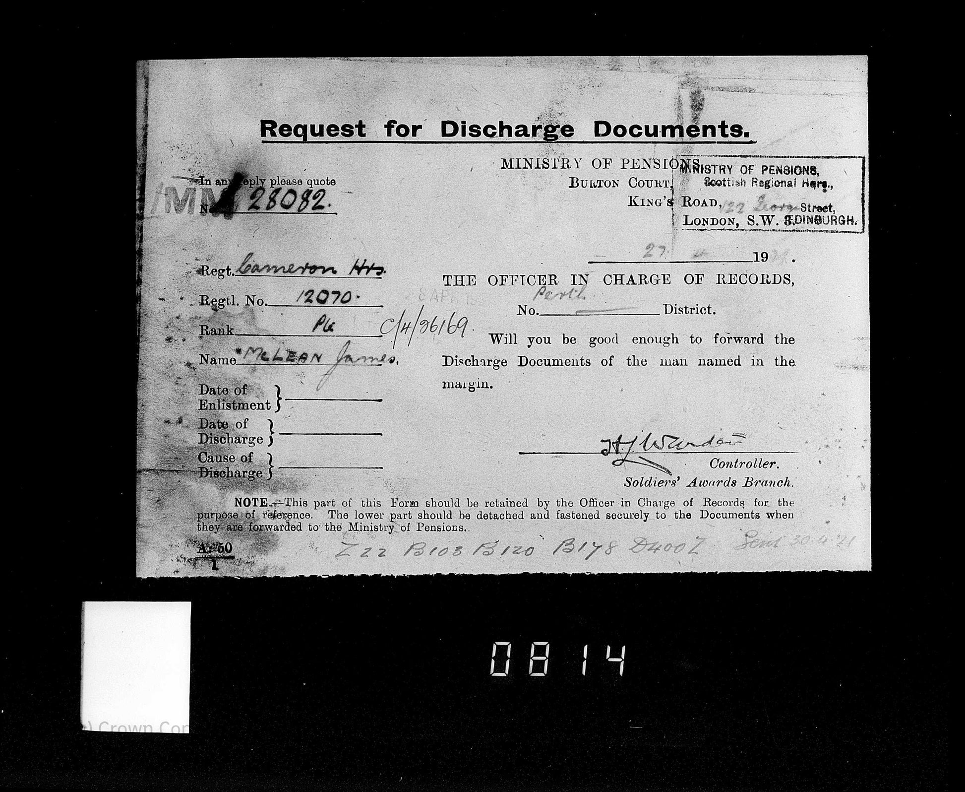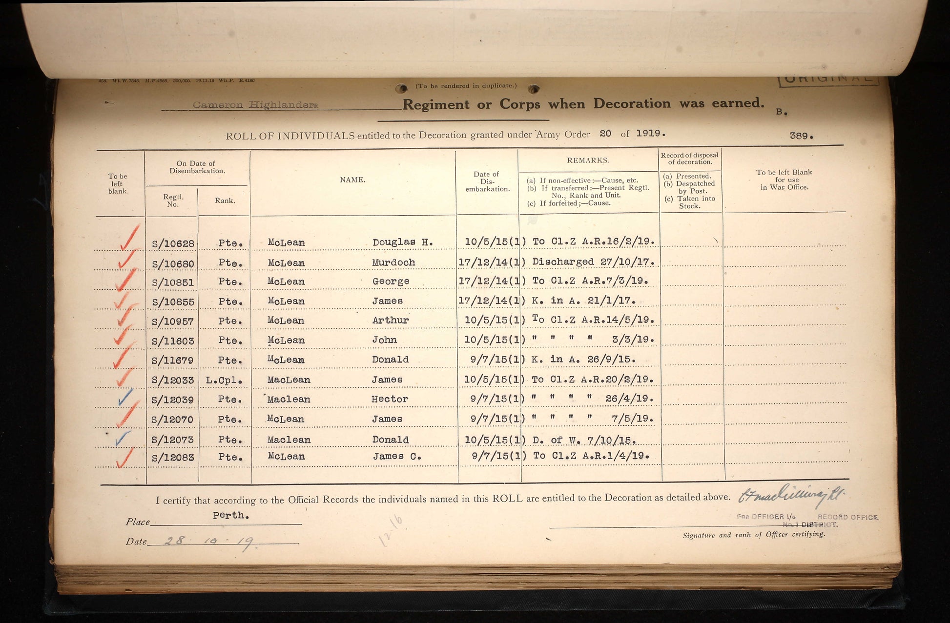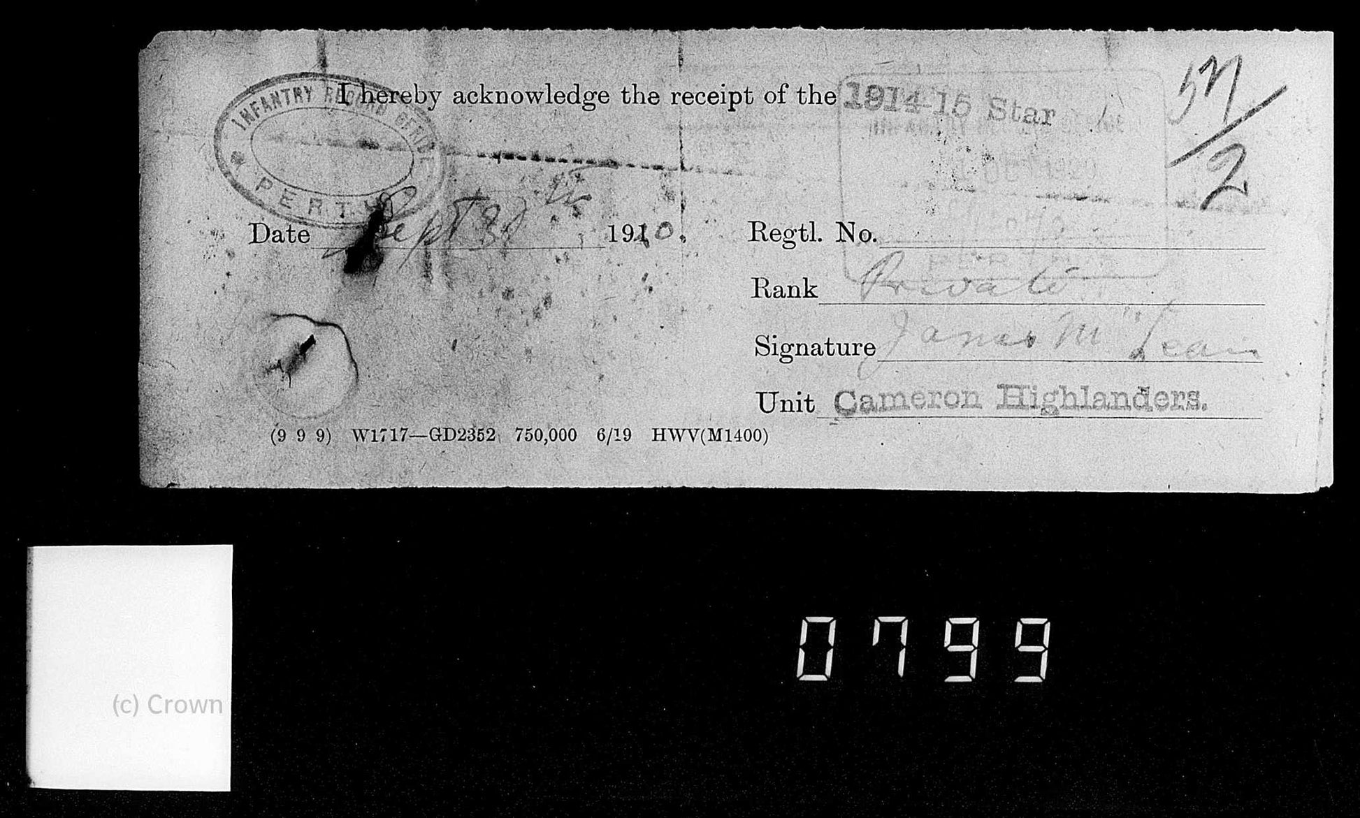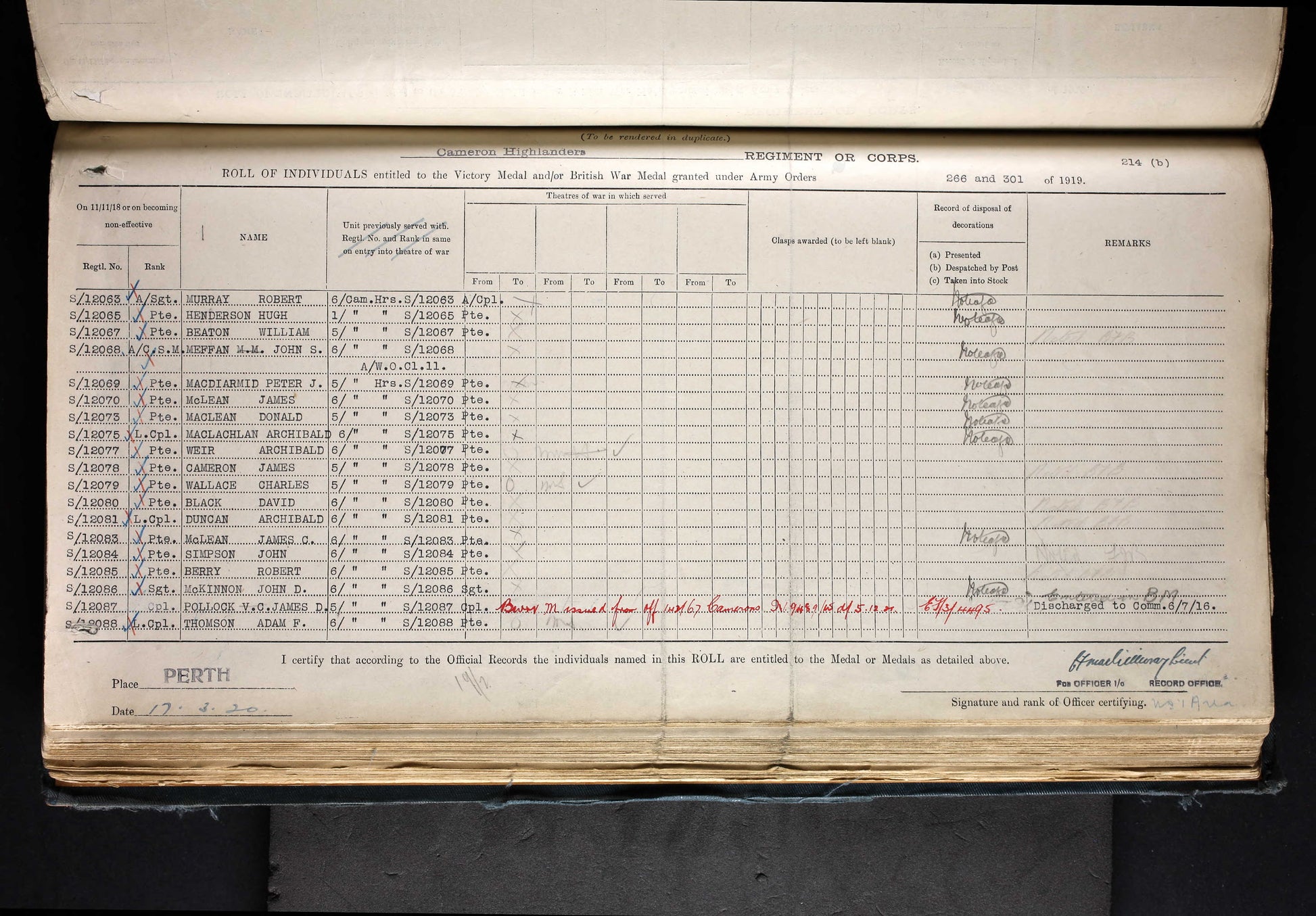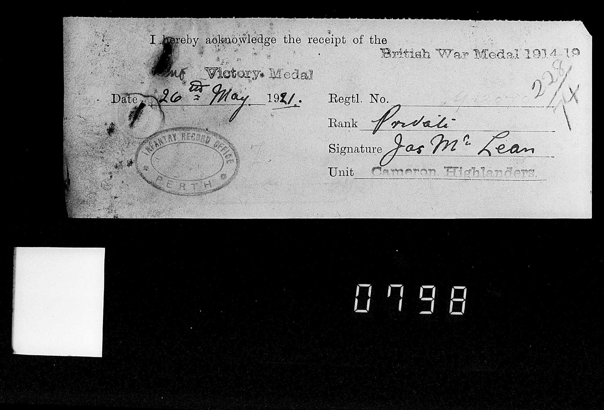 British War Medal – S-12070. PTE. J. MC LEAN. CAM’N. HIGHRS.
