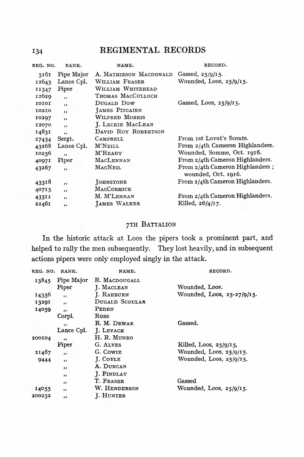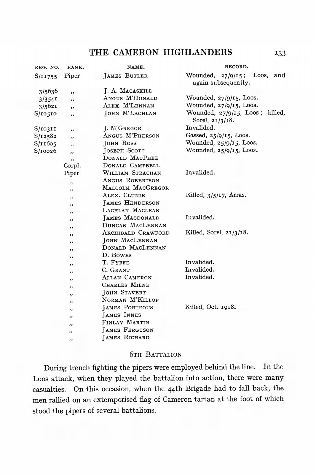 James McLean served with the 6th Battalion, Cameron Highlanders during its active operations on the Western Front, including the fighting at Loos in September 1915. Contemporary regimental accounts record that during trench fighting the pipers were generally employed behind the line, but during the Loos attack they played the battalion into action, suffering heavy casualties as a result. When the 44th Brigade was forced to fall back, the men are recorded as having rallied on an improvised flag of Cameron tartan, at the foot of which stood the pipers of several battalions, underscoring the symbolic and practical importance of the pipers in maintaining cohesion and morale under fire. As a battalion piper, James McLean would have taken part in these actions alongside his fellow pipers of the 6th Camerons.