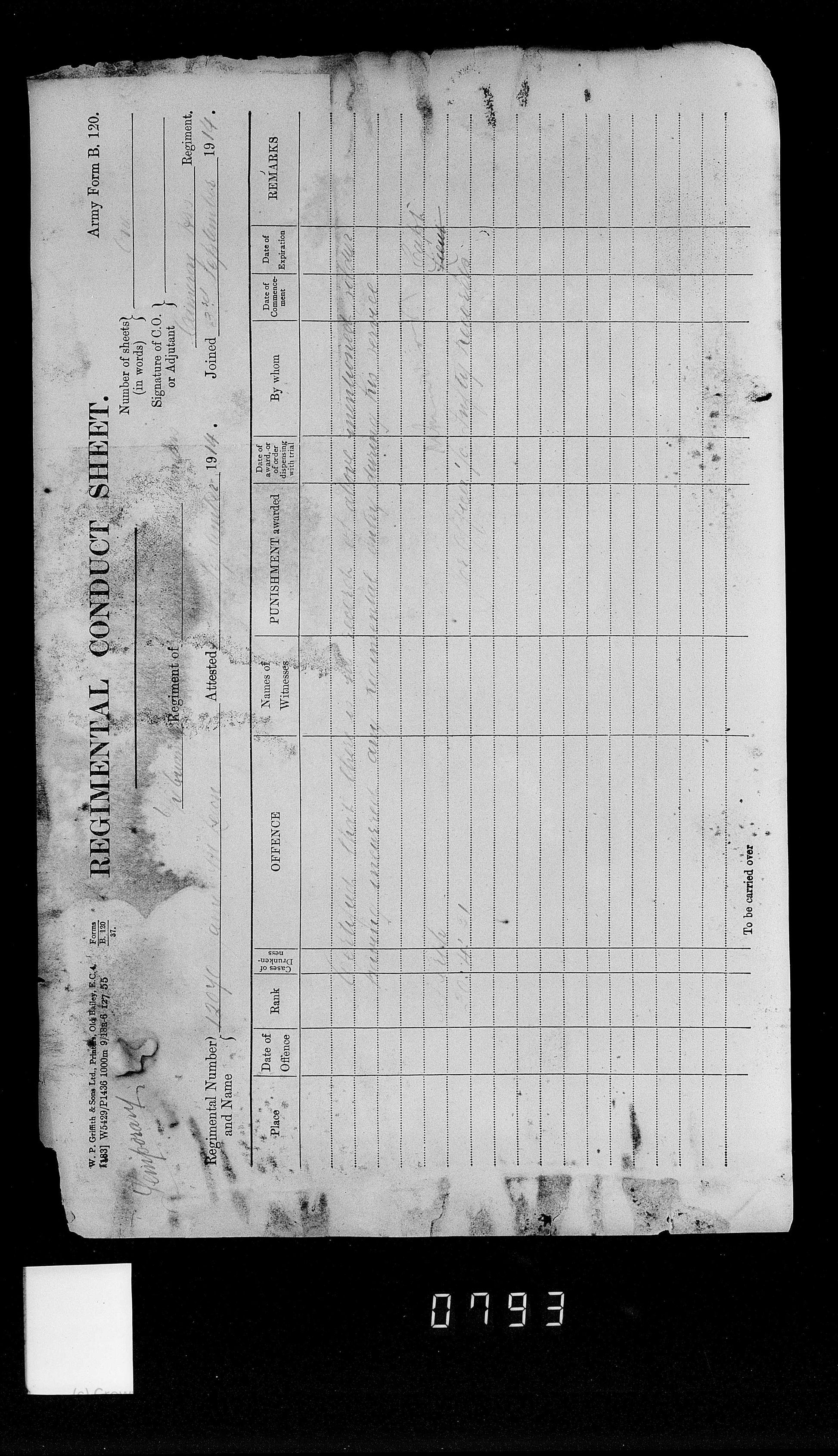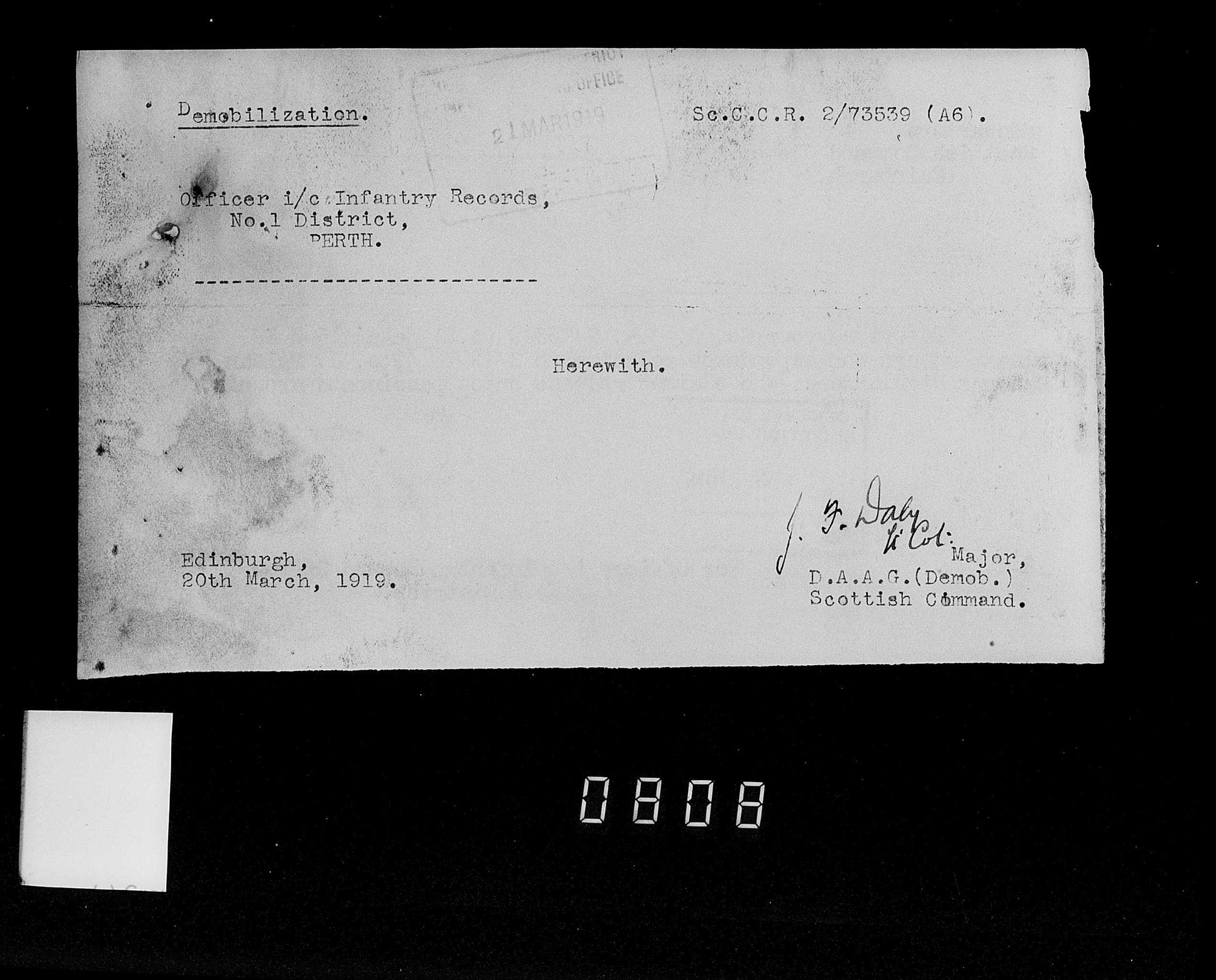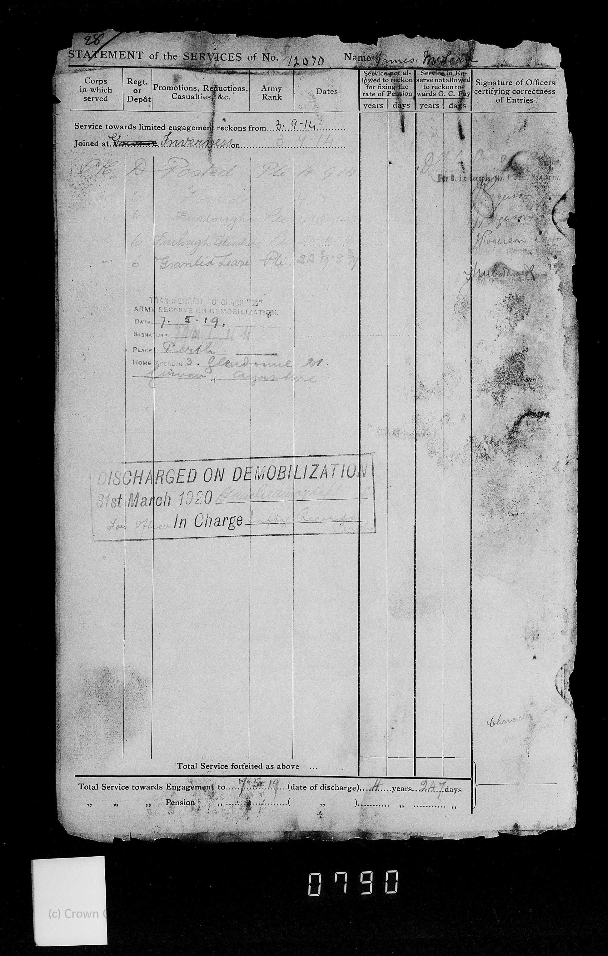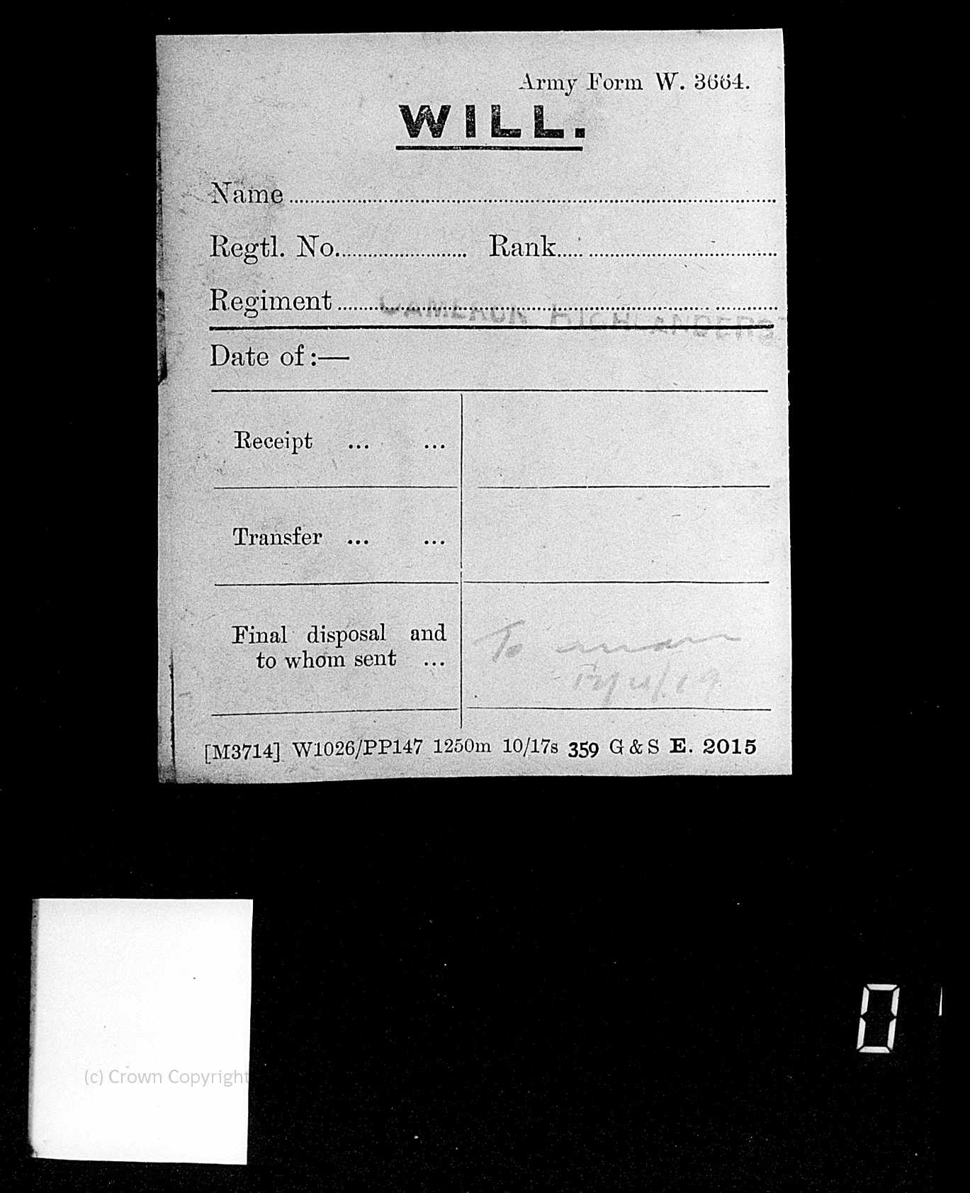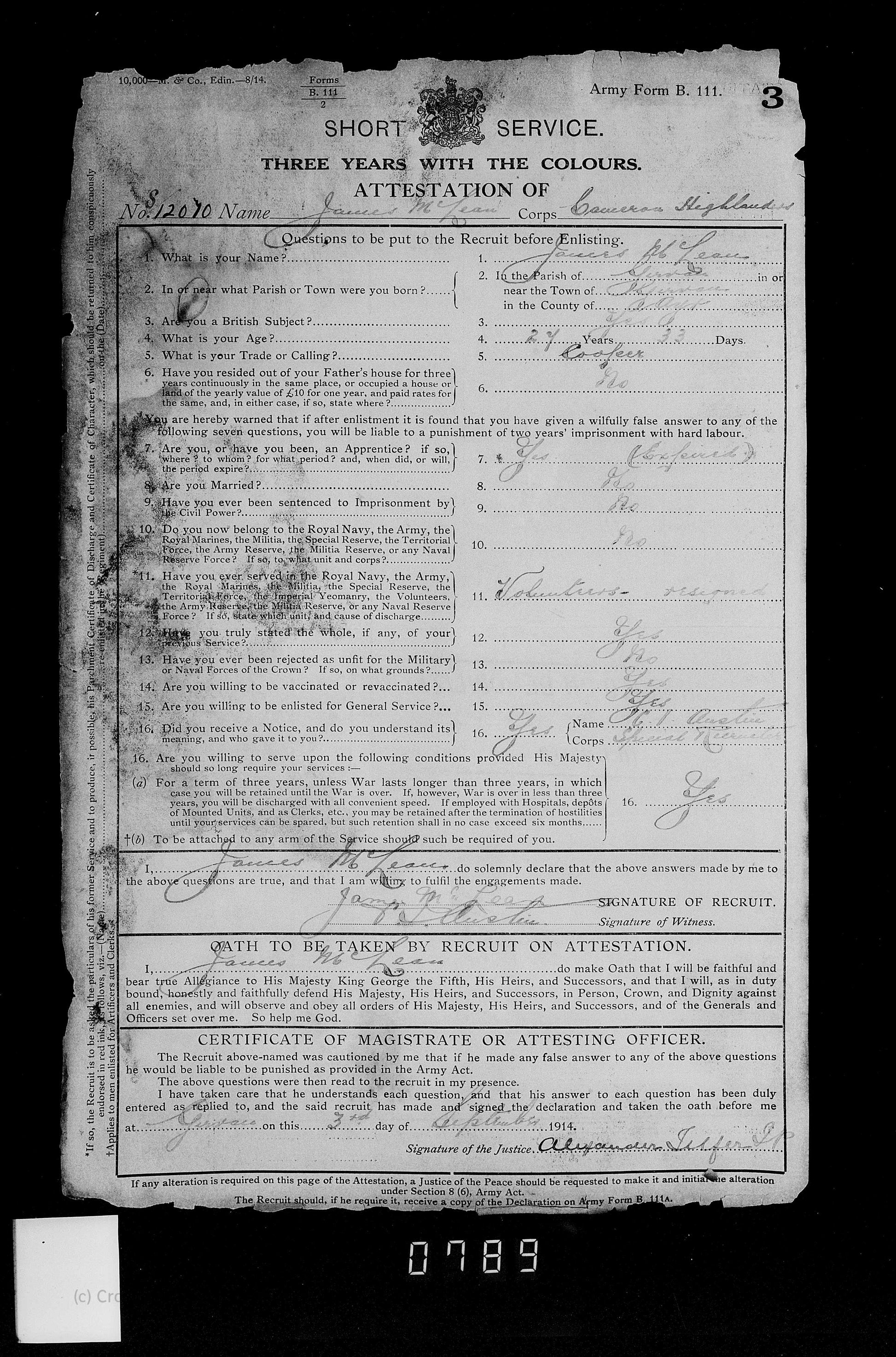 He had previous military experience, having served with the Volunteers, though he later resigned from that force. Following the outbreak of the Great War he enlisted on 3rd September 1914, aged 27, and joined the Cameron Highlanders. He was posted to the 6th Battalion, Cameron Highlanders, a battalion which was mobilised for overseas service. His service record confirms his battalion, and he is specifically recorded as serving as a Piper, a role confirmed by his inclusion in the book Pipes of War.