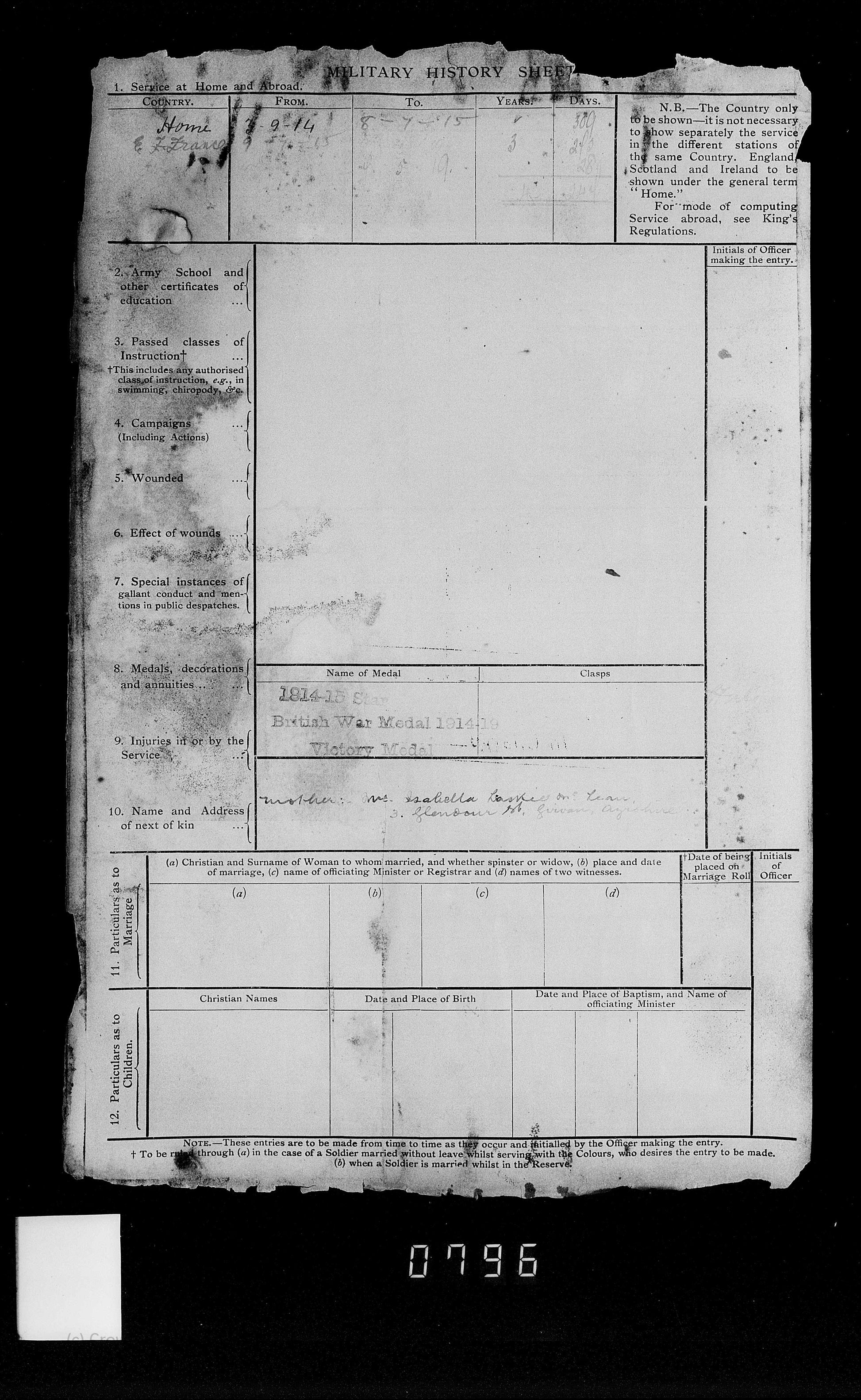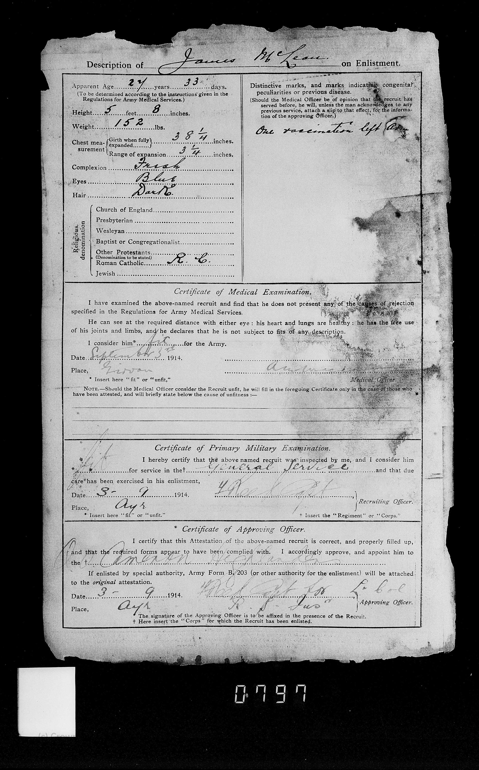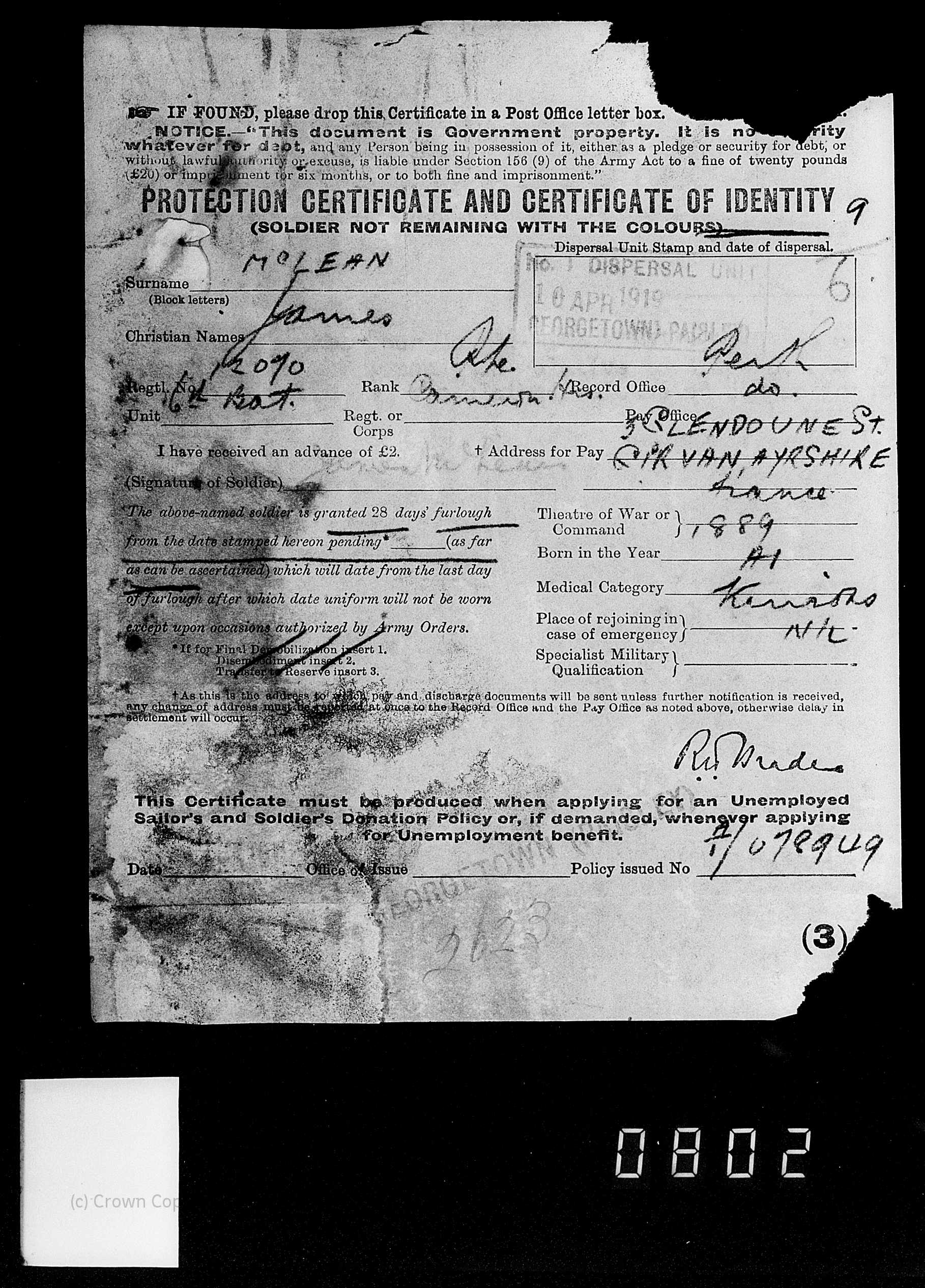 James Leckie McLean was born on 28th July 1887 at Girvan, Ayrshire, and was the son of Daniel McLean, who died in 1890, and his wife Isabella Leckie. He was brought up in Girvan and appears in the 1901 Census residing with his widowed mother at 164 Dalrymple Street, Girvan. In later life he continued to live in the town, his address being recorded as 3 Glendoune Street, Girvan. By trade he was employed as a cooper, a skilled occupation which he followed prior to his enlistment.