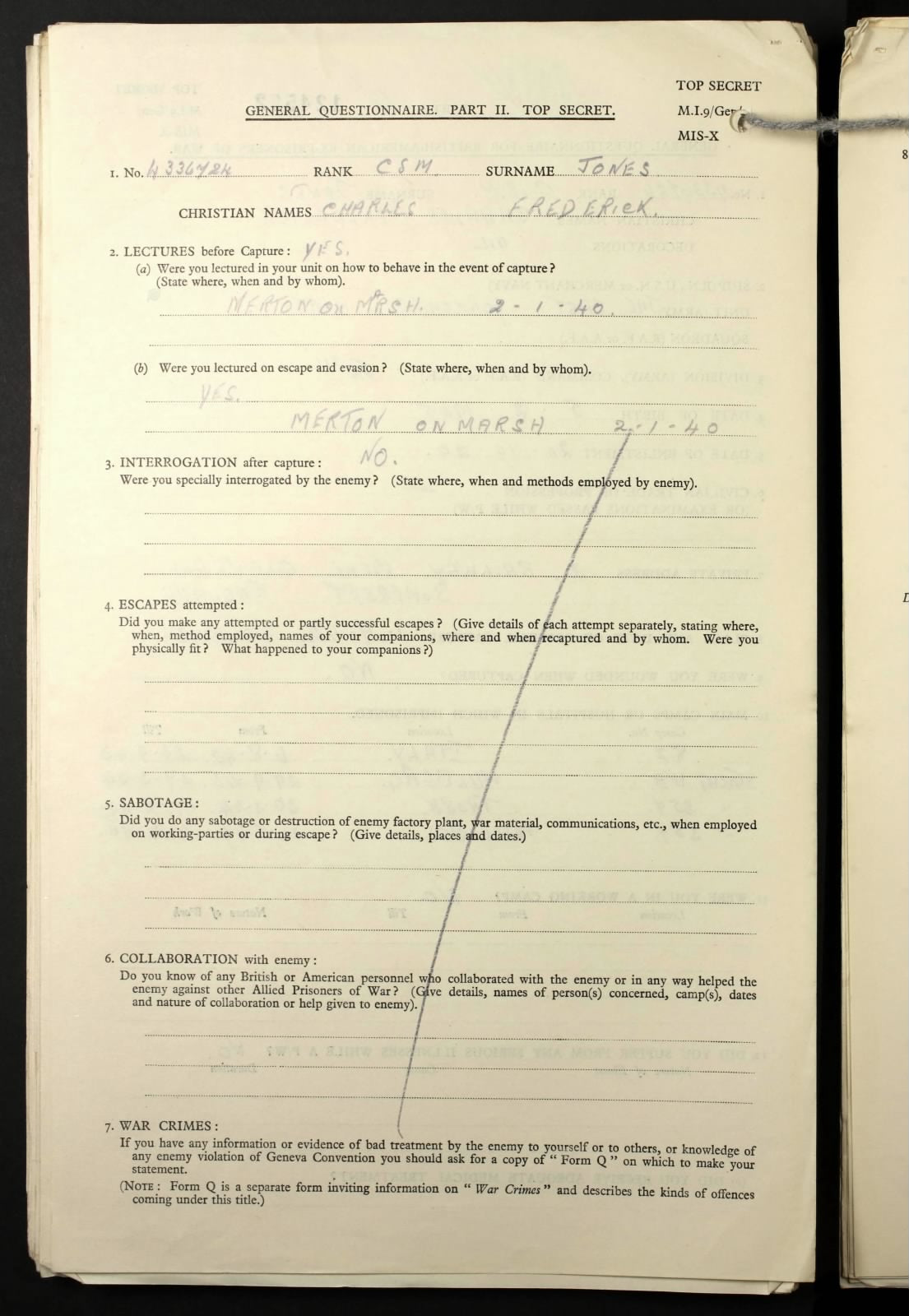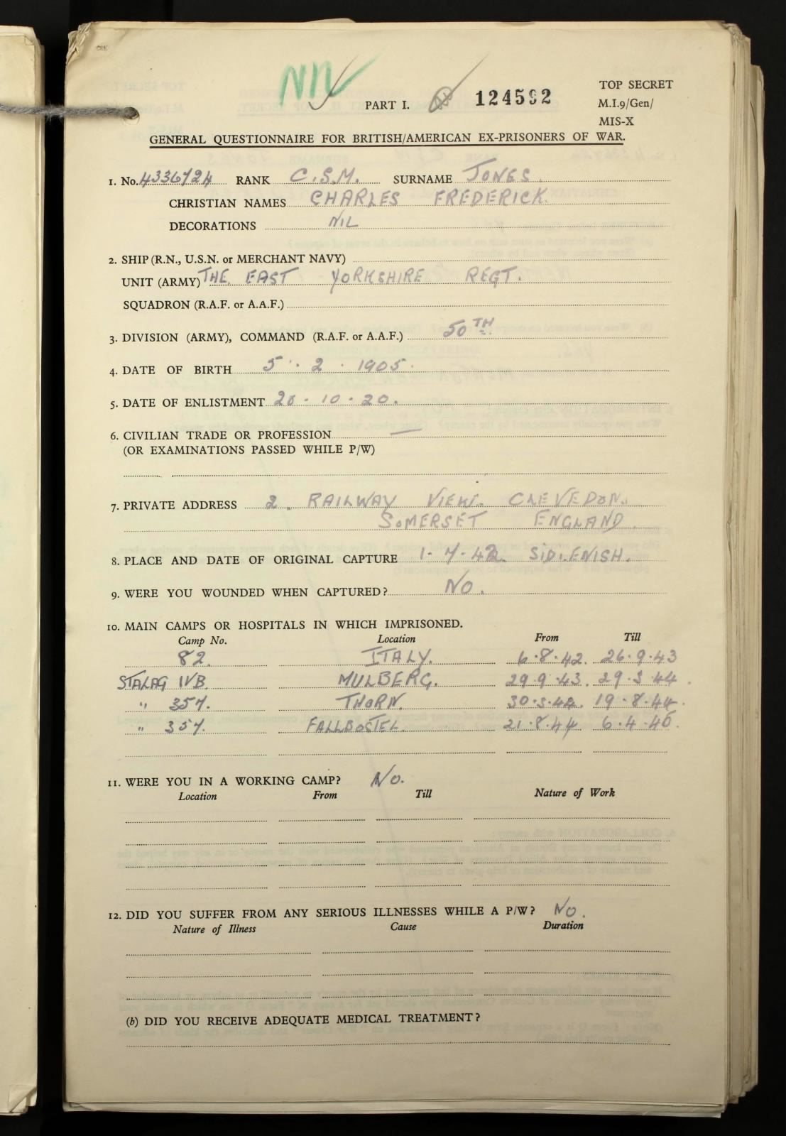 Initially held in Italy, Jones was interned at Military Hospital 202, Lucca, under postal mark 3200, from August 1942 to September 1943. Following the Italian Armistice, he was transferred north by the Germans and held successively at Stalag IVB Mühlberg, Stalag XXA Thorn (Poland), and finally Stalag 357 Fallingbostel, Lower Saxony — one of the main transit and holding camps for senior NCOs. His MI9 liberation questionnaire, signed 5 March 1945, confirms that he was not wounded when captured, made no escape attempts, and received adequate medical treatment while in captivity. His address on repatriation was given as 2 Railway View, Clevedon, Somerset.