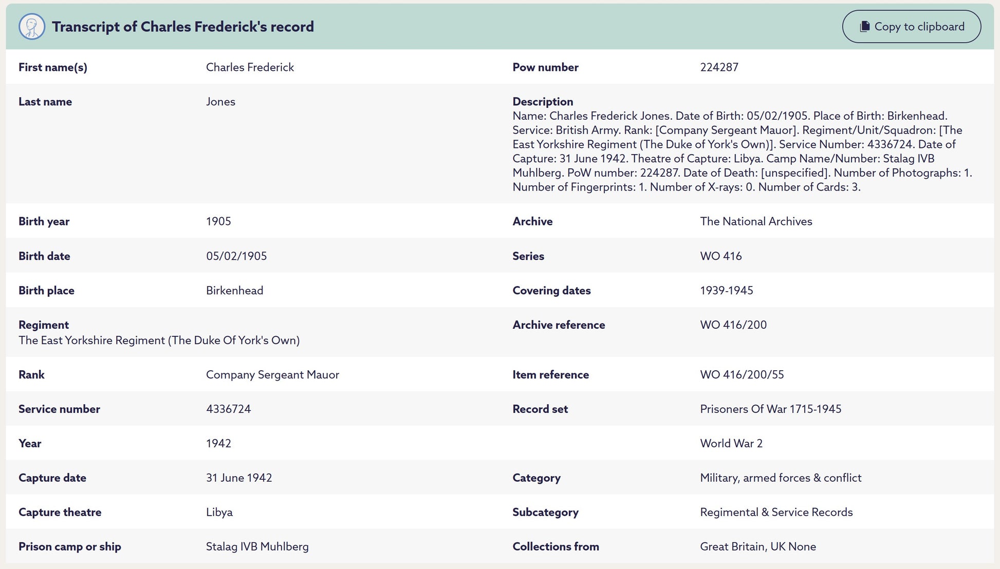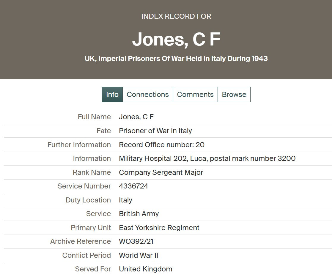 After nearly three years as a prisoner of war in both Italy and Germany, Jones was finally liberated in April 1945, being officially recorded as “no longer a Prisoner of War” on the War Office Casualty List of 7 June 1945.
